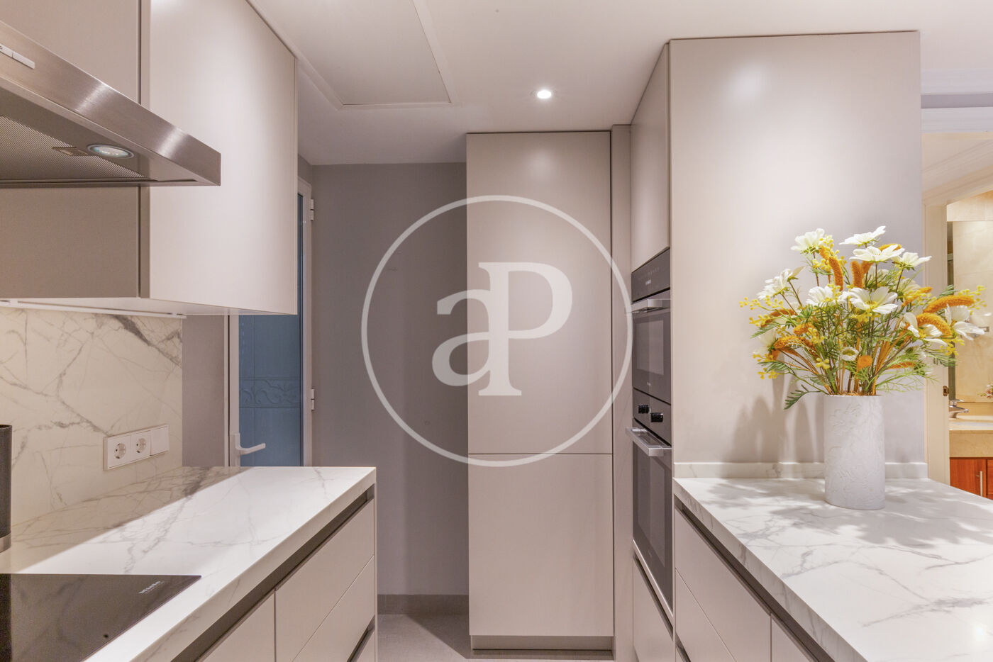 Continuant el nostre recorregut, trobem una cuina lluminosa completament equipada amb els electrodomèstics més moderns, incloent-hi una nevera àmplia, forn elèctric, parament de cuina de disseny exquisit i rentavaixelles.