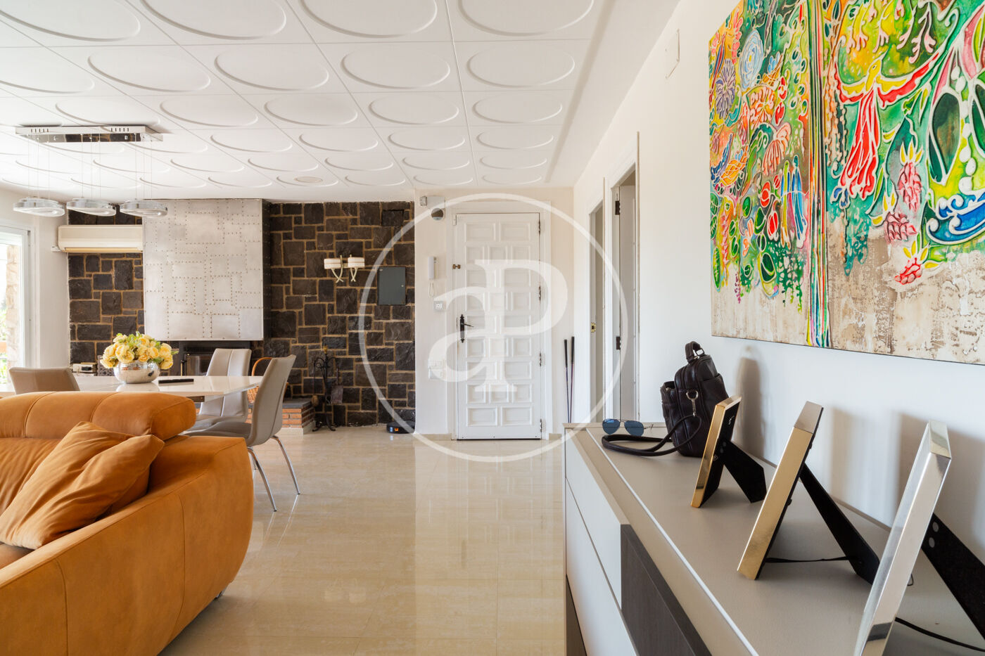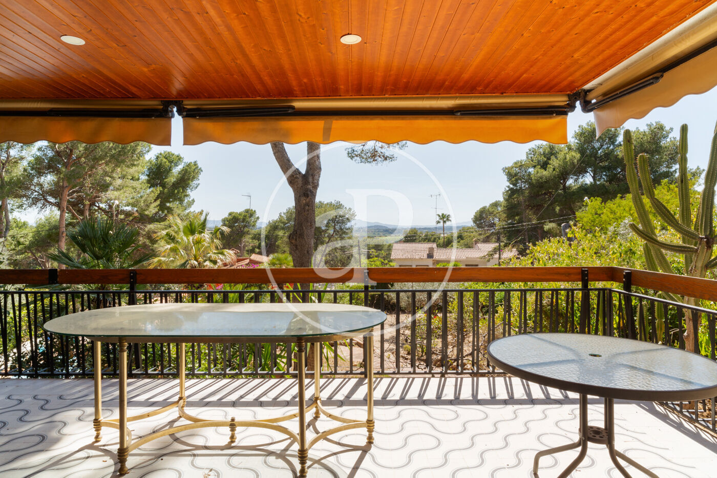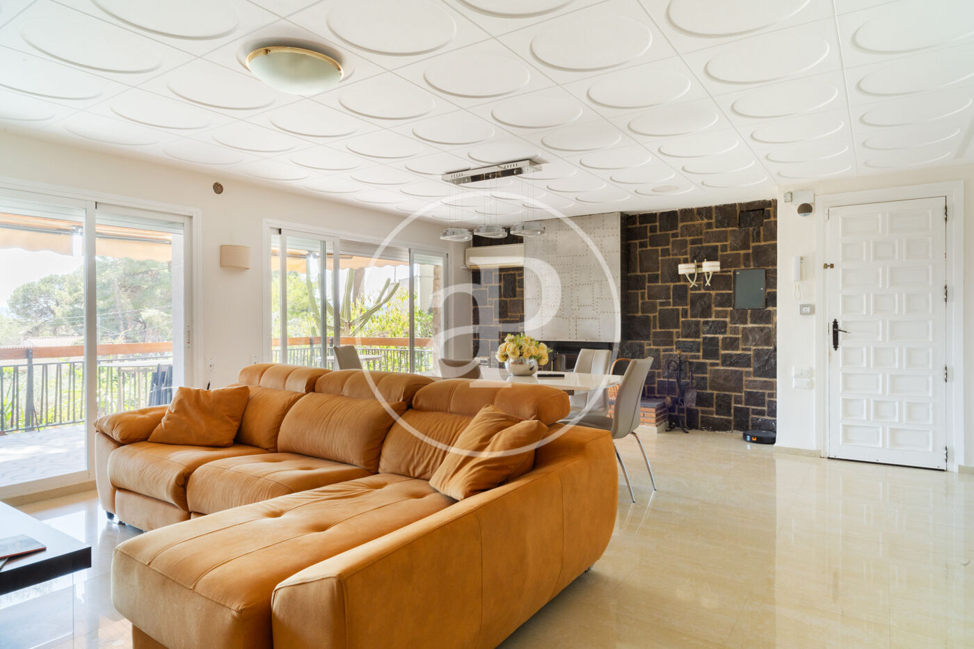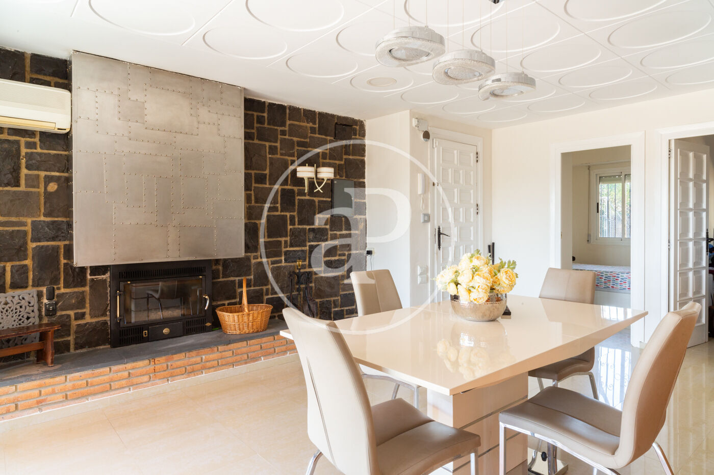 Esta vivienda de inmejorable ubicación está construida sobre una maravillosa parcela de orientación perfecta. La vivienda está muy cuidada y en muy buen estado. Al entrar nos encontramos con un salón diáfano con grandes ventanales de suelo a techo que dan salida directa a una gran terraza cubierta, con techo de madera, toldos y espectaculares vistas, dispone de una chimenea muy especial construida sobre una pared forrada en piedra natural que aporta carácter y personalidad a este espacio realmente acogedor, zona de relax y comedor conviven, cabe destacar la generosa luz que tiene este espacio.