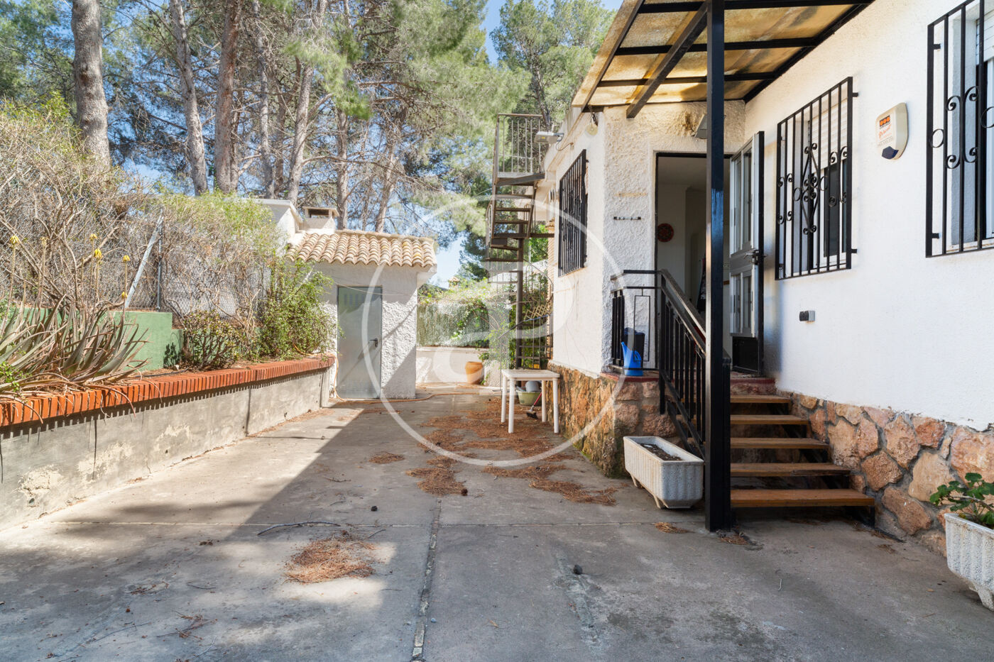 Paellero, ducha exterior, piscina, baño exterior para dar servicio a esta zona y garaje cubierto.