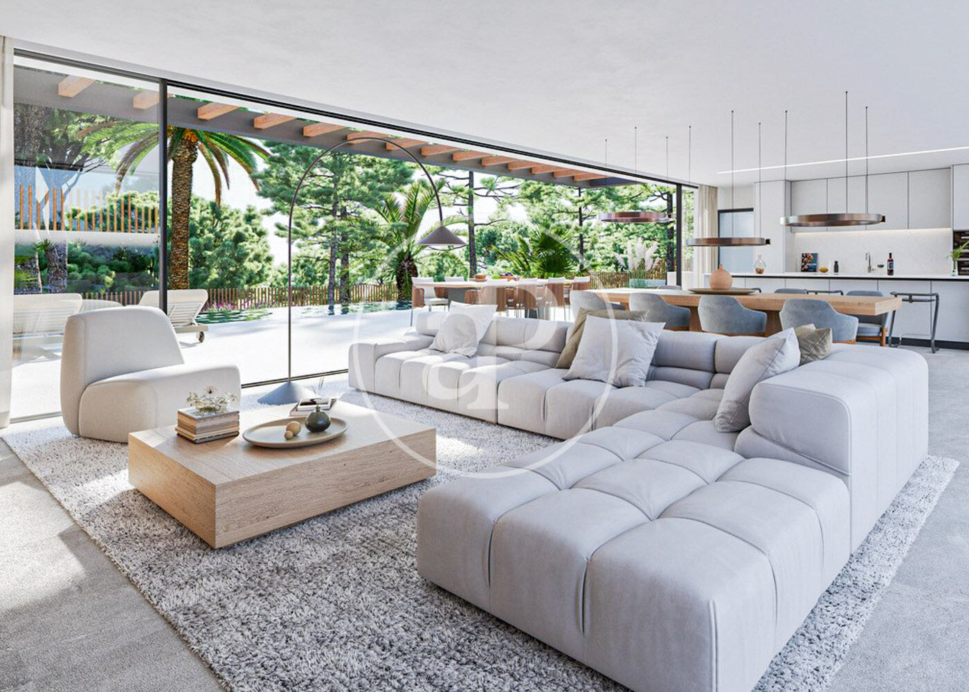 Estamos comprometidos con la excelencia en cada detalle. Utilizamos suelos naturales sin juntas de la renombrada empresa Senso, piedras naturales como elementos decorativos de pared y ventanas de marco mínimo. El diseño de la villa permite que los frentes de las ventanas del salón y el comedor se empotren completamente en la pared, creando una fusión perfecta entre el interior y el exterior, donde la sala de estar se convierte en un solo elemento con la terraza y la piscina.