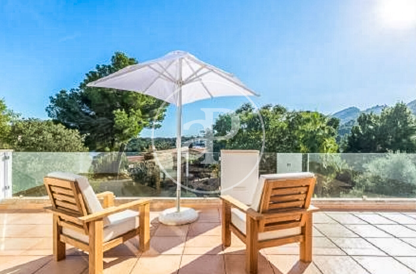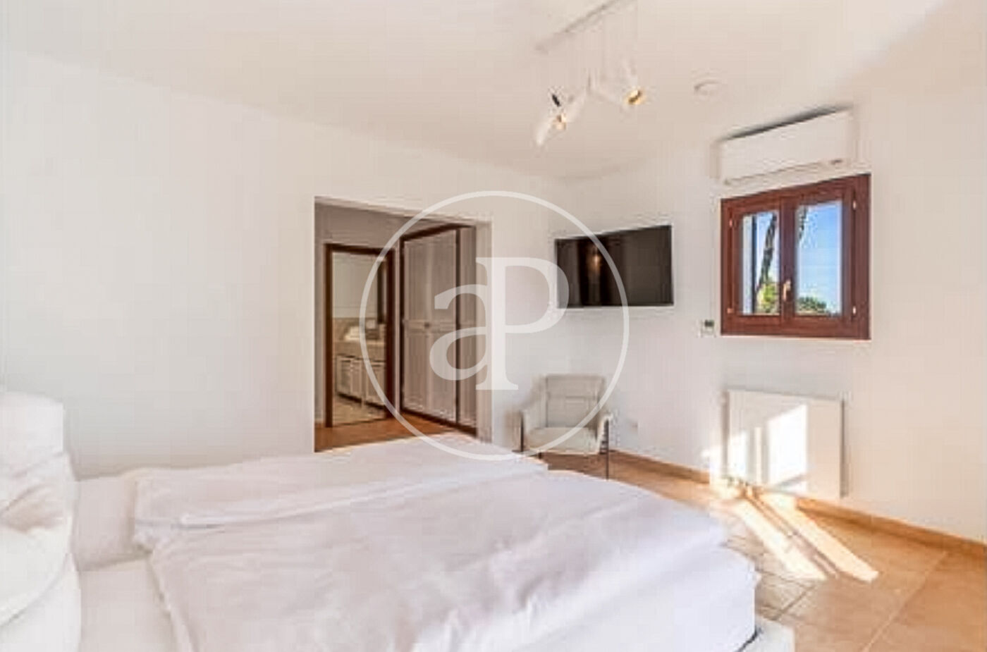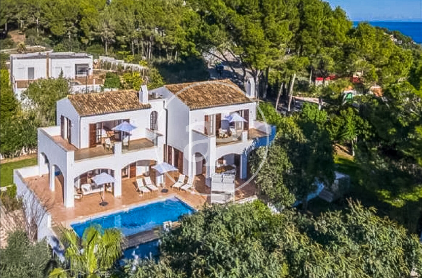 Estupenda villa modernista con vistas panorámicas y licencia vacacional en la exclusiva zona de Cala Provencals. Se encuentra muy cerca de la playa con vistas inmejorables al mar y a las montañas.