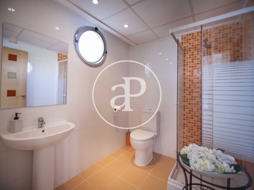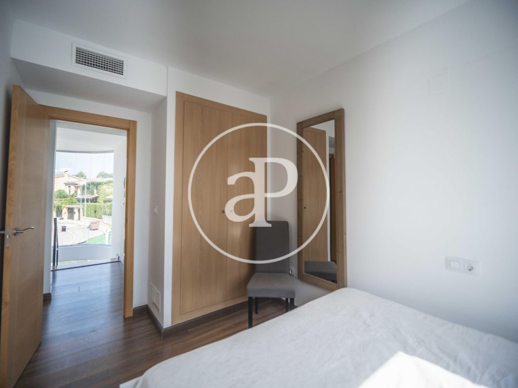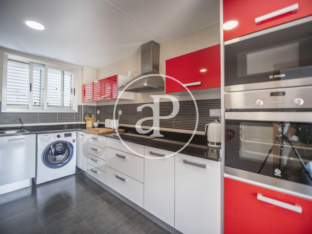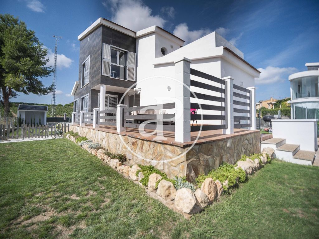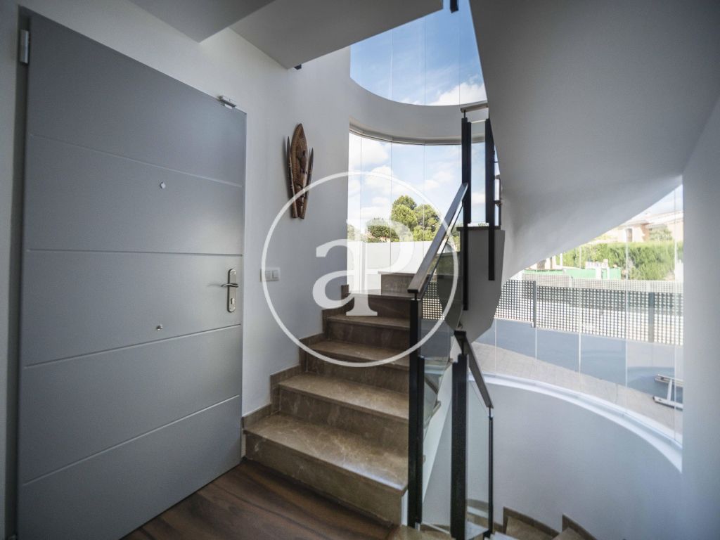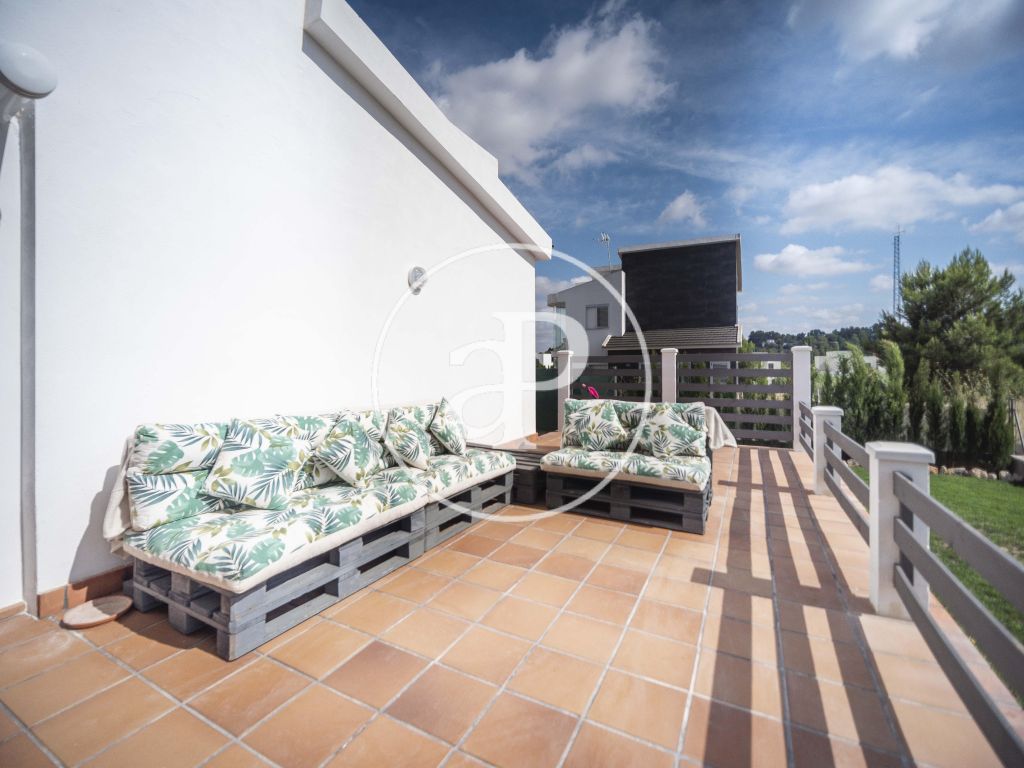 El acceso al chalet directo desde la misma calle da paso al jardín, desde la entrada pasamos a su salón comedor, cocina independiente moderna totalmente equipada y desde la que accedemos a una gran terraza, con una habitación que puede hacer las veces de sala multiusos, también consta de un baño de servicio con ducha. Cuatro habitaciones con baño en suite en dos de ellas y otro baño en pasillo, en la parte alta encontramos otro dormitorio y un balcón / terraza, bajando a un sótano accedemos a un amplio garaje con capacidad para varios vehículos, también consta de baño completo en esta planta.