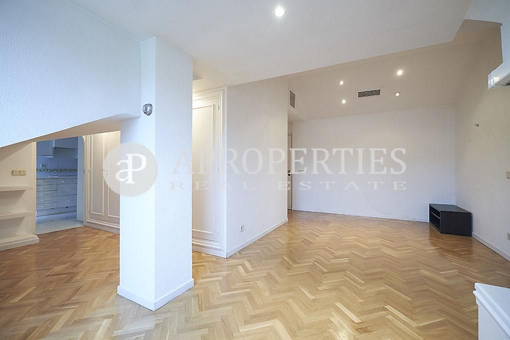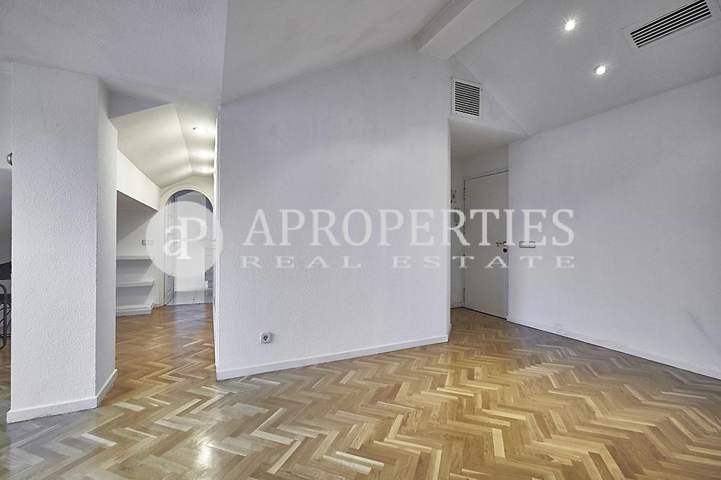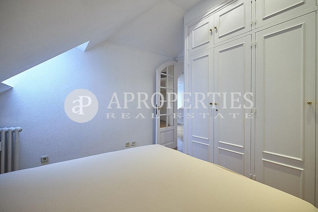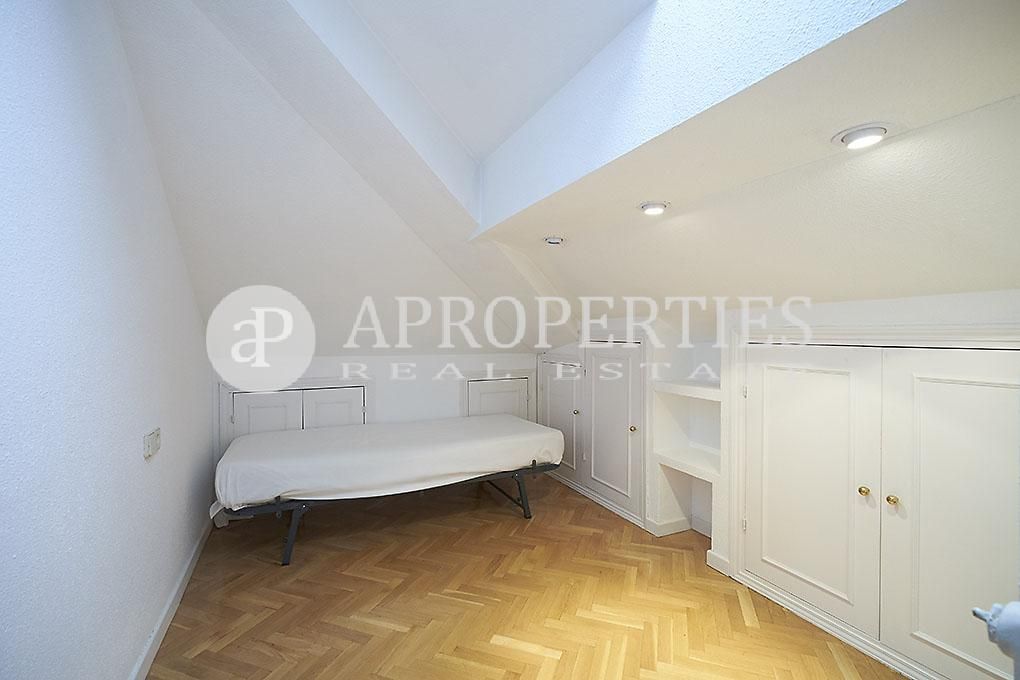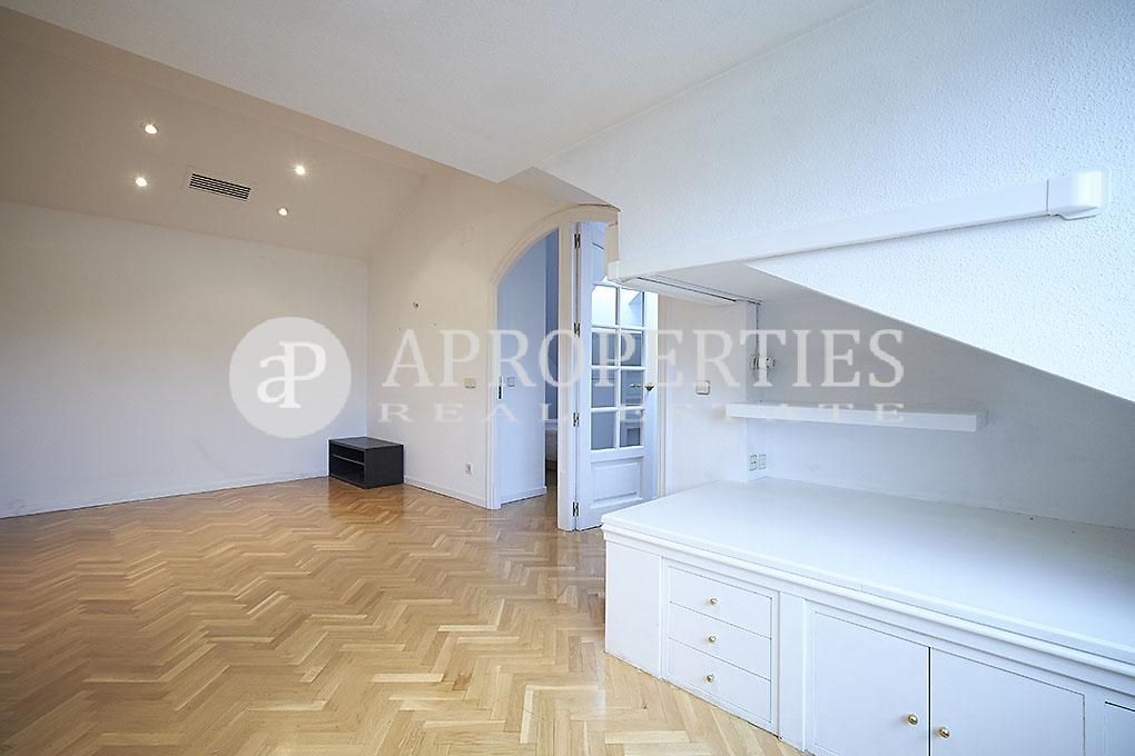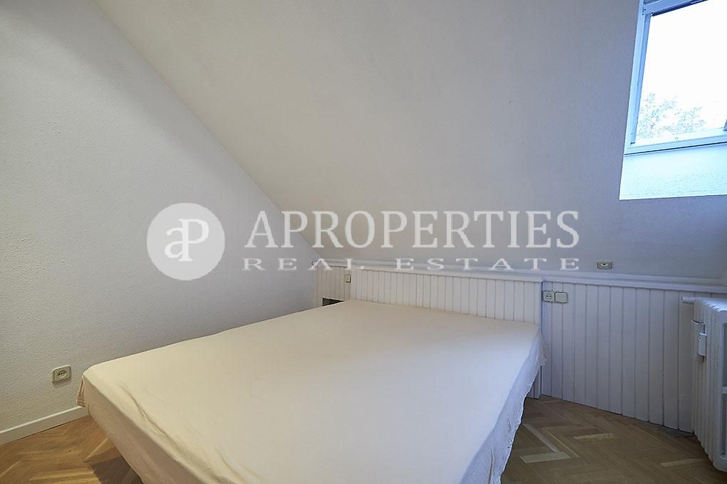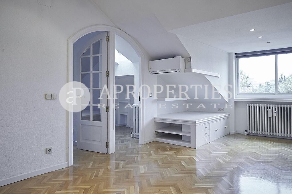 Ubicado en la zona residencial de Arturo Soria, con una excelente comunicación y salida a la M-30, se encuentra esta fantástica propiedad, completamente exterior. El piso se compone de un salón que da paso a través de un pasillo a la cocina y a un cuarto de baño, de fácil reforma para convertirlo en baño y aseo. La cocina incluye frigorífico, lavadora y cuenta con office y zona de despensa. La zona de noche posee dos dormitorios con armarios empotrados. Cabe destacar que el salón y los dormitorios tienen una parte abuhardillada. La vivienda tiene aire acondicionado, calefacción central y suelos de parquet. La finca tiene conserje de lunes a sábado, zonas ajardinadas y piscina.El precio incluye una plaza de garaje.