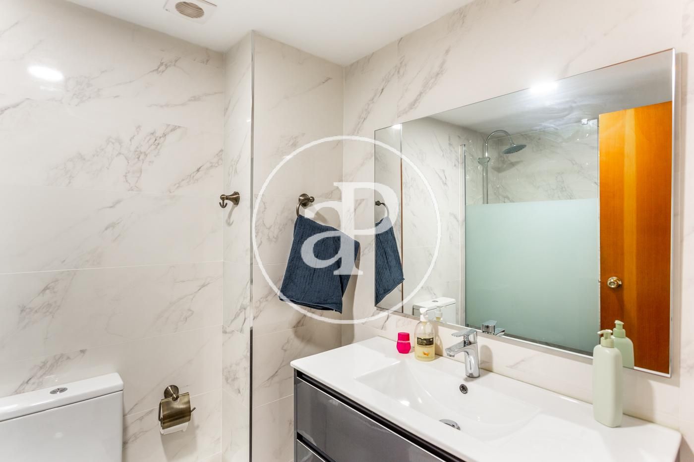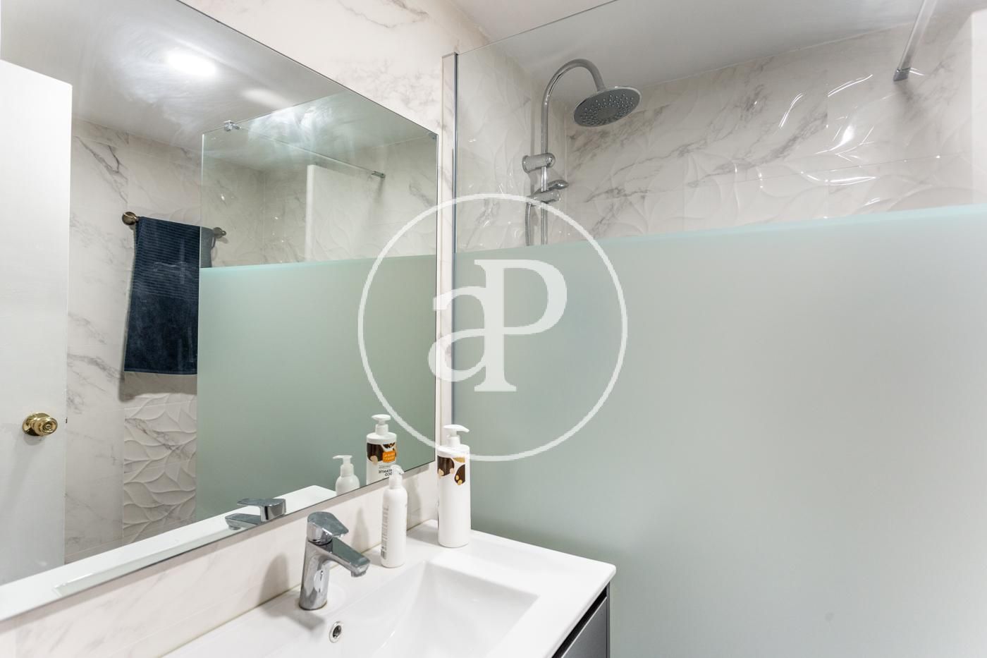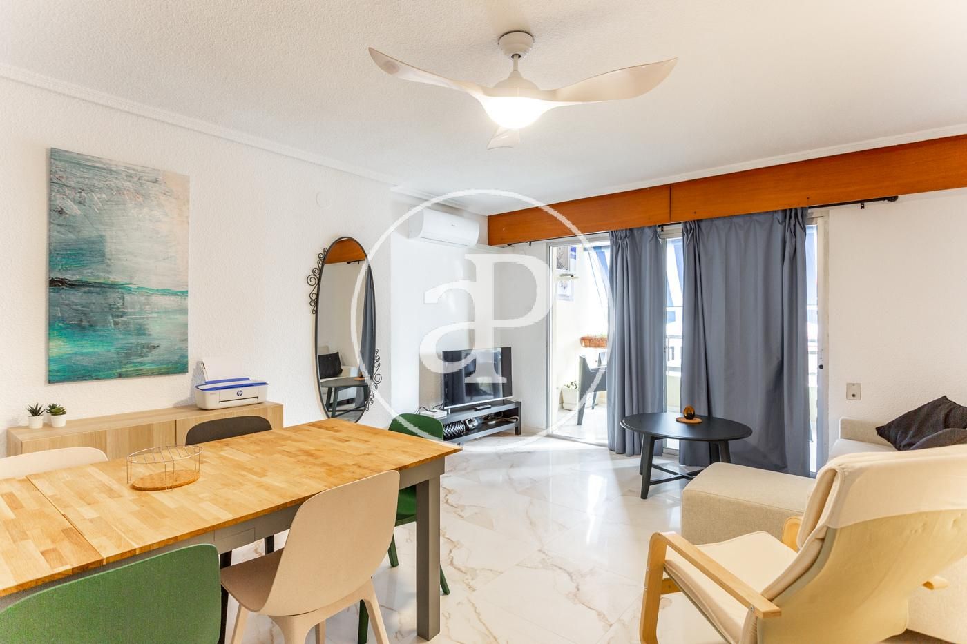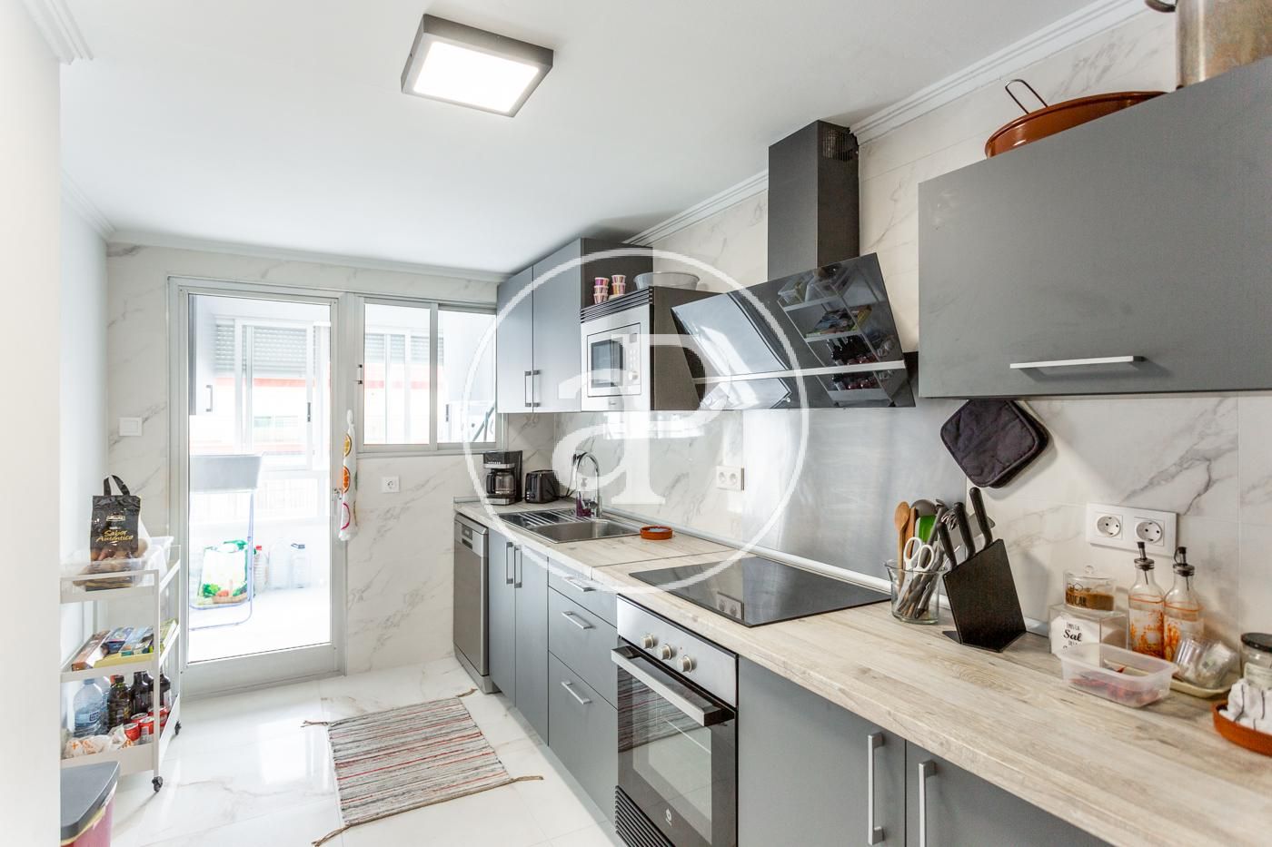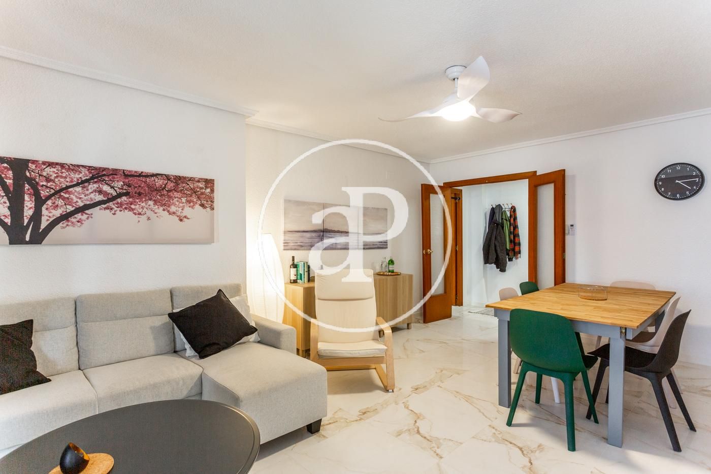El piso cuenta con ventiladores de techo, suelos de mármol, toldos nuevos, armarios empotrados, cámara de seguridad, puerta blindada, etc.