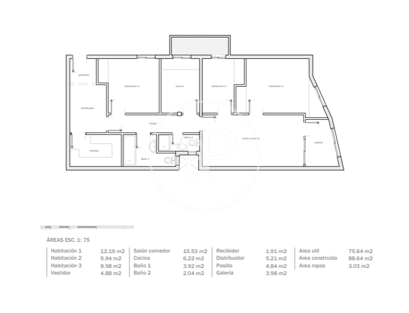 Die Immobilie hat 3 Zimmer, 2 Bäder, Einbauschränke, Waschküche und Heizung.