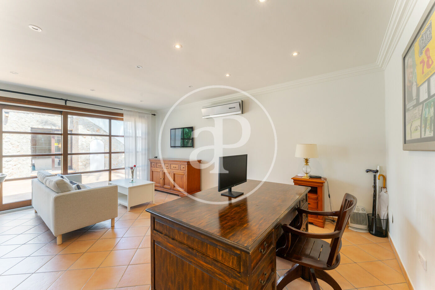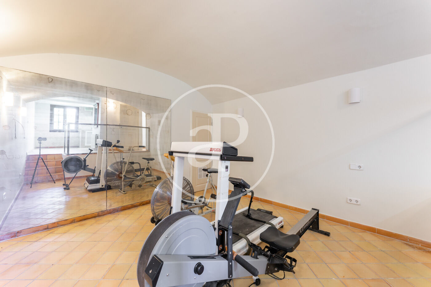 Im Erdgeschoss erhält das Haus einen einzigartigen Charakter mit gewölbten Decken und einer warmen Weinkelleratmosphäre, die derzeit als voll ausgestatteter privater Fitnessraum genutzt wird. Eine separate Wohnung auf dem Grundstück bietet zusätzliche Flexibilität, ideal für die Unterbringung von Gästen, der Großfamilie oder des Personals.