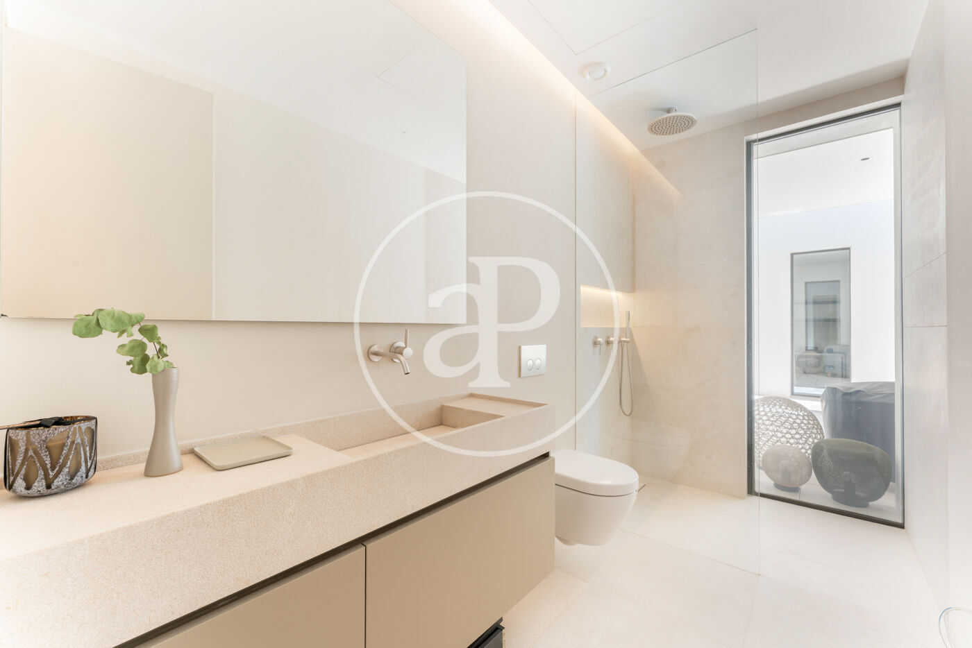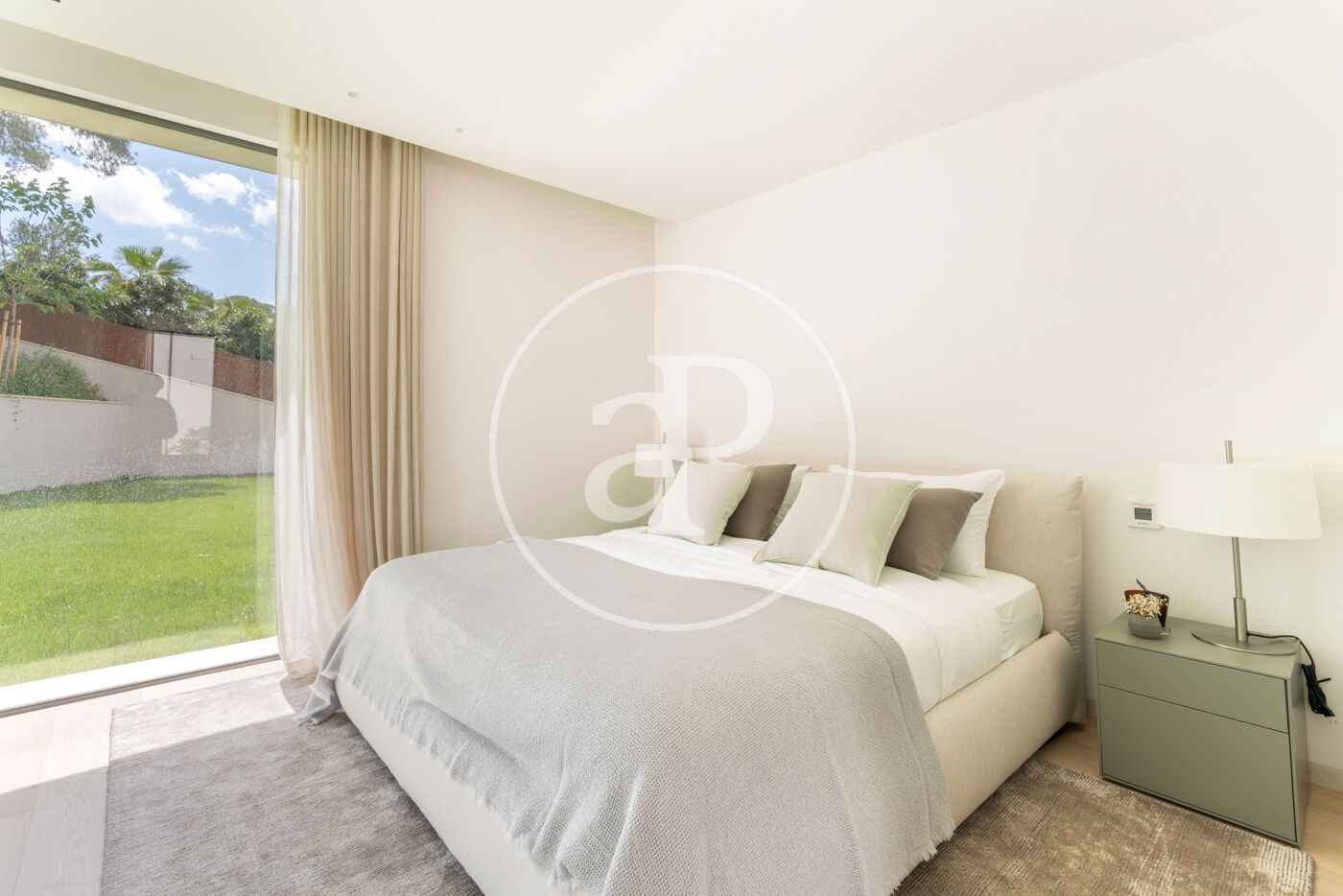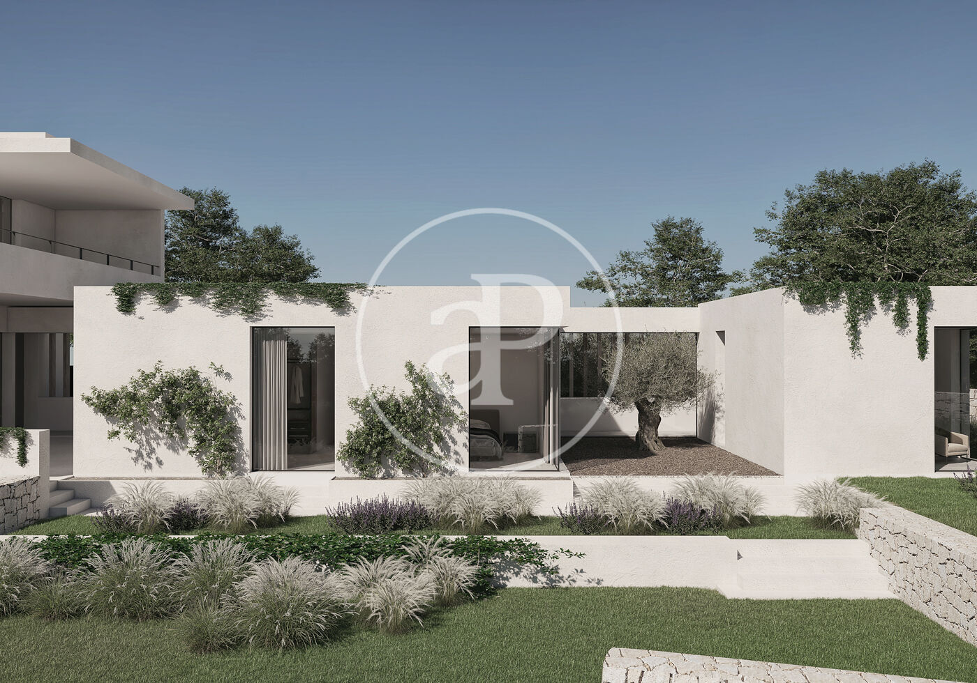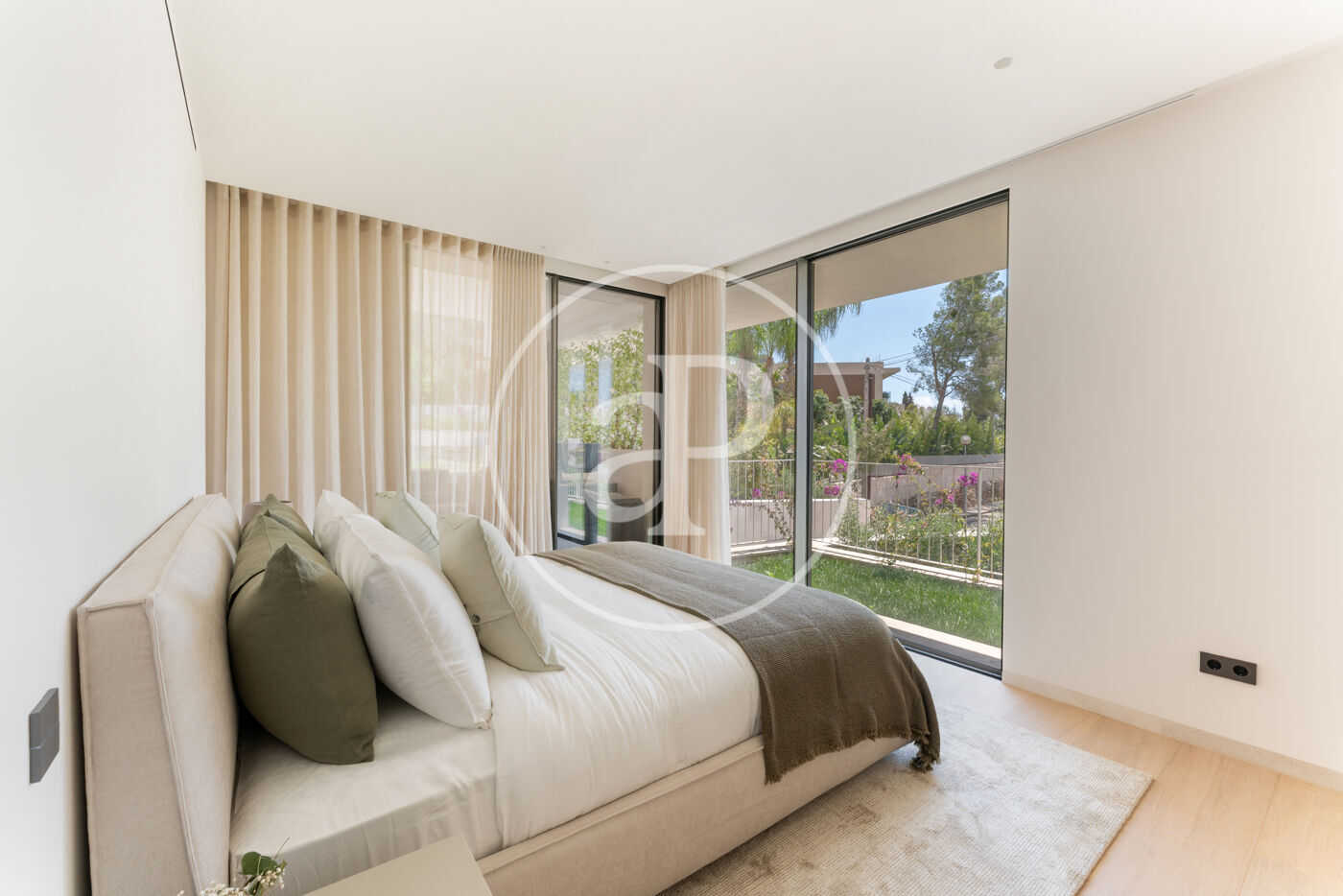 Das Haus verfügt über 6 großzügige Schlafzimmer, alle mit eigenem Bad en suite und direktem Zugang zum Garten und einem der Pools. Im Obergeschoss befindet sich ein sehr geräumiges Wohnzimmer mit Zugang zu einer überdachten Terrasse und dem zweiten Pool, eine offene Küche, ein Bibliotheksbereich sowie ein Gäste-WC.