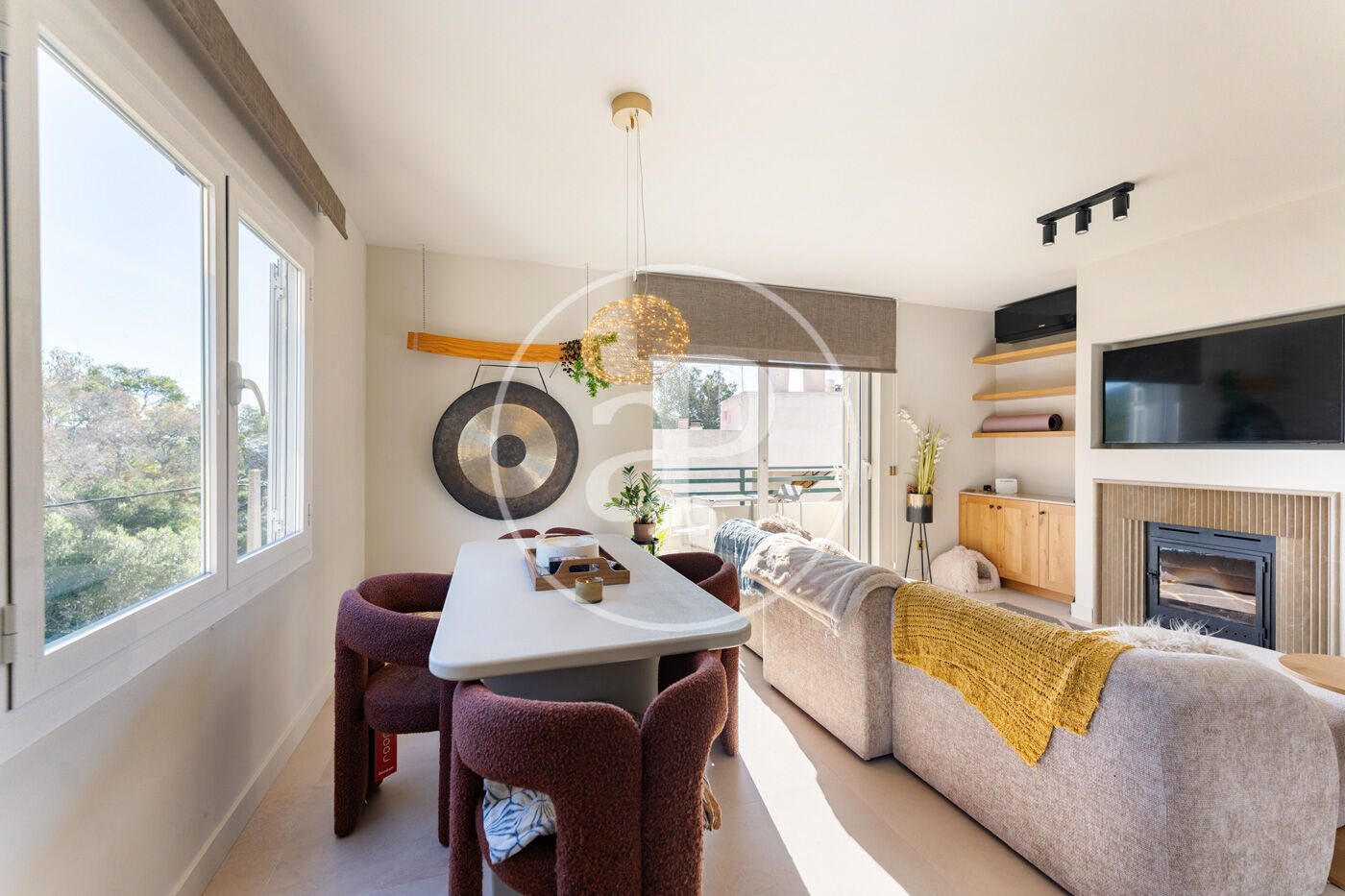 Beim Betreten der Wohnung empfängt Sie ein großzügiger und lichtdurchfluteter Wohn- und Essbereich, der als offener und fließender Raum gestaltet wurde, in dem sich der Alltag angenehm und natürlich entfaltet. Die offene Küche, diskret und harmonisch integriert, verleiht dem Raum visuelle Großzügigkeit und Funktionalität und macht diesen Bereich ideal sowohl zum Kochen als auch zum gemeinsamen Verweilen. Der Kamin sorgt für eine gemütliche Atmosphäre und macht diesen Raum zum Herzstück des Zuhauses – perfekt für ruhige Abende oder intime Zusammenkünfte.