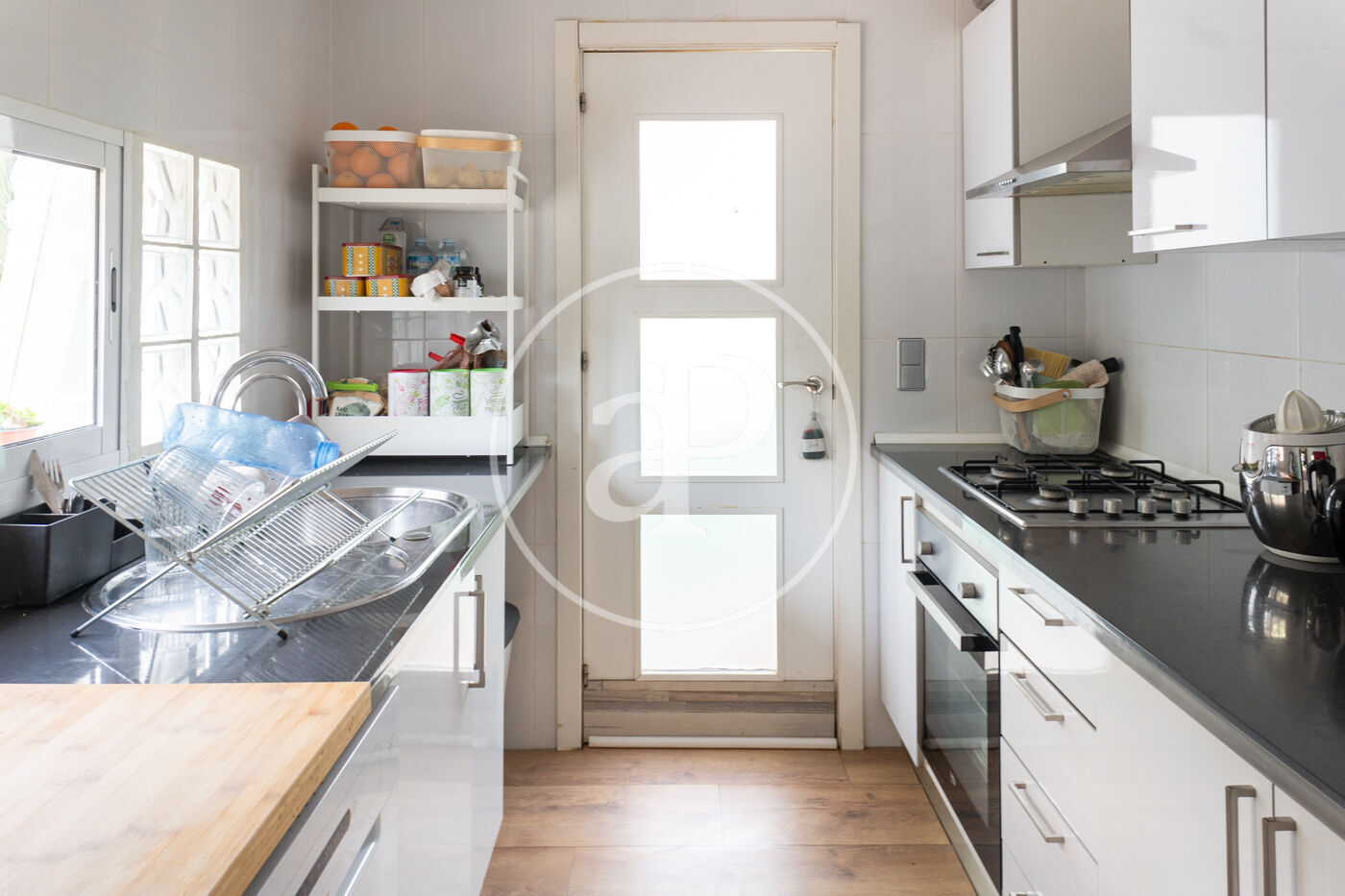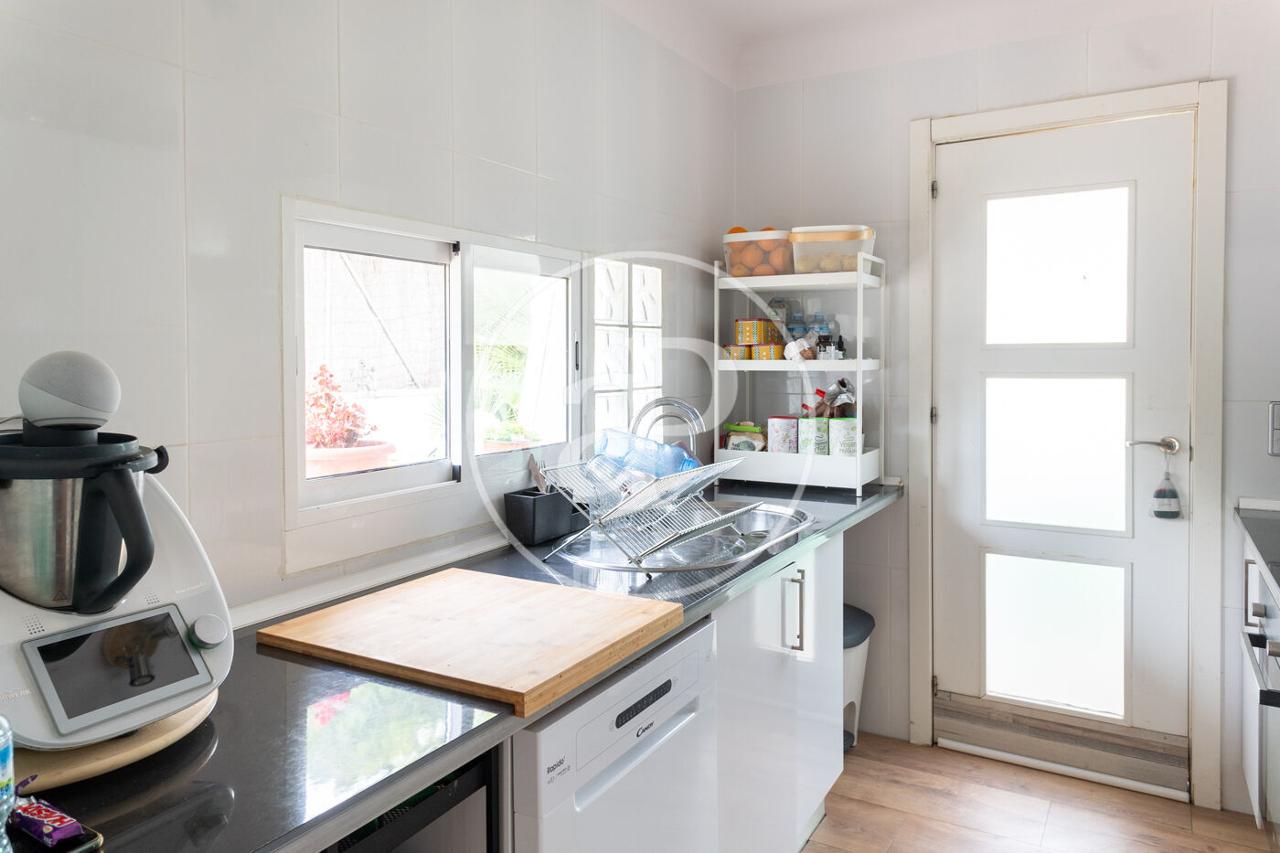 Die Küche ist voll ausgestattet mit allen notwendigen Geräten. Es gibt Schränke und Schränke für eine einfache Lagerung und Arbeitsplatten für die Zubereitung von Speisen.