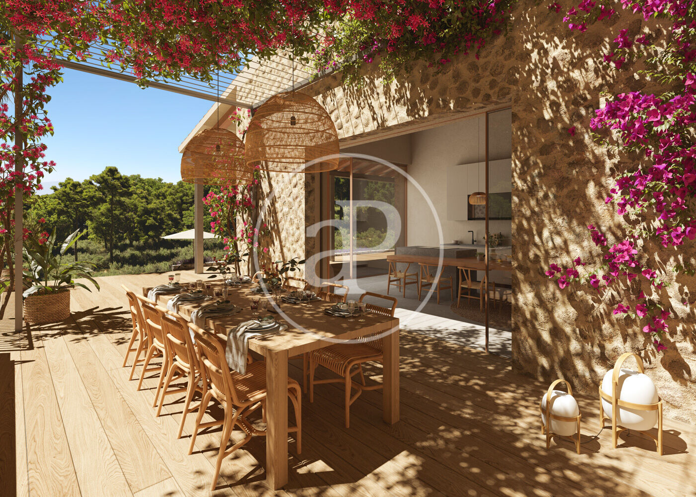Das Besondere an diesem Projekt ist die Auswahl renommierter Fachleute für jedes der Häuser. Die privilegierte Lage erlaubt es uns, einen 360-Grad-Blick zu genießen und sowohl das Meer als auch die fantastischen Berge, die Wälder von Sa Extremera und die Plantagen der umliegenden Dörfer zu sehen. Die Villa ist um einen Zugang herum konzipiert, der als Verbindung zwischen den drei Hauptbereichen des Hauses fungiert: den Schlafzimmern, dem Wohnzimmer und dem Küchenbereich. Auf diese Weise kann jeder Bereich unabhängig existieren, was den Komfort und die Bewohnbarkeit für die Nutzer erhöht. Zwischen den einzelnen Bereichen befinden sich von der typisch mallorquinischen Architektur inspirierte Veranden.