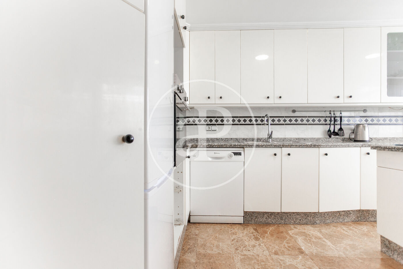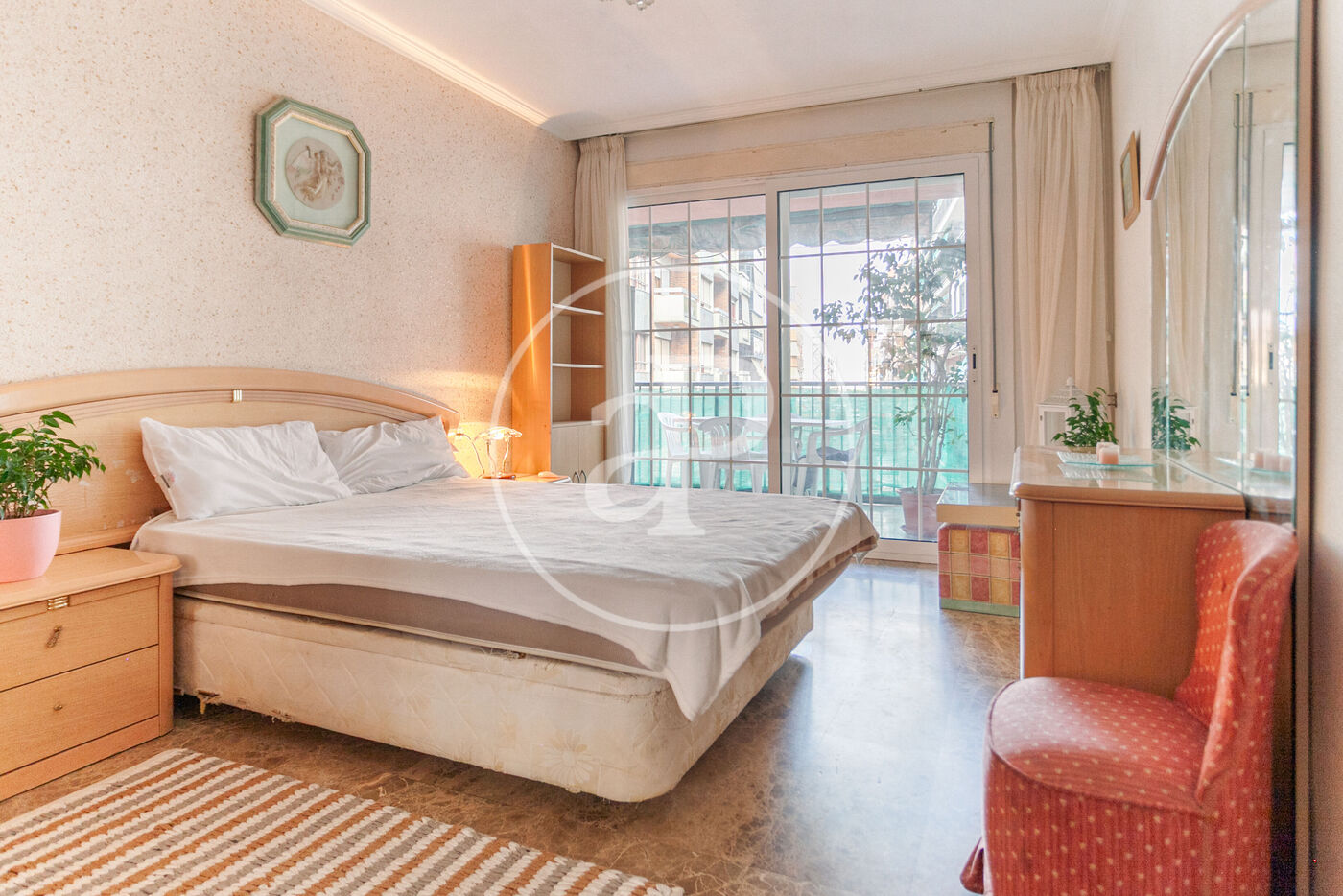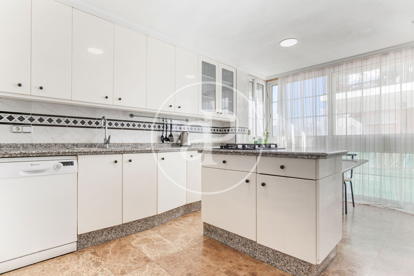 Die Wohnung ist aufgeteilt in drei Schlafzimmer (das Hauptschlafzimmer mit direktem Zugang zur Terrasse), ein großes Wohn-Esszimmer mit Zugang zur Terrasse und zum Balkon, eine geräumige Wohnküche mit originellem Design und vollständiger Ausstattung, sowie ein komplettes Badezimmer und einen praktischen separaten Bügelbereich.
