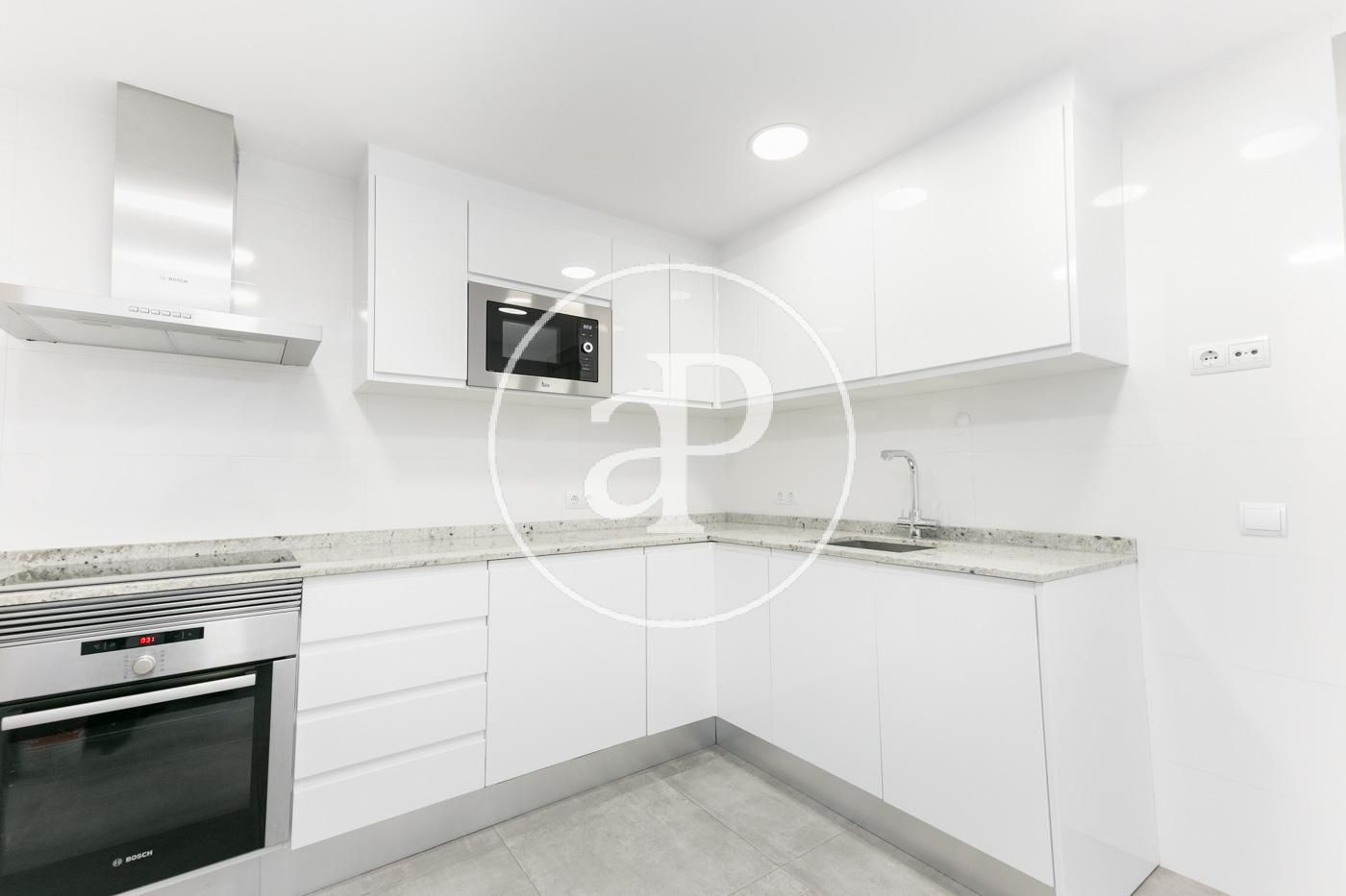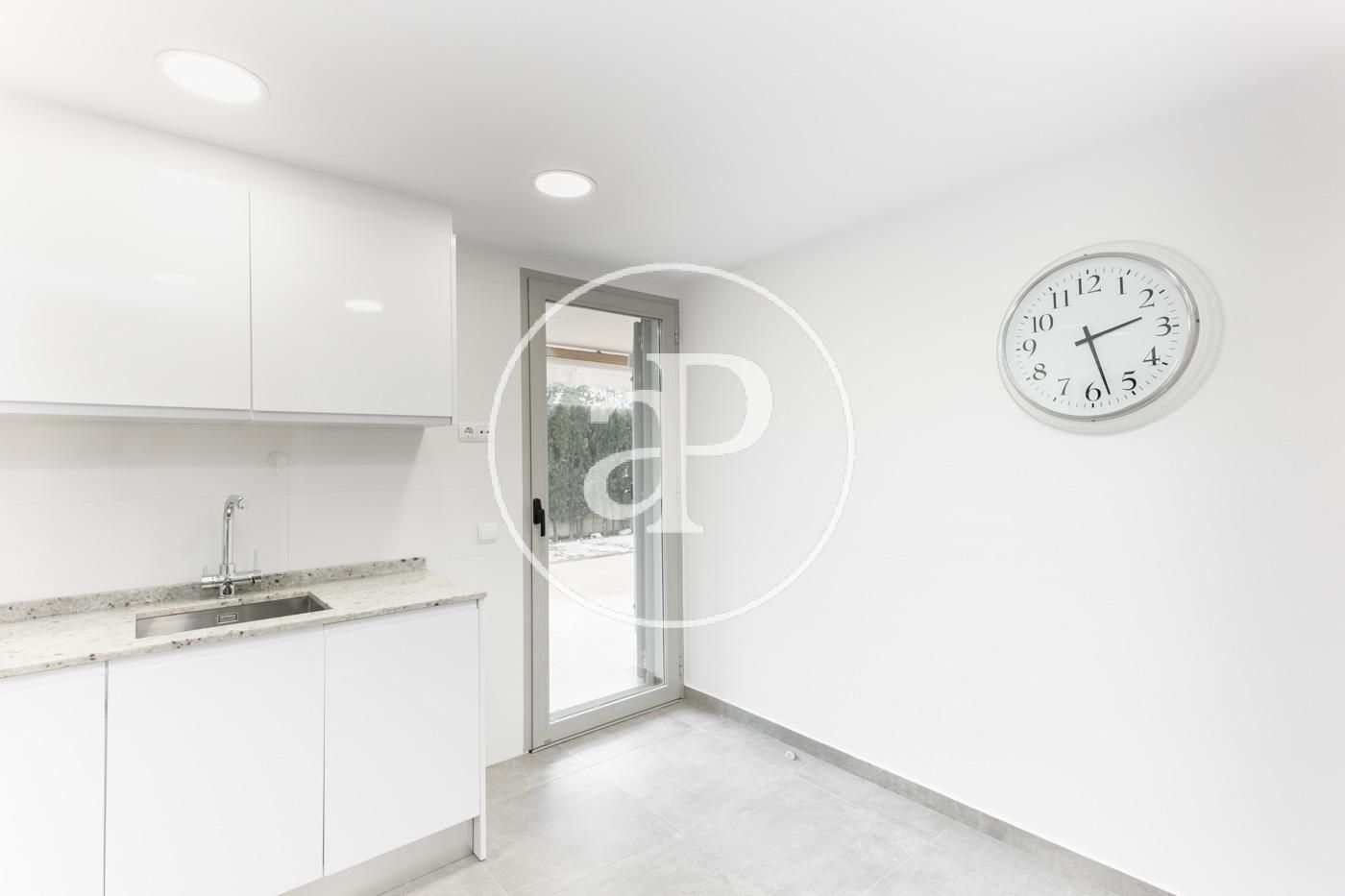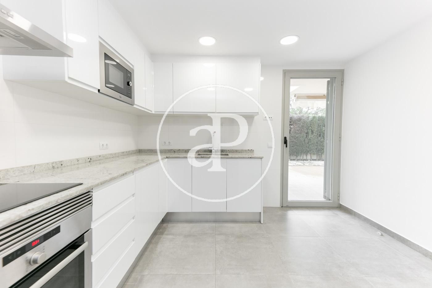 Im Tagesbereich gibt es eine voll ausgestattete Küche mit Zugang zum Patio und Zugang zur Waschküche. Daneben gibt es ein geräumiges und helles Wohn-Esszimmer mit einer großen Fenstertür, die Zugang zum Innenhof bietet.