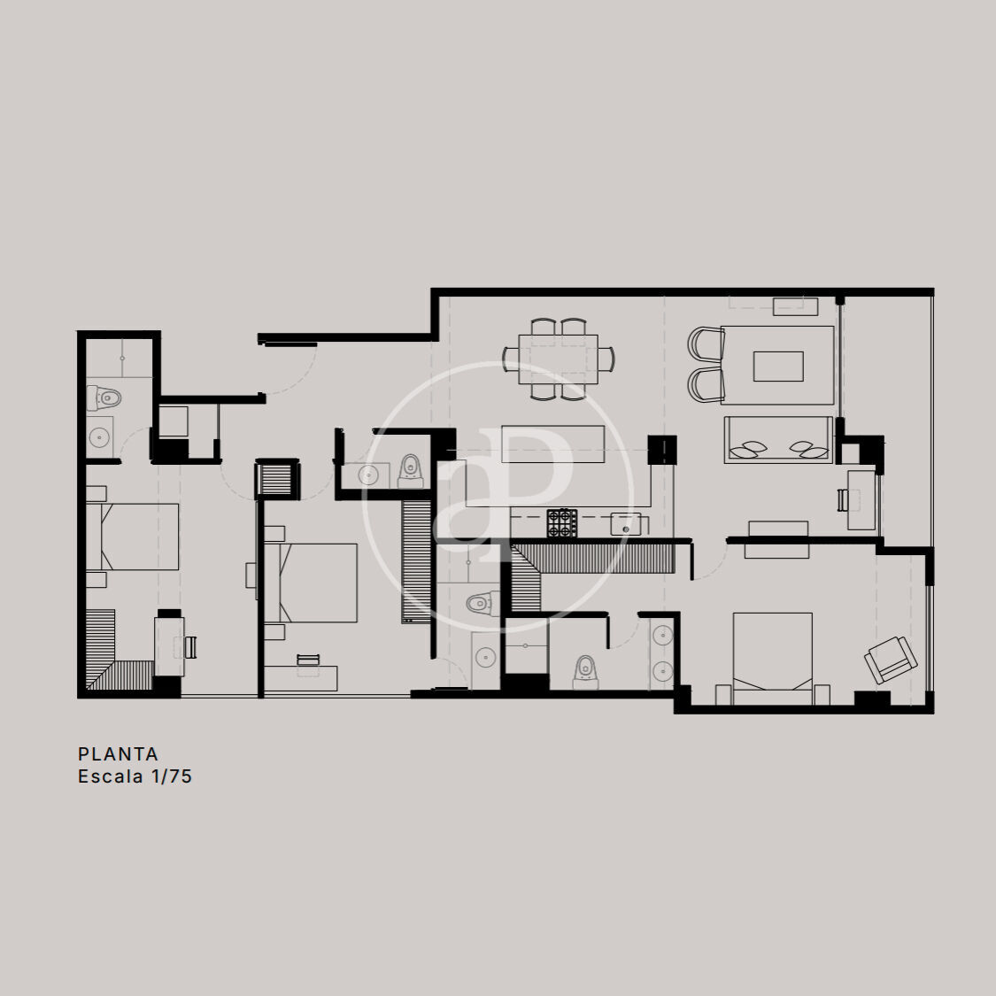 Die Immobilie hat 3 Zimmer, 3 Bäder, Klimaanlage, Einbauschränke, Heizung und Pförtner.