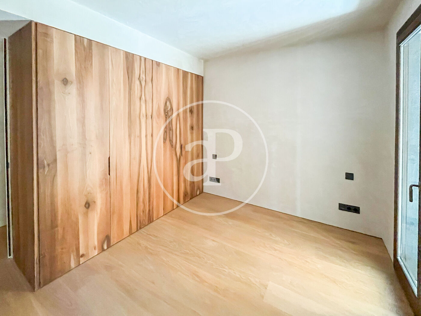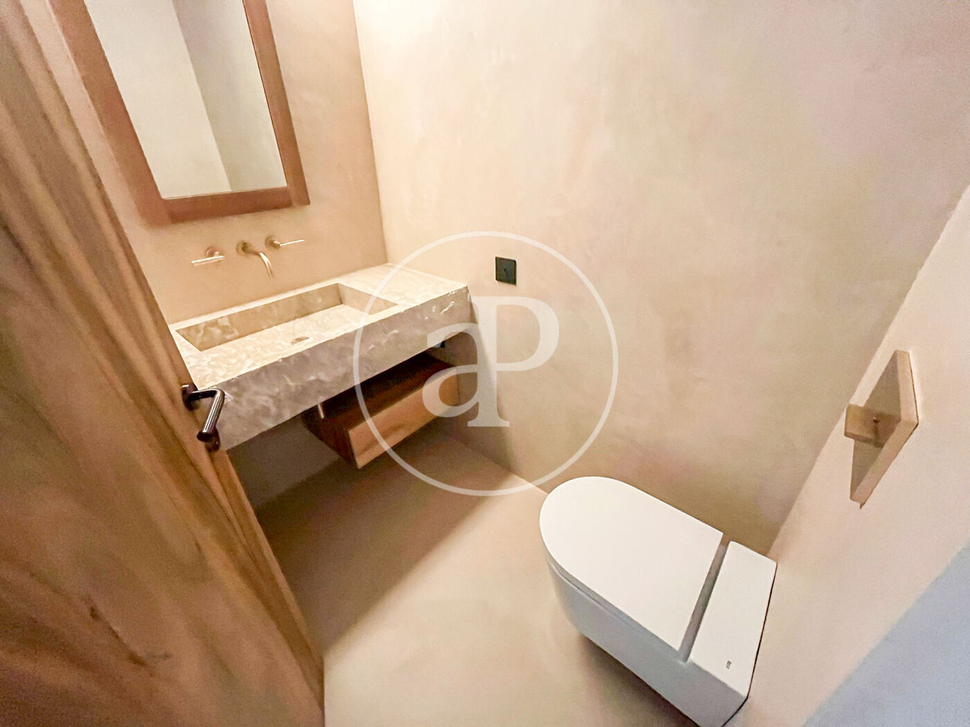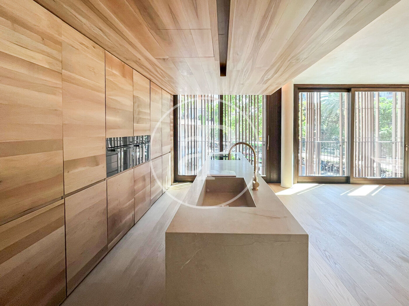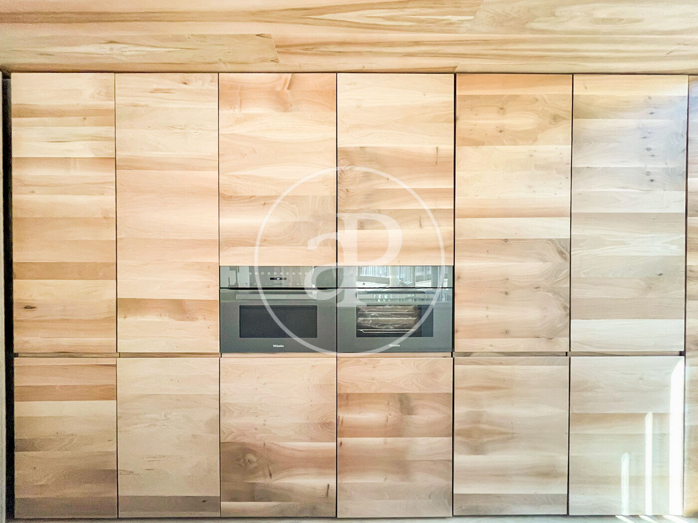 Mit 152 m² Wohnfläche verteilt sich die Wohnung auf ein großzügiges und helles Wohn-Esszimmer mit integrierter Küche, ausgestattet mit hochwertigen Geräten der Marke Miele, Möbeln aus Naturholz und einer praktischen Kochinsel aus Binissalem-Naturstein – ideal für ein warmes und elegantes Ambiente. Zusätzlich gibt es einen separaten Hauswirtschaftsraum sowie ein Gäste-WC. Dank der großen bodentiefen Fenster genießt der Raum herrliches Licht und einen freien Blick auf die Grünzone des Paseos.