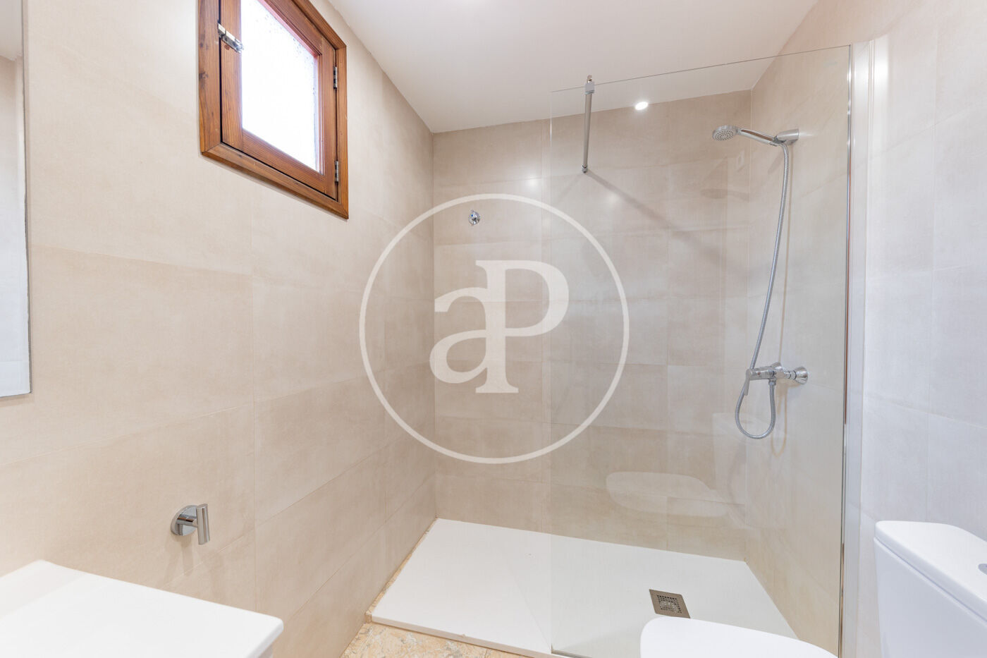 In der oberen Etage befindet sich ein weiteres sehr geräumiges Schlafzimmer mit Bad en Suite und Zugang zur oberen Terrasse, von der aus man einen herrlichen Blick auf das Meer und die wunderschöne Kathedrale von Palma genießen kann.