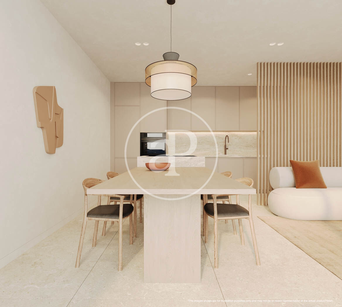 Erstbezug. Nach Süden ausgerichtete, komplett renovierte, 132 m²-Wohnung mit Blick auf die Verge del Carme Kirche, und einem Aufzug In Palmas angesagtem Stadtteil Santa Catalina mit seinen zahlreichen Cafés, Restaurants und Boutiquen und nur wenige Gehminuten vom Palma Sport- und Tennisclub (750 m), eleganter Einkaufsstraße Jaime III (600 m), Santa Catalina Markt (550 m) und dem malerischen und exklusiven Paseo Marítimo (800 m) entfernt, kommt diese luxuriöse Wohnung mit einer Wohnfläche von 132 qm zum Verkauf. Die hochwertig ausgestattete, moderne 4-Zimmer-Wohnung befindet sich im 3. Obergeschoss eines 1975 erstellten und im Jahr 2025/2026 aufwendig sanierten Mehrfamilienhauses. Dieses geräumige Design-Apartment wurde 2025 komplett entkernt und saniert: Alle Wandverkleidungen, die Decke, Röhren, Leitungen, Fenster, Türen usw. wurden vollständig entfernt. Anschließend wurden neue Wasser-, Elektro- und Lüftungsleitungen verlegt sowie gemauerte Trennwände in Massivbauweise errichtet und verputzt. Schall- und Wärmedämmung wurden entsprechend dem mallorquinischen Klima angebracht. Außenwände wurden zweifach verstärkt. Somit entstand eine komplett neue, moderne und gemütliche 4-Zimmer Erstbezugswohnung mit exquisitem Lichtdesign und einer Gesamtwohnfläche von 132m². Skandinavischer Stil, helle und warme Beige- und Grautöne, großer Flur, drei Schlafzimmer, zwei Badezimmer, ein geräumiges Wohnzimmer und eine offene weiße, voll ausgestattete Küche im High-Tech-Stil und einer Kücheninsel. Eine ausschließlich mit einheimischen Gewächsarten bepflanzte Loggia rundet das Ambiente ab. Beide Schlafzimmer verfügen über geräumige Einbauschränke in dezentem Grau mit LED-Beleuchtung unter jedem Regal. Das Hauptschlafzimmer ist zusätzlich mit einem begehbaren Kleiderschrank ausgestattet. Auch im Flur befindet sich ein Einbauschrank für Oberbekleidung. Es wurden ausschließlich natürliche Materialien verwendet – darunter langlebige, abriebfeste und atmungsaktive, doppelt verglaste Eichenholzfenster mit einer Holzdichte von 850 kg/m³ und hochwertigen Scharnieren von Gretsch-Unitas. Alle 3 cm starken Fensterbänke bestehen aus edlem Naturstein Crema Marfil; die Küchenarbeitsplatten wurden aus dem regionalen Naturstein Gris Zarci Beige gefertigt. In allen Bereichen – mit Ausnahme von Küche und Bädern – wurde ein gebürsteter und geölter Massivholzboden aus 20 mm starker österreichischer Eiche verlegt. Das Gästebad ist mit einem Waschtisch und WC von Villeroy & Boch, einer ebenerdigen Grohe SPA-Regenbrause, einer Duschkabine von Hüppe sowie einer Steinberg Hygienedusche ausgestattet. Im Masterbad finden sich eine großzügige, ebenerdige Grohe SPA-Regenbrause, eine Dusch-Schwingtür von Hüppe, ein doppelter Waschtisch von Villeroy & Boch, ein Bidet sowie ein WC. Die gesamte Badausstattung überzeugt mit hochwertigen Systemkomponenten von Geberit, Grohe, Villeroy & Boch, stilvollen Armaturen von Steinberg, beschlagfreien, beleuchteten Hans Grohe Spiegeln, Kosmetikspiegeln mit Beleuchtung, Fußbodenheizung und zahlreichen weiteren exklusiven Details. Die Bäder sind in hellgrauen Tönen gehalten und deckenhoch gefliest. Für die Böden wurden großformatige Feinsteinzeugfliesen in moderner Betonoptik gewählt. Eine zweifache Wasserfilterung sowie eine Enthärtungsanlage (Das Leitungswasser ist auf Mallorca ist extrem hart, “kalkhaltig”) sorgen für glasklares, weiches Wasser. In der Küche stellt eine fest installierte Umkehrosmose-Anlage reinstes Trinkwasser zur Verfügung. Für ein durchgängig angenehmes Raumklima sorgt das energieeffiziente WiFi-Inverter-Klimasystem von Mitsubishi, das im Sommer kühlt und im Winter heizt. Das gesamte Objekt ist mit modernster Smart-Home-Technologie ausgestattet. Im Flur und im Wohnzimmer befindet sich je ein Steuerungs iPad, mit dem sich Licht, Heizung, Klimaanlage, Musik, TV, die Video-Gegensprechanlage und vieles mehr komfortabel bedienen lassen. Alle Funktionen sind auch mobil via App von unterwegs steuerbar. Ein innovatives akustisches Raumkonzept wurde durch den Einbau von Fonestar-Deckenlautsprechern mit breitem Abstrahlwinkel realisiert, das alle Räume mit exzellentem Klang erfüllt. Ein rahmenloser 8K-QLED-TV mit Apple TV ist nahtlos in das Soundsystem integriert. Somit erwartet den zukünftigen Eigentümer ein Heimkino- und Klangerlebnis der Extraklasse. Die Immobilie liegt nur 12 km vom Flughafen Palma entfernt – etwa 17 Minuten mit dem Auto. Der Haupteingang ist mit einer gepanzerten Dierre VT5 Tür ausgestattet, die höchste Sicherheit und Design bietet. Die Innentüren sind Modell Madersan Lisa aus weißem Massivholz mit Magnetverschlüssen und unsichtbaren Scharnieren – elegant und optisch durchgängig. Die Tür- und Fenstergriffe sind das matte Modell Hoppe Verona. Die Fenster sind aus hochdichtem Eichenholz mit atmungsaktivem Doppelglas und Gretsch Unitas Premiumbeschlägen. Alle Fensterbänke bestehen aus 3 cm starkem Crema Marfil und verleihen Standfestigkeit und Stil. Der Fußboden in allen Räumen – außer Küche und Bädern – ist ein massives österreichisches Eichenparkett von 20 mm, gebürstet und mit natürlichem Öl behandelt. In Küche und Bädern wurden großformatige Feinsteinzeugfliesen im Betonstil verlegt, mit integriertem Fußbodenheizungssystem. Die Bäder sind eingerichtet mit Premium-Komponenten von Steinberg, Grohe, Villeroy & Boch, Geberit und Bosch. Die Maßküche verfügt über 18 mm glänzende Fronten von Nolte, Softclose-Vollauszugsschubladen, Gris Zarci Beige Naturstein-Arbeitsplatten und Bosch Accent Line Edelstahlgeräte: Backofen, Mikrowelle, Kühlschrank, Geschirrspüler, Wasch-Trocken-Gerät und Induktionskochfeld mit integriertem Abzug. Die Küchenausstattung umfasst WMF Sitello Besteck für sechs, Riedel Performance Dekanter, Stölzle Lausitz Gläser, Riedel Weingläser, Rosenthal Fleurs Geschirr, Le Crueset Profikochgeschirr (13 Teile), Zwilling Messer 