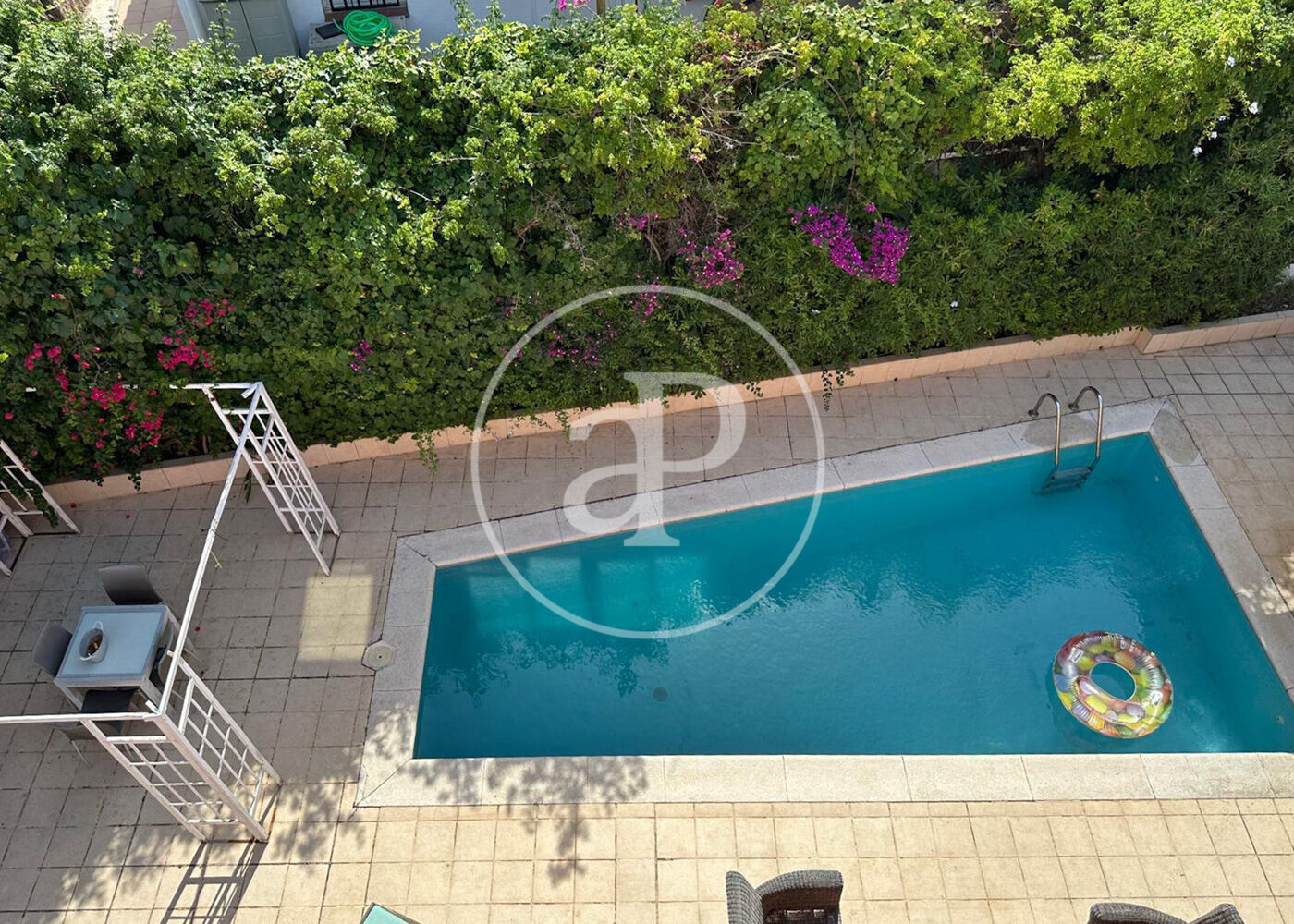 El exterior es un oasis privado: piscina amplia, zona chill out, barbacoa y cocina al aire libre. Cuenta con garaje cubierto para tres coches y acceso directo a un baño y zona de lavado.