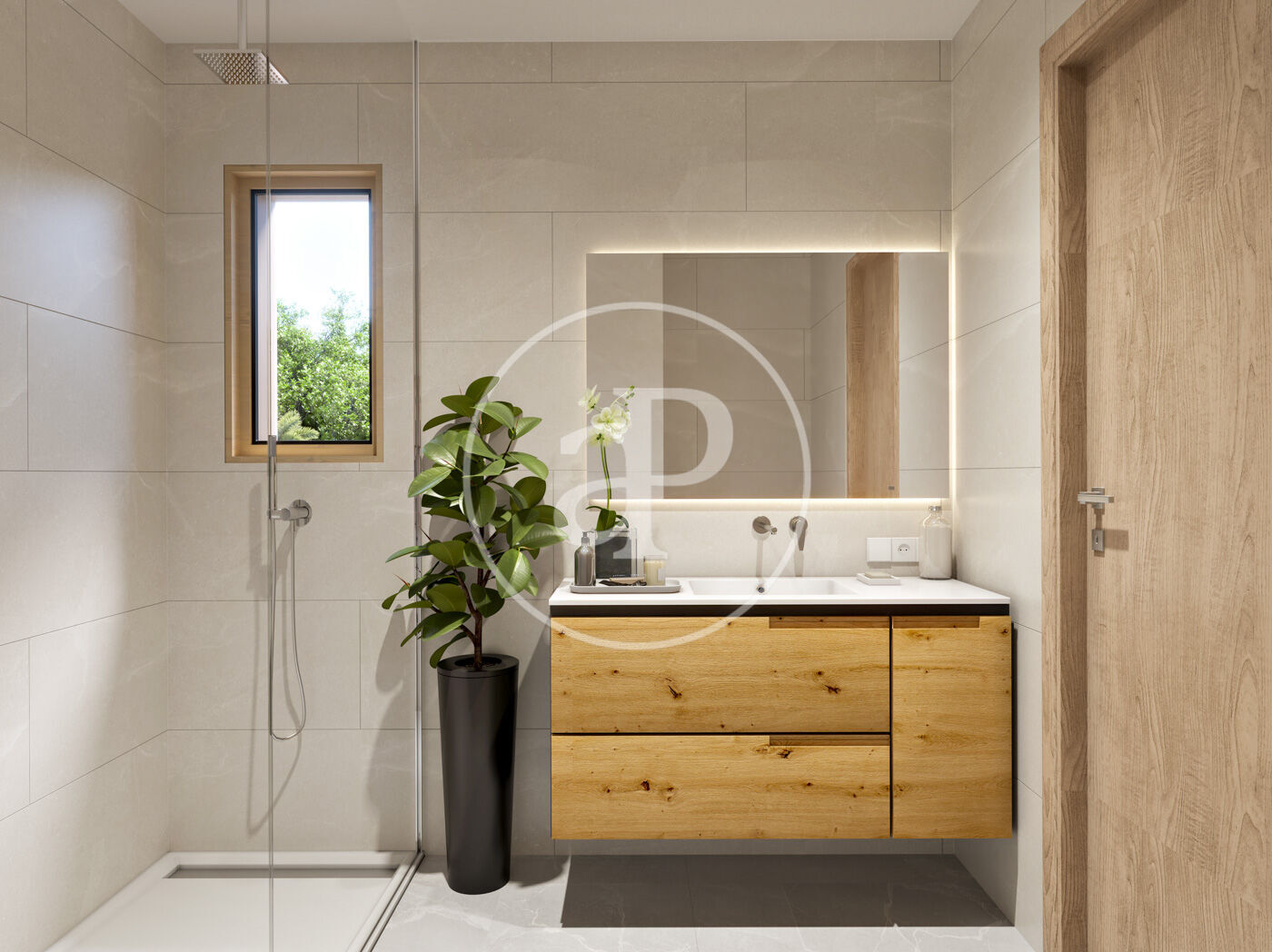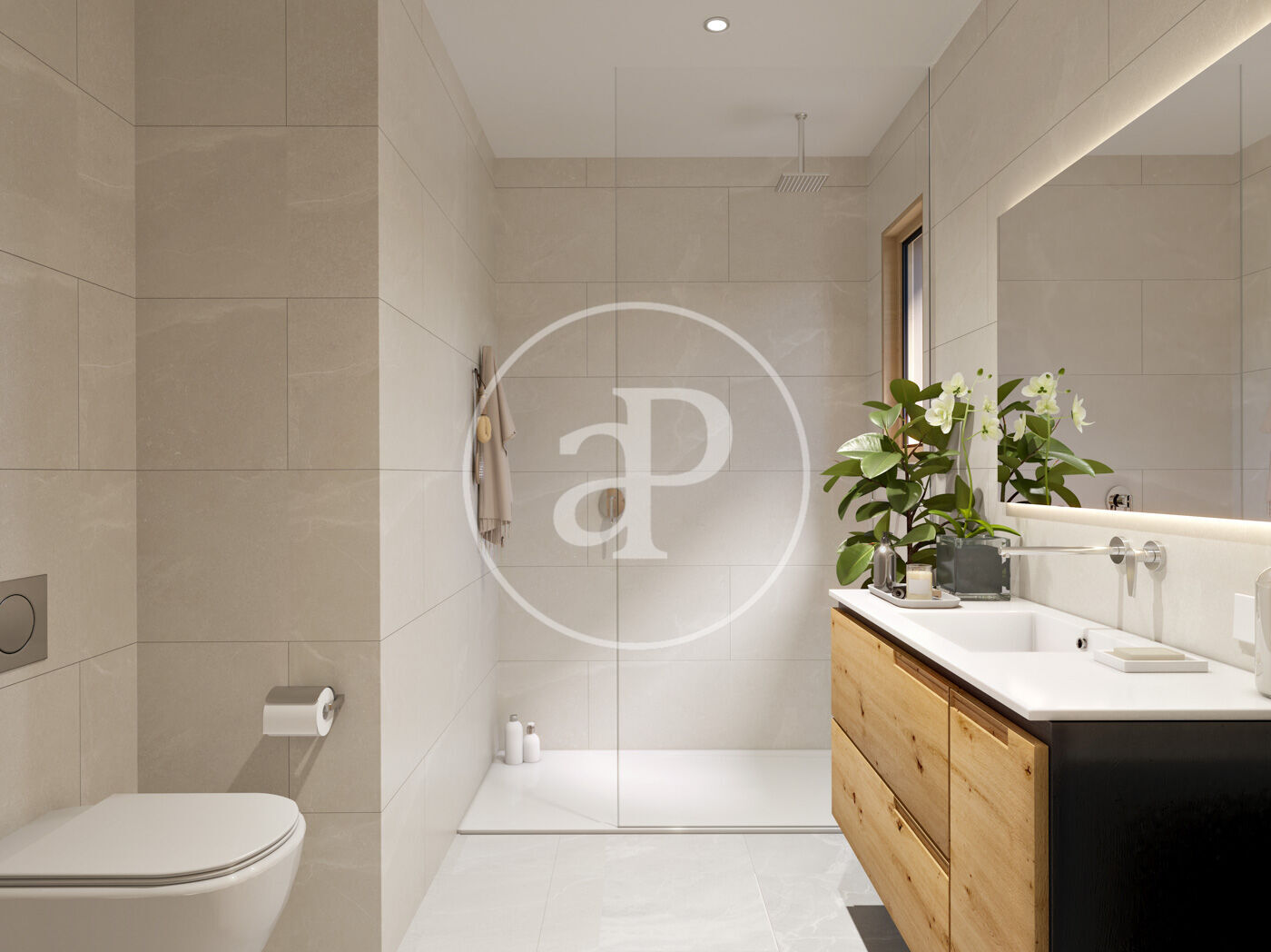 Bathrooms fitted with built-in Tres taps, suspended wooden vanity units and walk-in showers