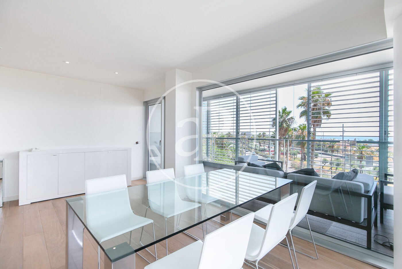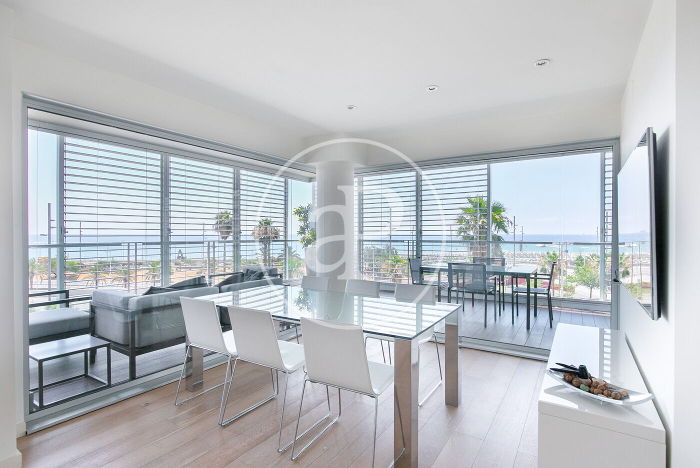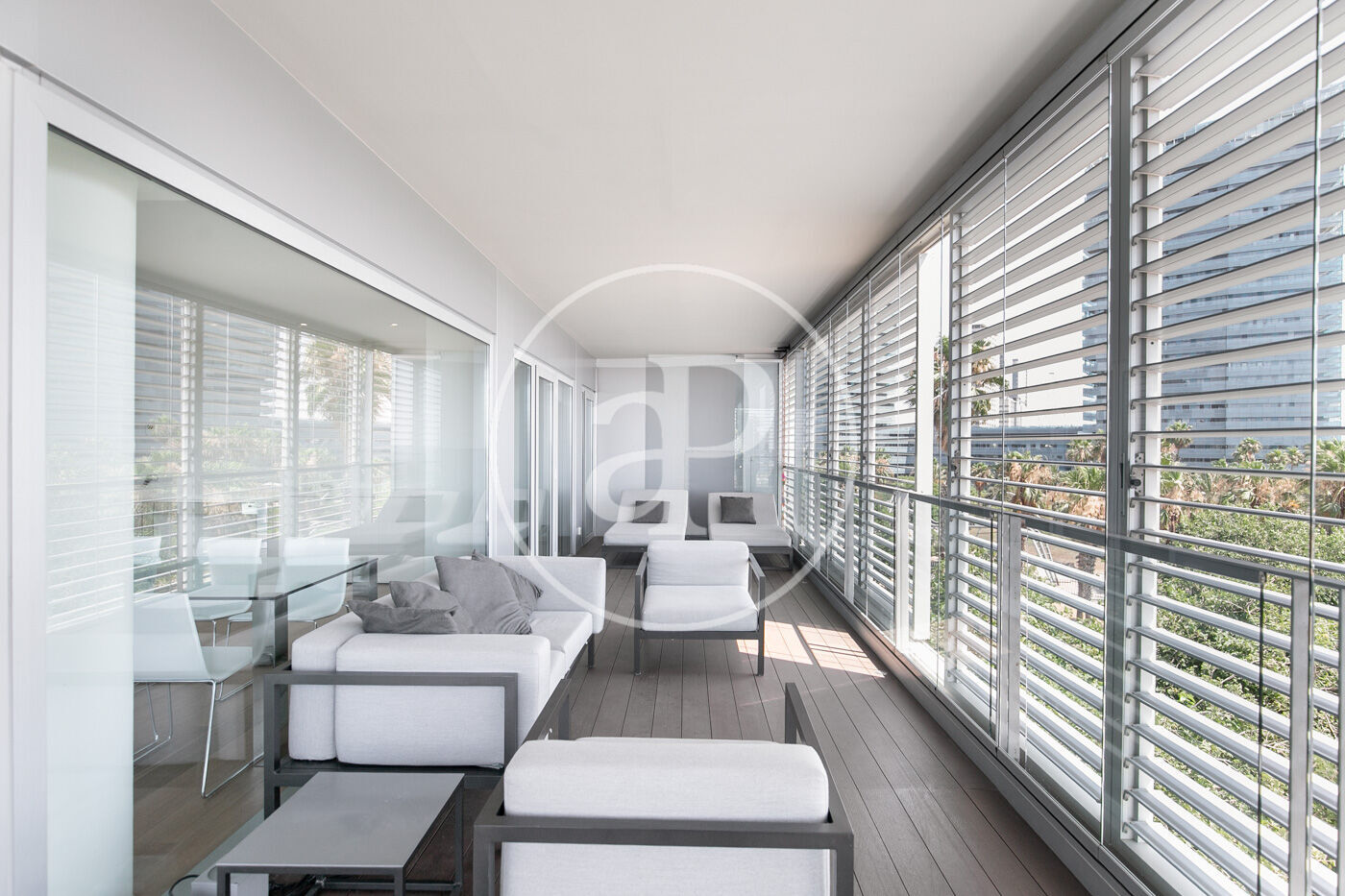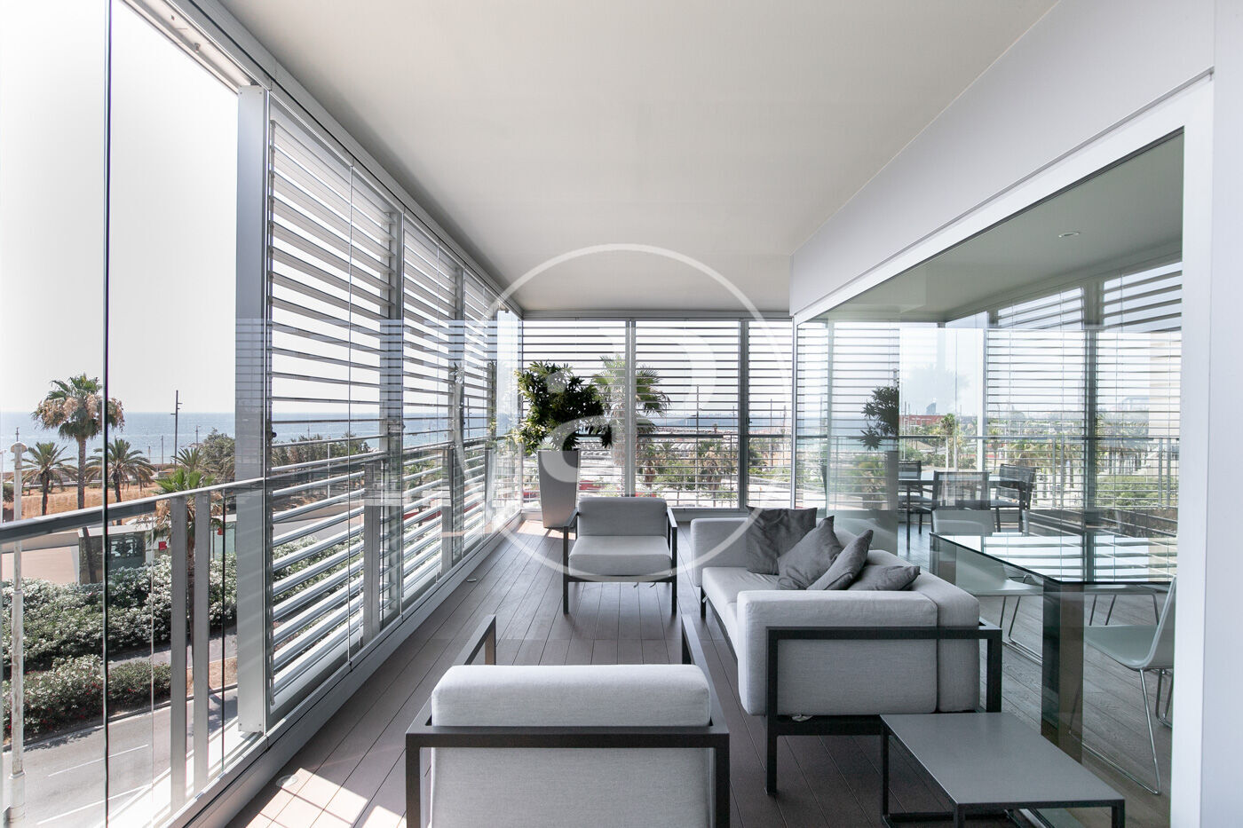 In the prestigious Illa de la Llum building, winner of a FAD architecture award, we find this spectacular renovated apartment in impeccable condition, fully furnished, with a glazed terrace offering sea views from every room.