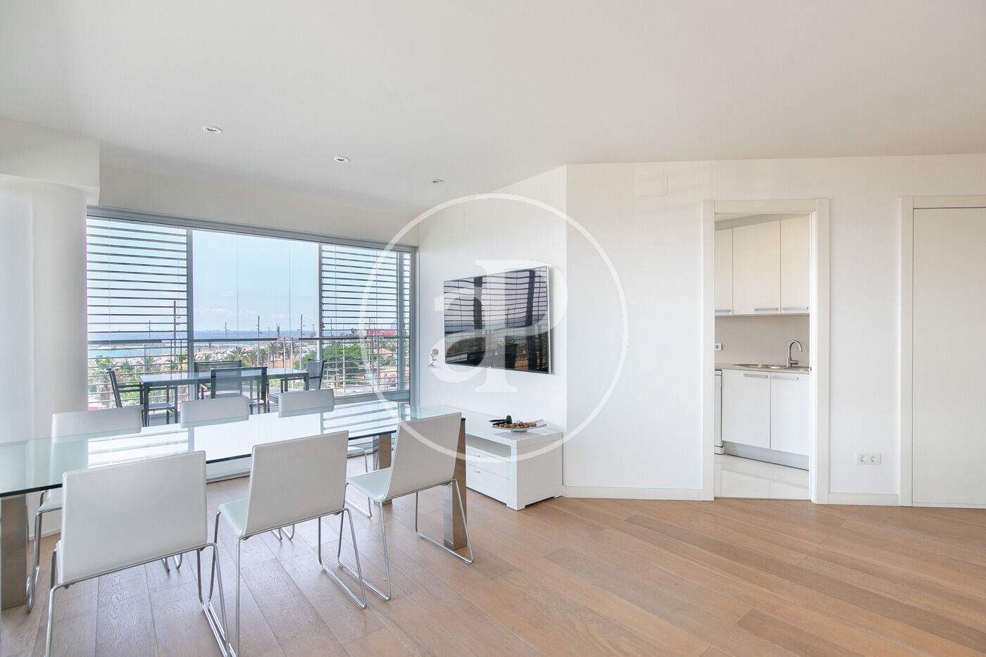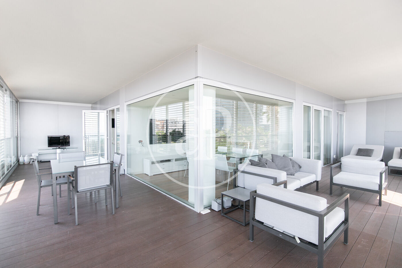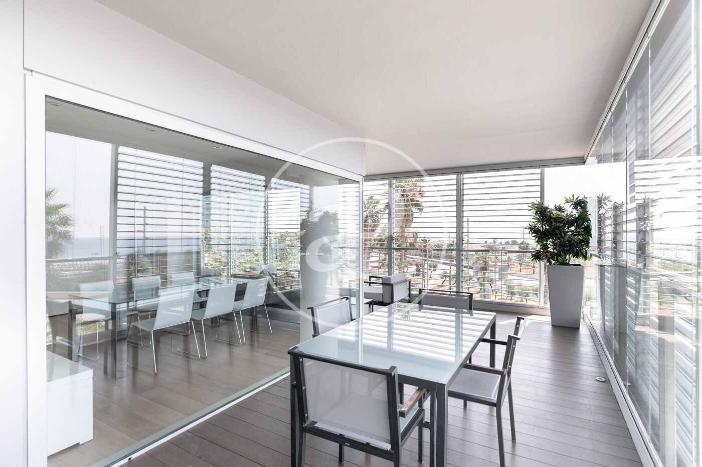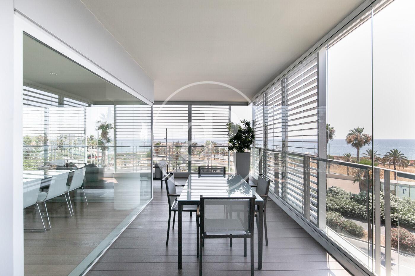 In the prestigious Illa de la Llum building, winner of a FAD architecture award, we find this spectacular renovated apartment in impeccable condition, fully furnished, with a glazed terrace offering sea views from every room.