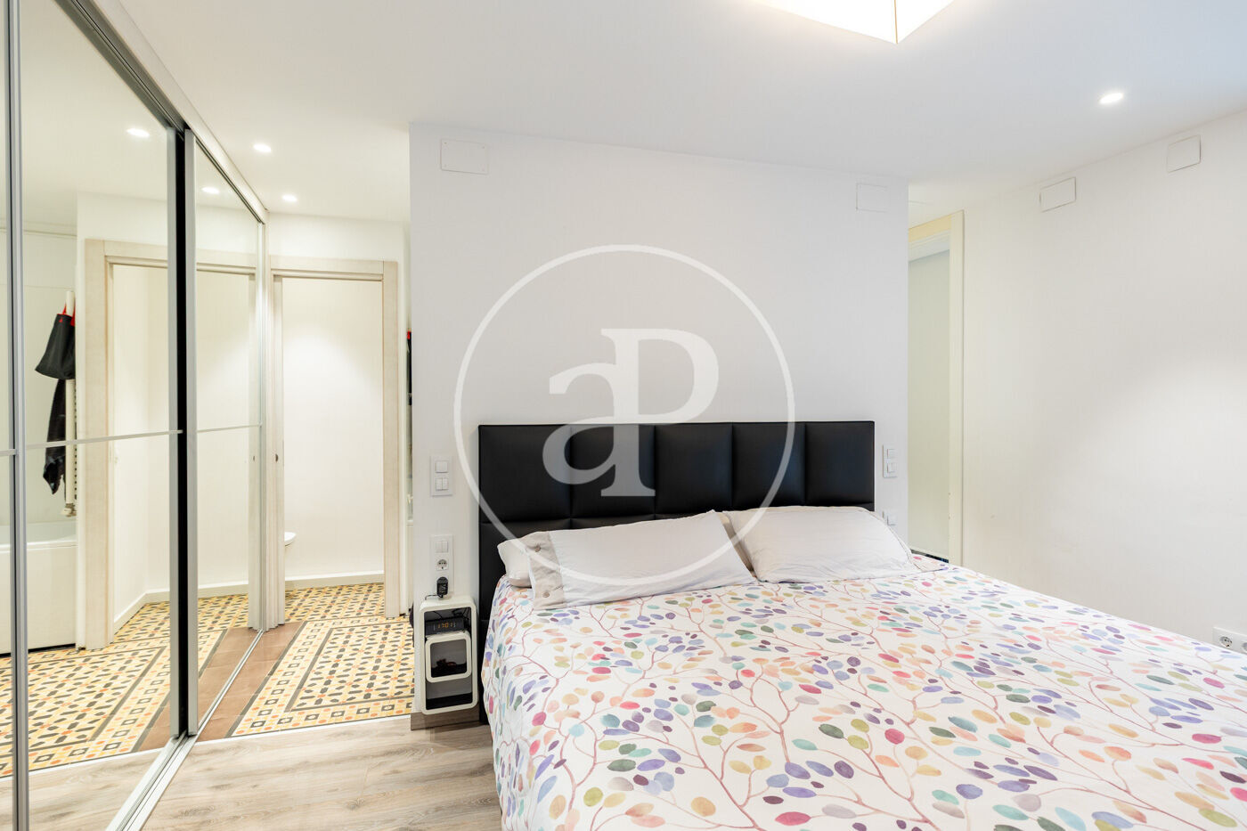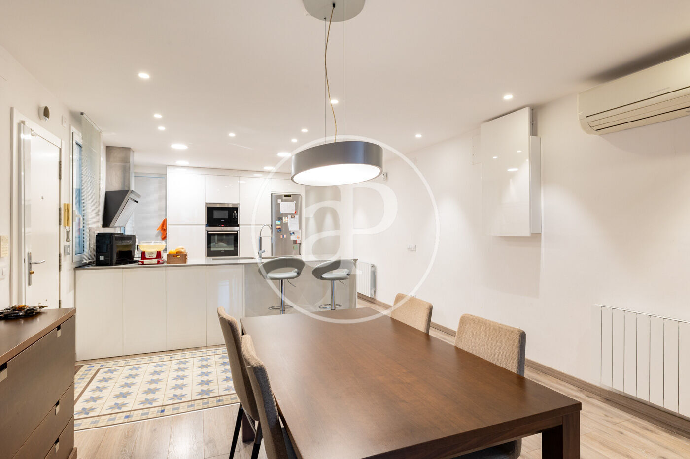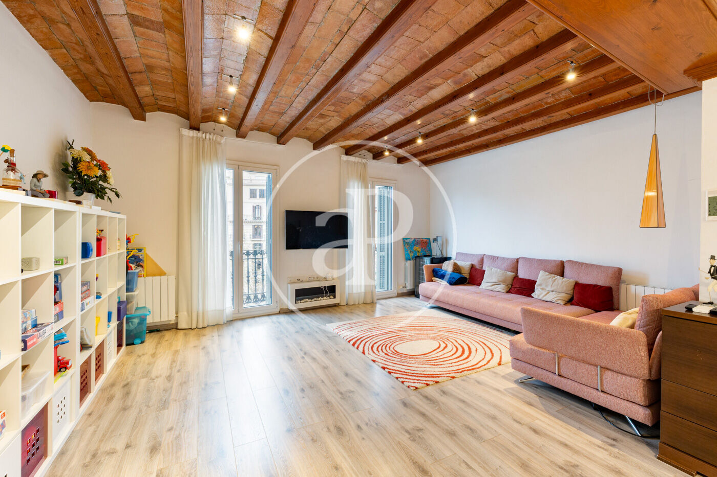 Upon entering, you are welcomed into a large open-plan living-dining-kitchen area with a balcony overlooking Diagonal Avenue. The spacious, fully equipped kitchen is seamlessly integrated into the day area, featuring traditional Catalan vaulted ceiling details.