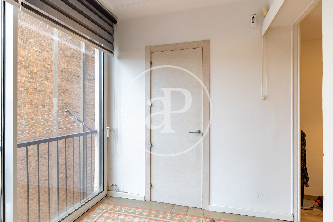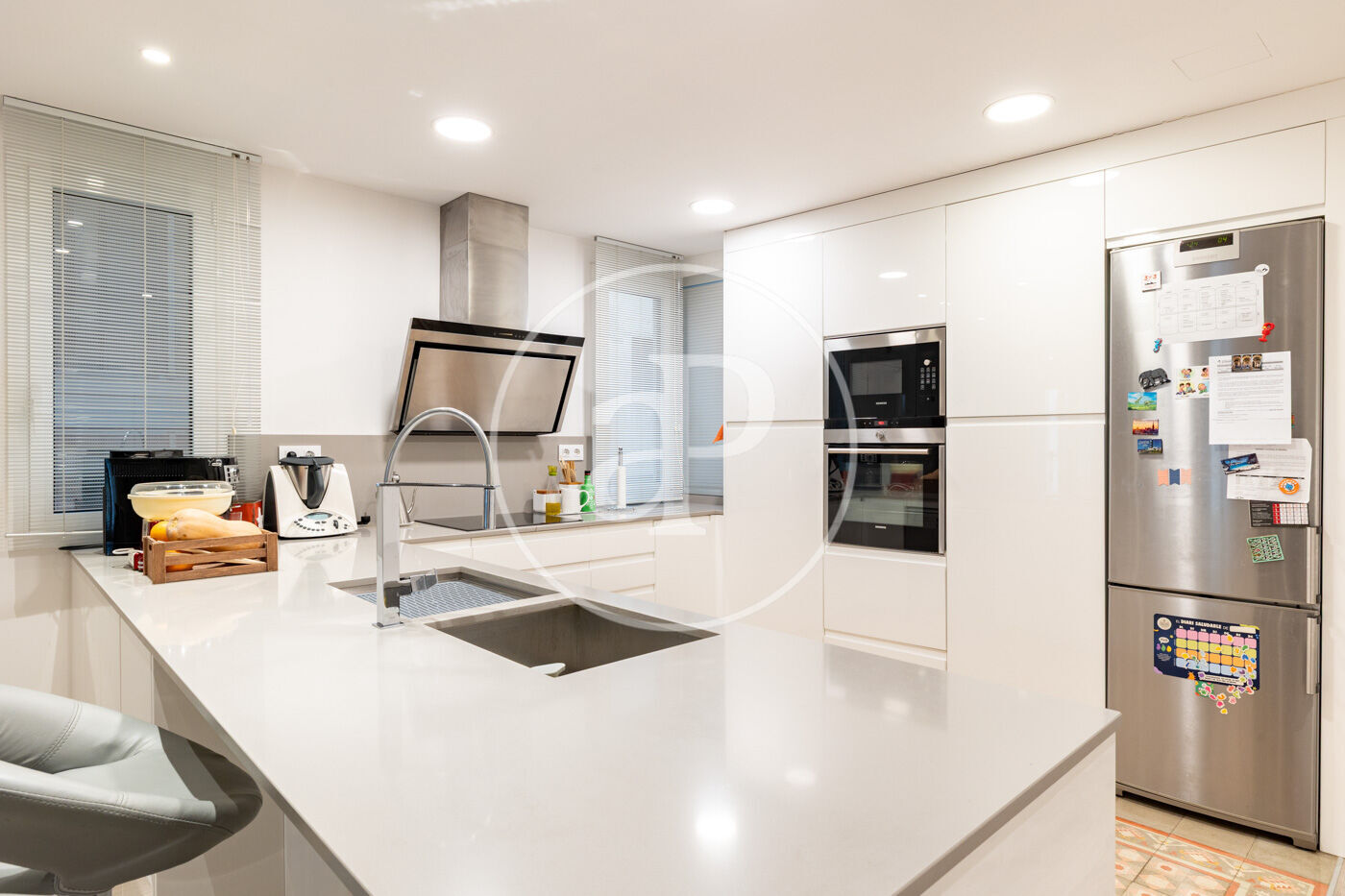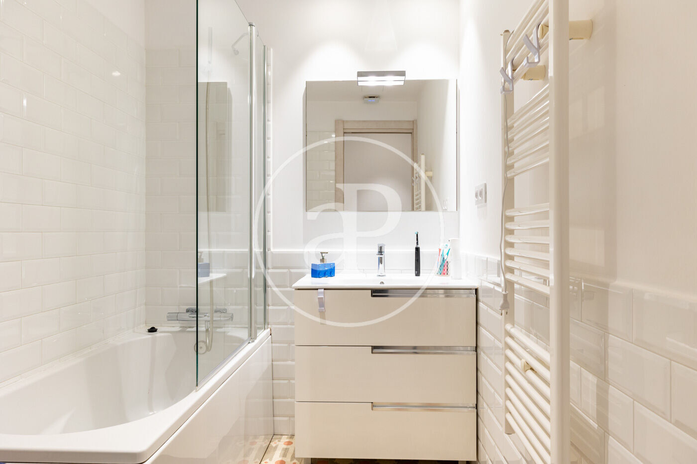 Upon entering, you are welcomed into a large open-plan living-dining-kitchen area with a balcony overlooking Diagonal Avenue. The spacious, fully equipped kitchen is seamlessly integrated into the day area, featuring traditional Catalan vaulted ceiling details.