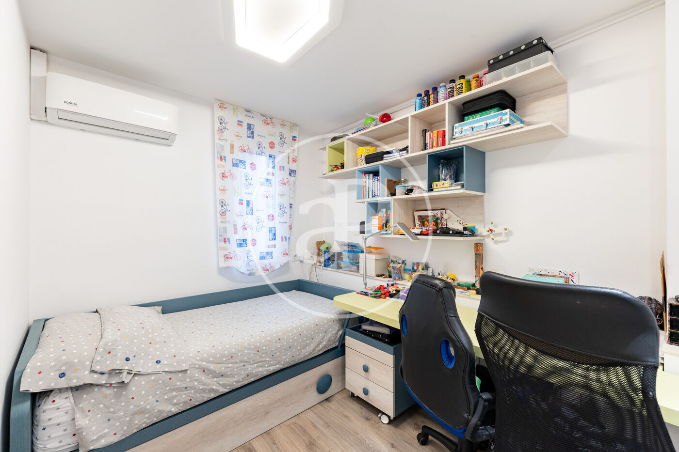 The night area consists of two large single bedrooms. Although they face an interior patio, they receive abundant natural light due to the apartment’s top-floor position. These two bedrooms share a full bathroom with a bathtub.