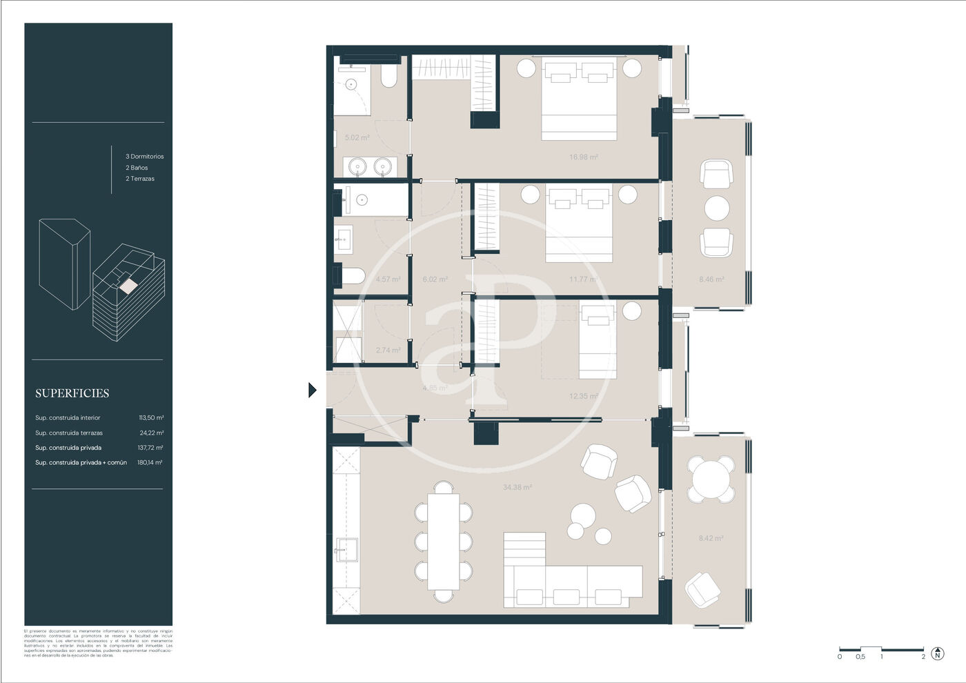 This apartment, located on the eighth floor, features a modern and functional layout. It includes a spacious living-dining room with a fully equipped Bulthaup kitchen and direct access to a large terrace. The master suite has a walk-in dressing area, an en suite bathroom, and access to a second private terrace. The apartment is completed by two double bedrooms, a second bathroom, and a separate laundry area. The generous terraces provide spectacular open views and an ideal setting for relaxing outdoors.