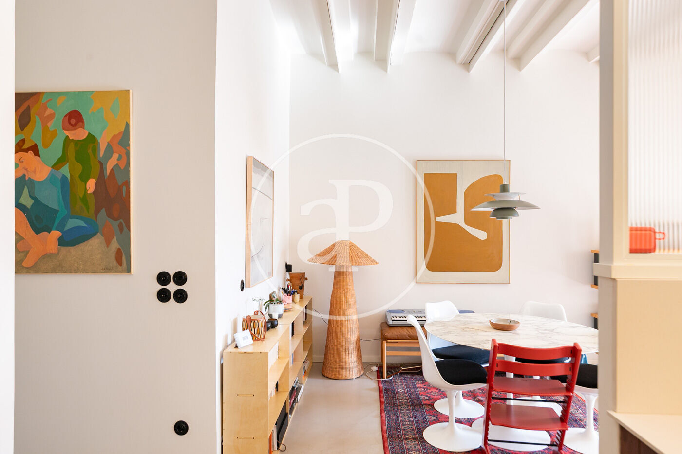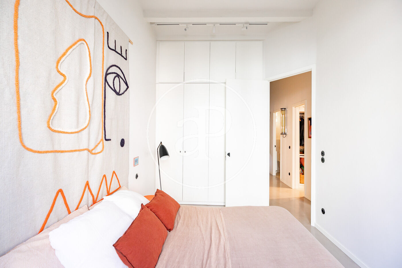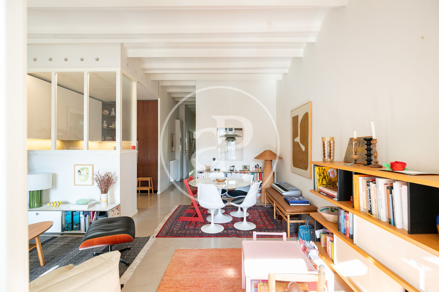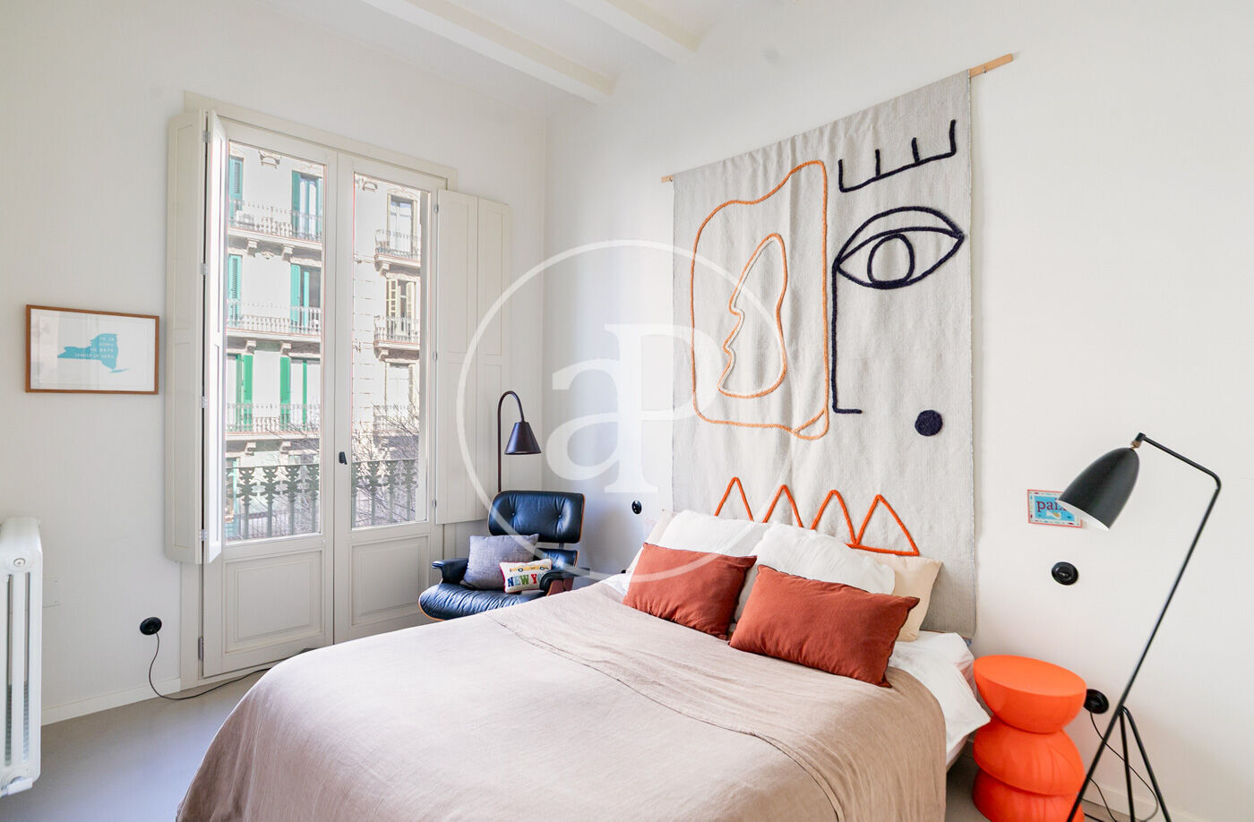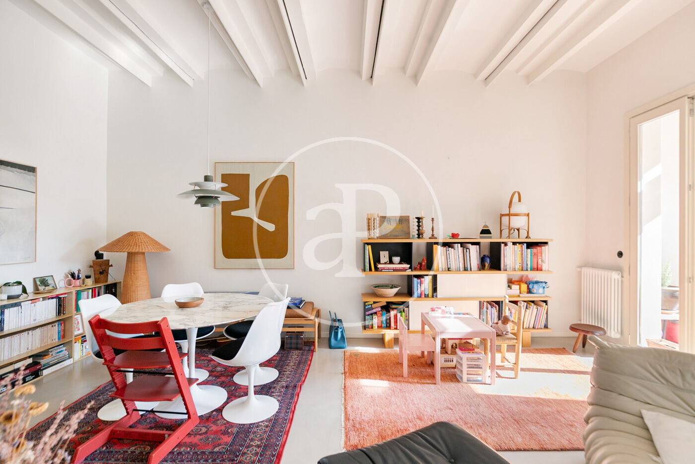 The day area, facing southwest, is flooded with natural light. The large living-dining room, featuring exposed Catalan vaulted ceilings and 3.35-meter-high ceilings, blends historic character with contemporary aesthetics. The semi-open kitchen complements the space without overwhelming it, and the approximately 9 sqm terrace invites quiet breakfasts, sunset readings, and intimate outdoor dinners.