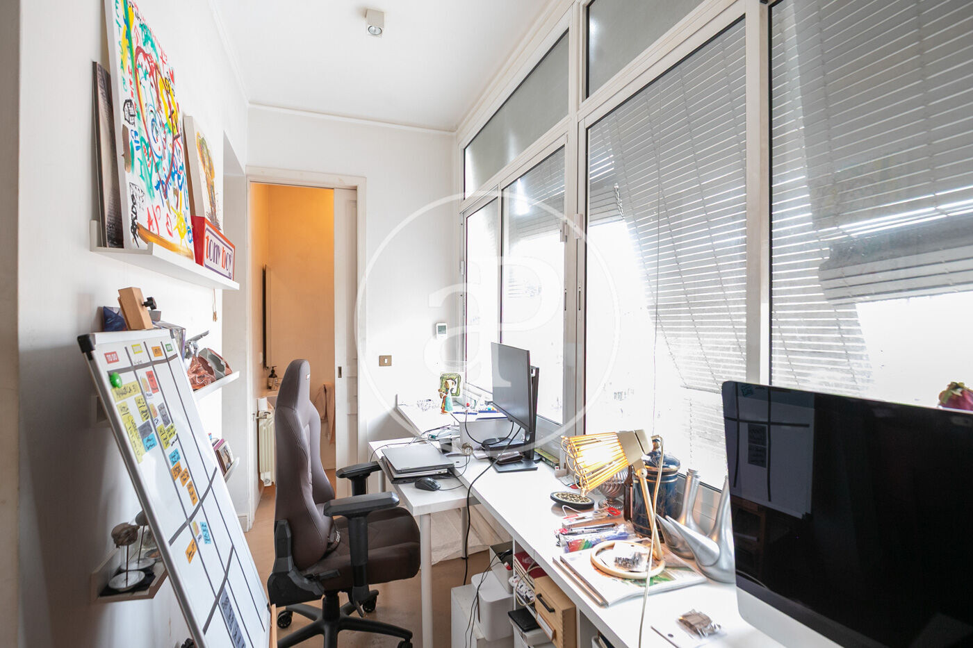 The large living-dining room opens onto a charming gallery facing the quiet inner courtyard. Currently conceived as an office, this area becomes a haven of calm, ideal for working, reading, or simply enjoying the silence and light. A practical guest toilet is also integrated here.