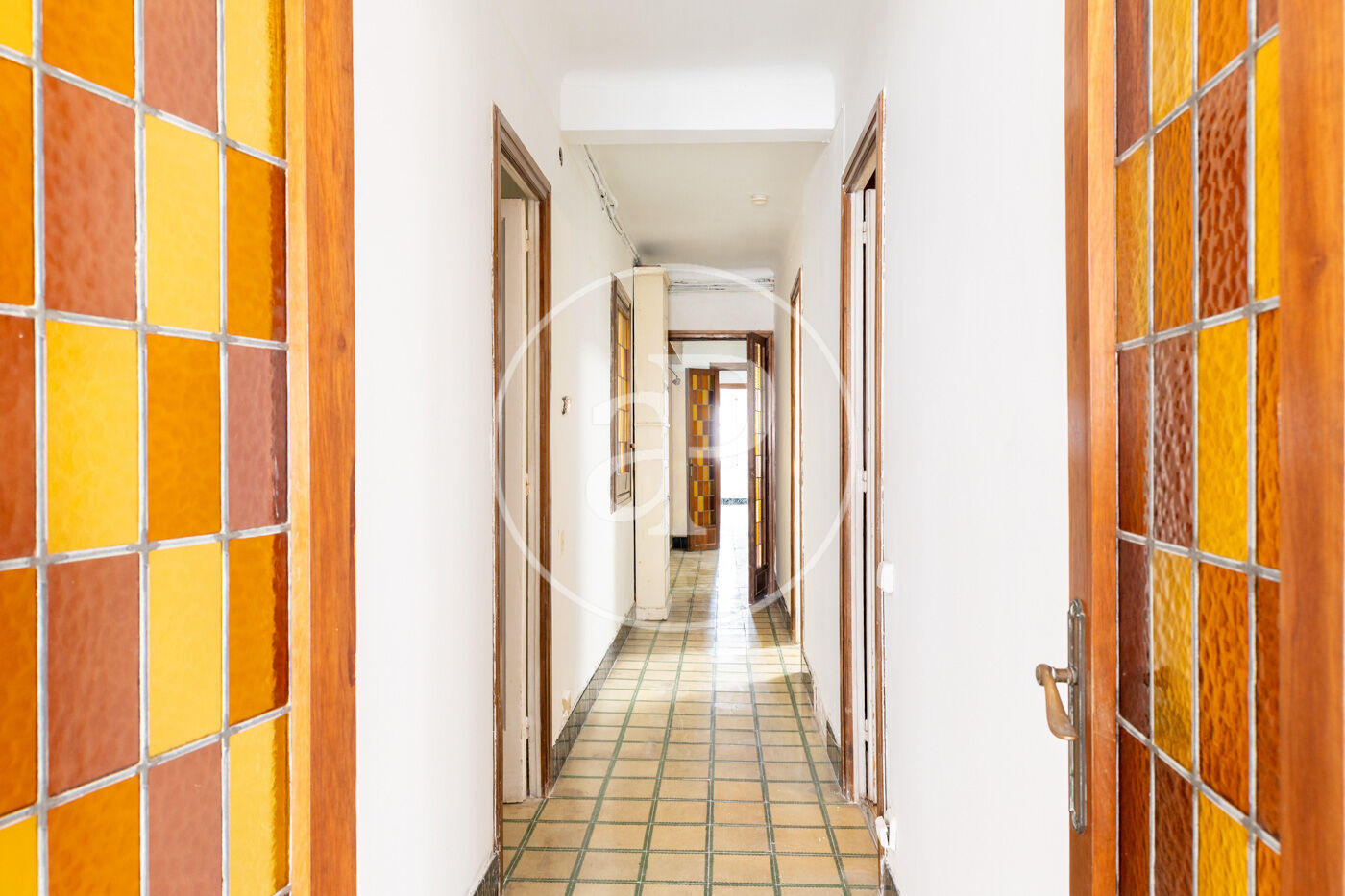 The flat is organised around a central hall leading to the rooms. To the left are a double bedroom, a toilet, a full bathroom and two double bedrooms facing outwards with views of the street. To the right are the kitchen, a double bedroom, a single bedroom and a spacious living-dining room opening onto a south-east facing balcony overlooking an inner courtyard.