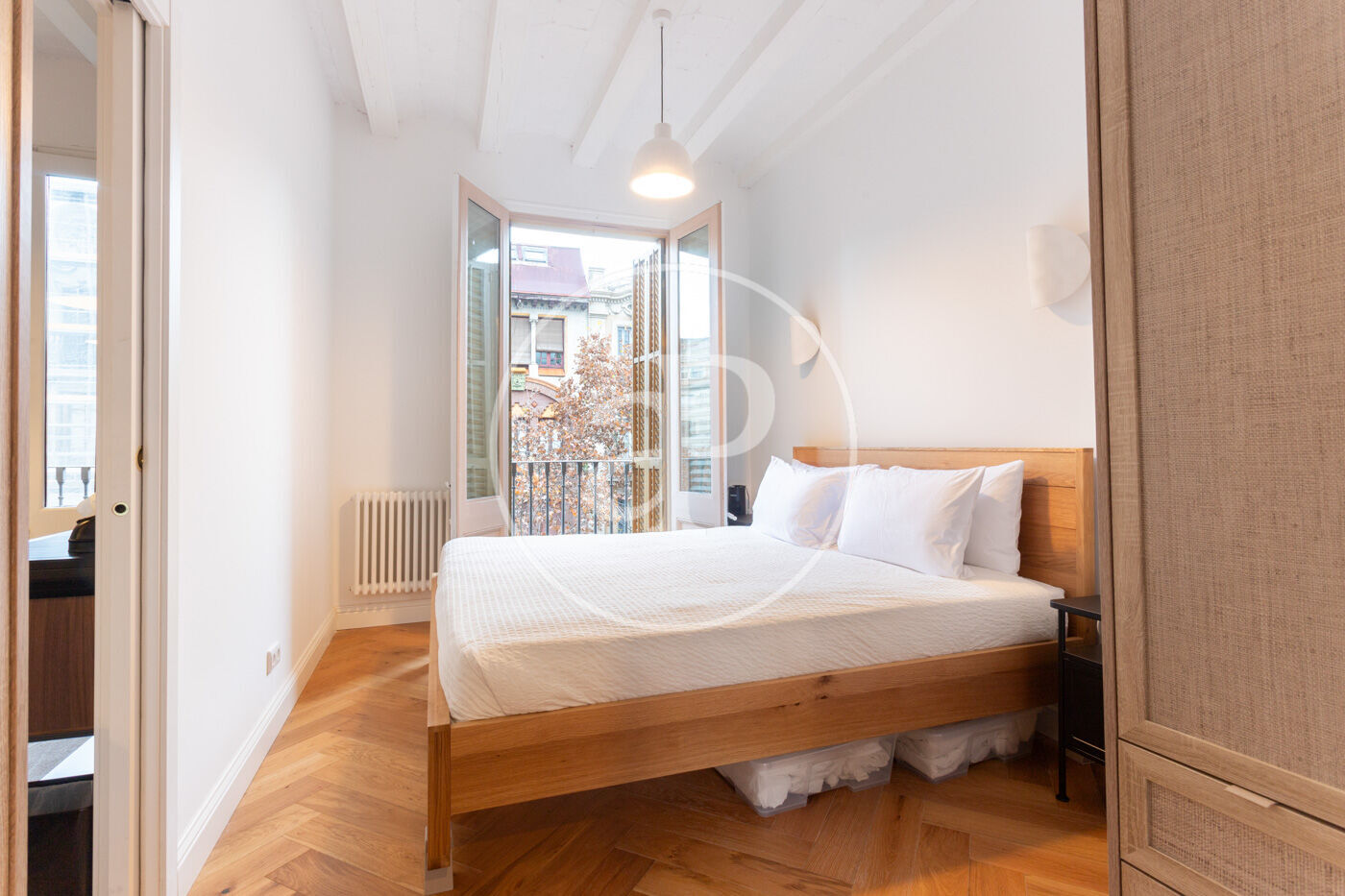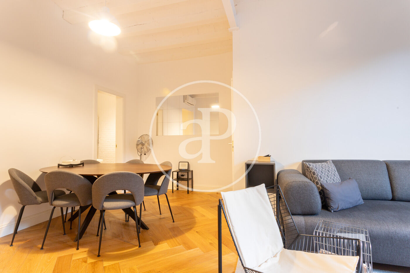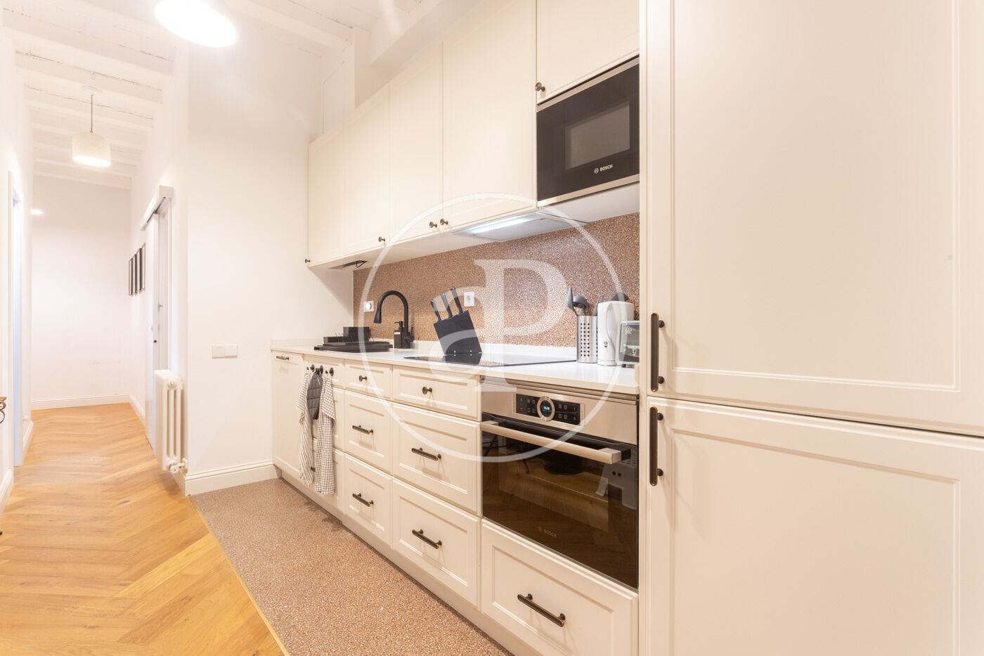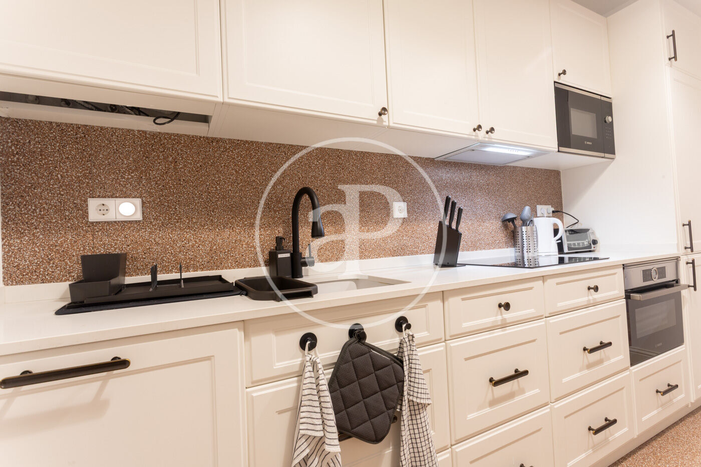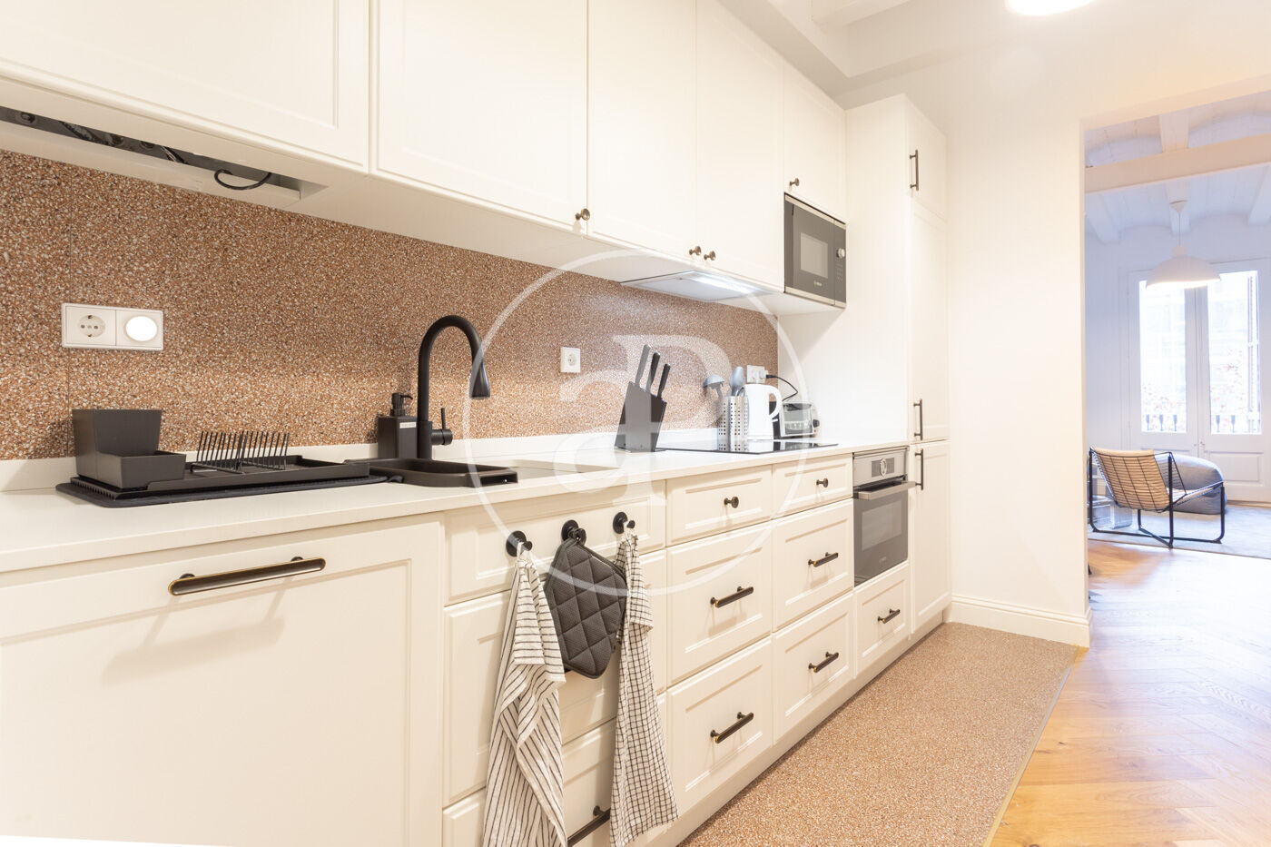 The spacious and bright living-dining room features direct access to a street-facing balcony, providing abundant natural light throughout the day and pleasant views of the characteristic Eixample urban landscape. The modern, fully equipped open-plan kitchen integrates seamlessly into the living area, creating a functional and welcoming space.