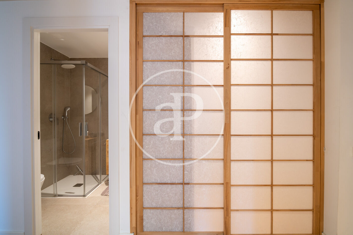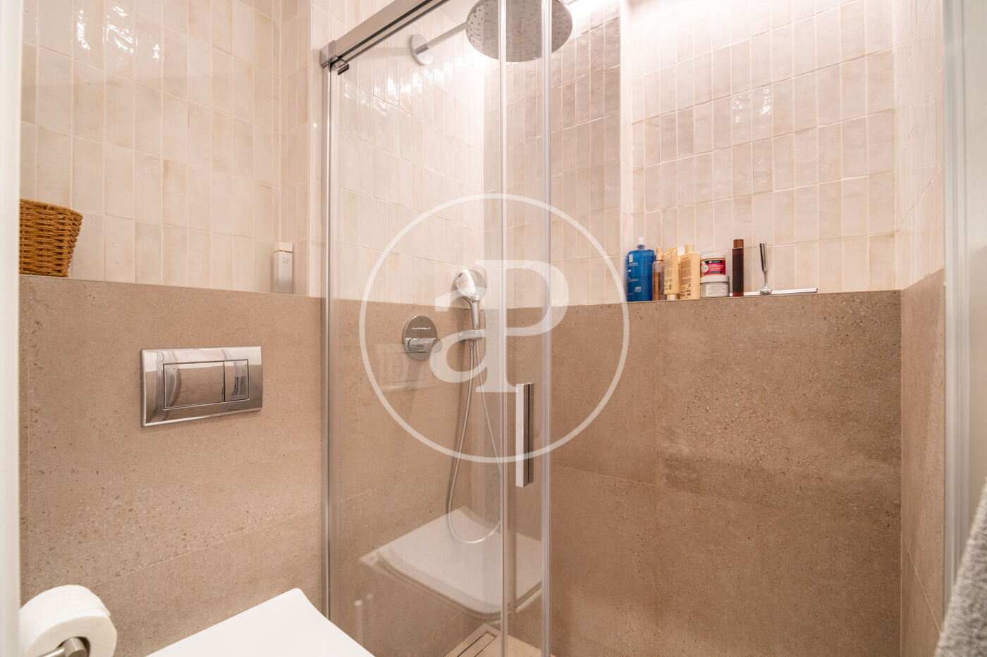 The day area features a spacious living-dining room with an open-plan kitchen, fully equipped and centred around an impressive marble island, perfect for cooking, socialising or enjoying a modern and sophisticated atmosphere. From the living room there is access to a highly enjoyable balcony, ideal for relaxing, having a coffee or observing Barcelona’s urban life.