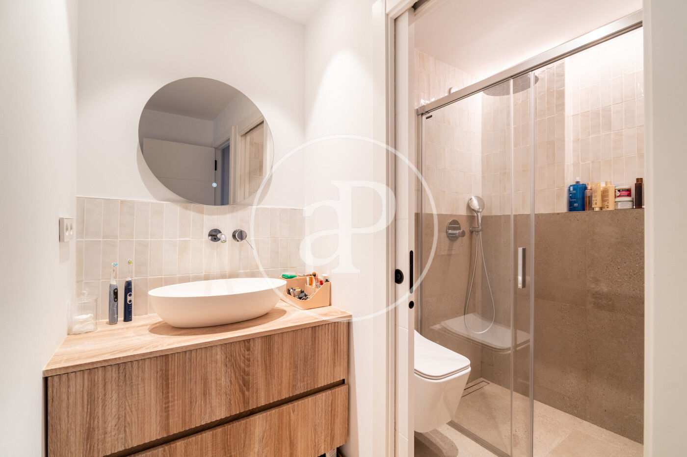 A few minutes on foot from la Barceloneta beach, in the center of the most dynamic neighborhood in the city, we find this 77m2 built apartment, located in the most popular square in La Barceloneta where also the market is located, on the fourth real floor of a restored 1948 building with an elevator. The property is totally exterior, very bright, facing NE and completely renovated. The building has a roof terrace for community use. We enter the apartment and we find the hall with 3 built-in wardrobes. On the left-hand side we find an open kitchen and a spacious and bright living-dining room with views of the most popular square in La Barceloneta. On the right-hand side we find two bright rooms, one double room with a walk in closet, one single room and 2 fully equipped bathrooms. The apartment is delivered equipped with the following kitchen appliances: fridge-freezer, dishwasher, washing machine, induction cooker, microwave combi oven, extractor hood and hot water heater. The windows of the apartment are made of aluminium with double glazing. Air conditioning and heating through splits. Porcelain parquet floor. The apartment is ready to move in almost immediately and furniture can be taken over. A unique piece in one of the most popular neighborhoods of the city, ready to move in, very well connected with public transports and surrounded by shops and restaurants. Ideal for investors or couples who want to have a pied-à-terre a few meters from the beach in Barcelona.