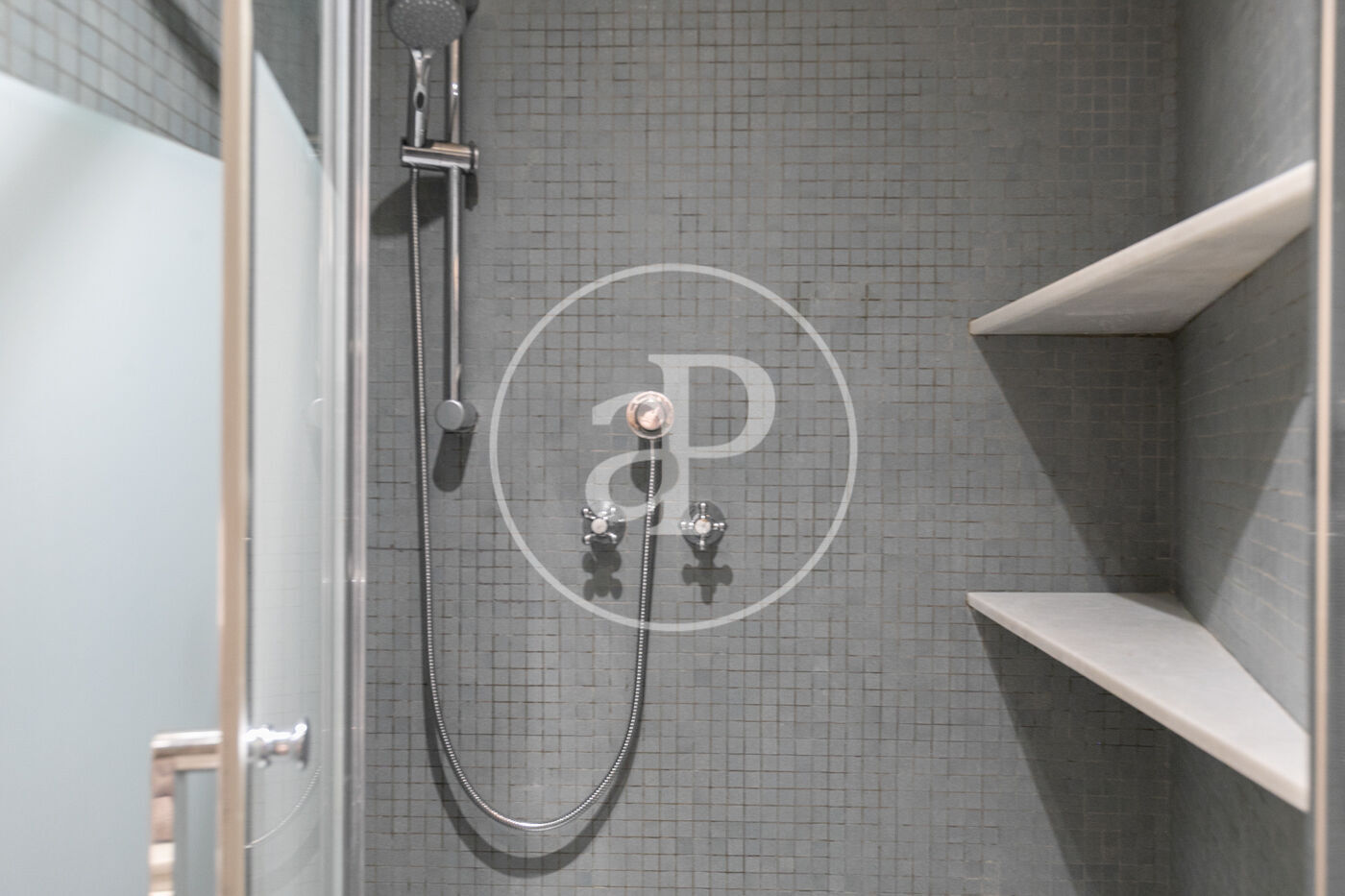 In the day area, there is a spacious living-dining room with a work area that has been converted into an additional separate bedroom, which opens onto a bright and generous gallery overlooking a large, open inner courtyard. The kitchen is open to the living room and fully equipped with all necessary appliances.