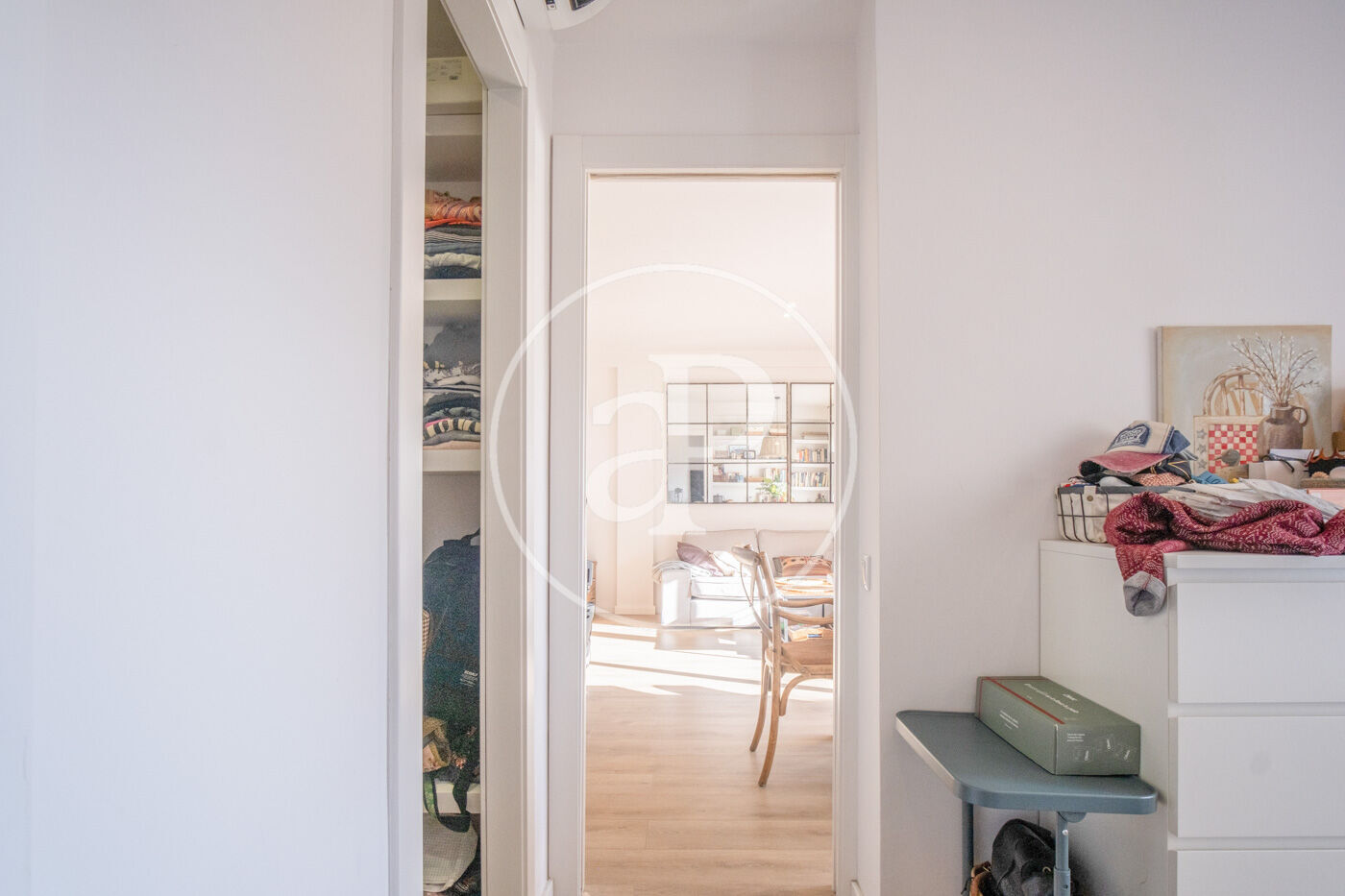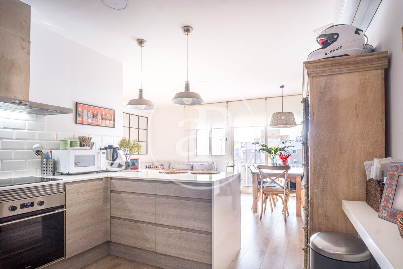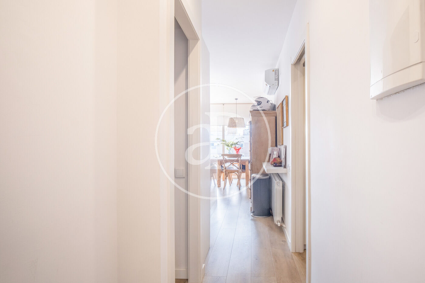 Accessing to the right we find a single room with built-in closet, if we continue straight ahead the living-dining room with open kitchen and large windows overlooking the large patio typical of the Eixample, we continue to the right and we find a bedroom suite with dressing room and a full bathroom.