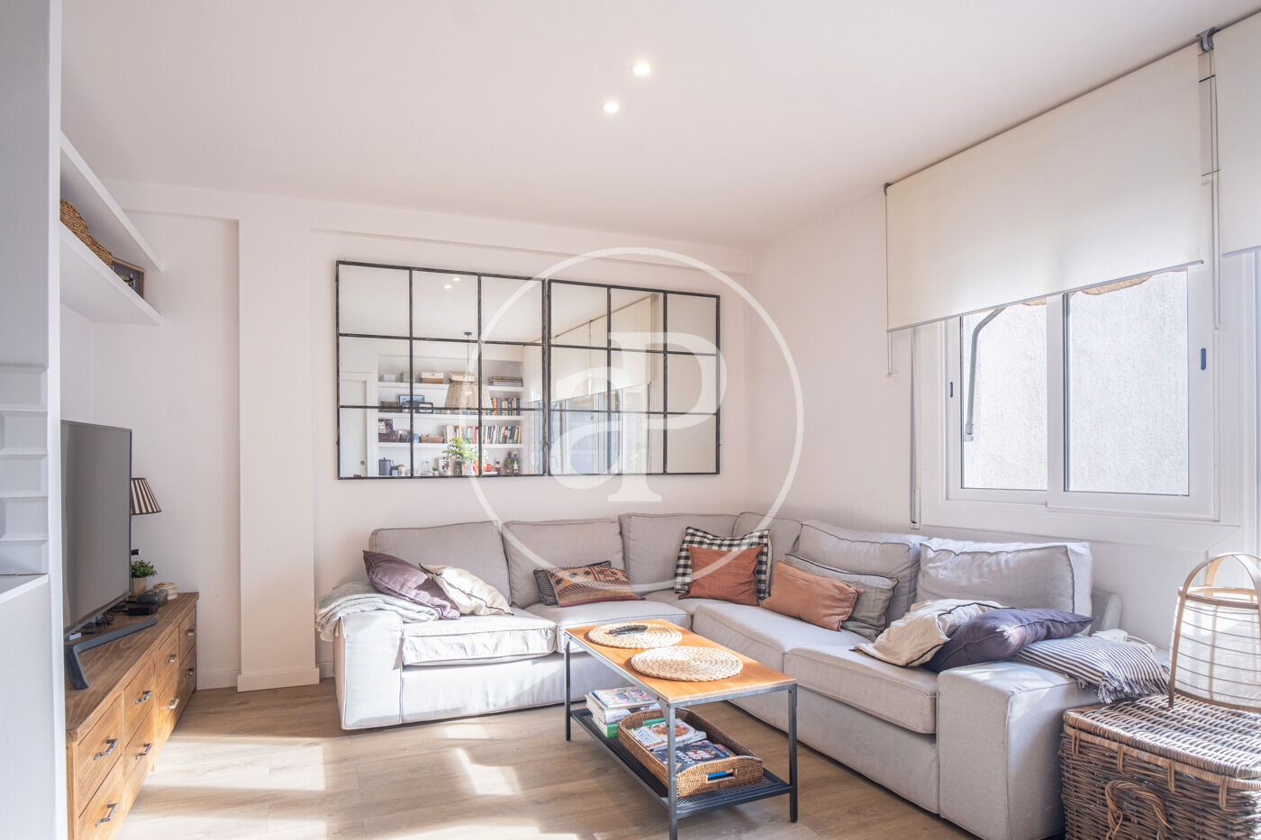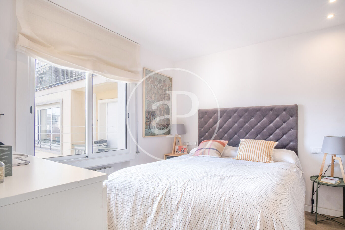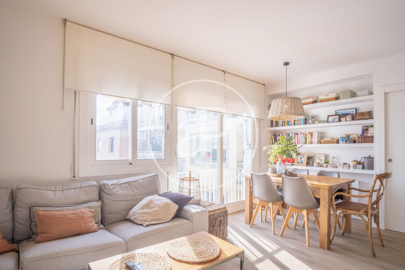 Accessing to the right we find a single room with built-in closet, if we continue straight ahead the living-dining room with open kitchen and large windows overlooking the large patio typical of the Eixample, we continue to the right and we find a bedroom suite with dressing room and a full bathroom.