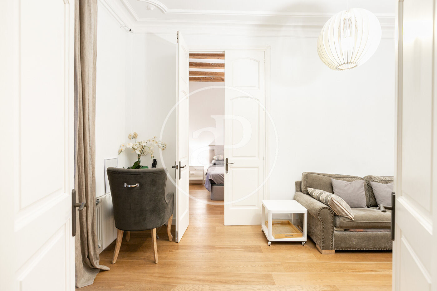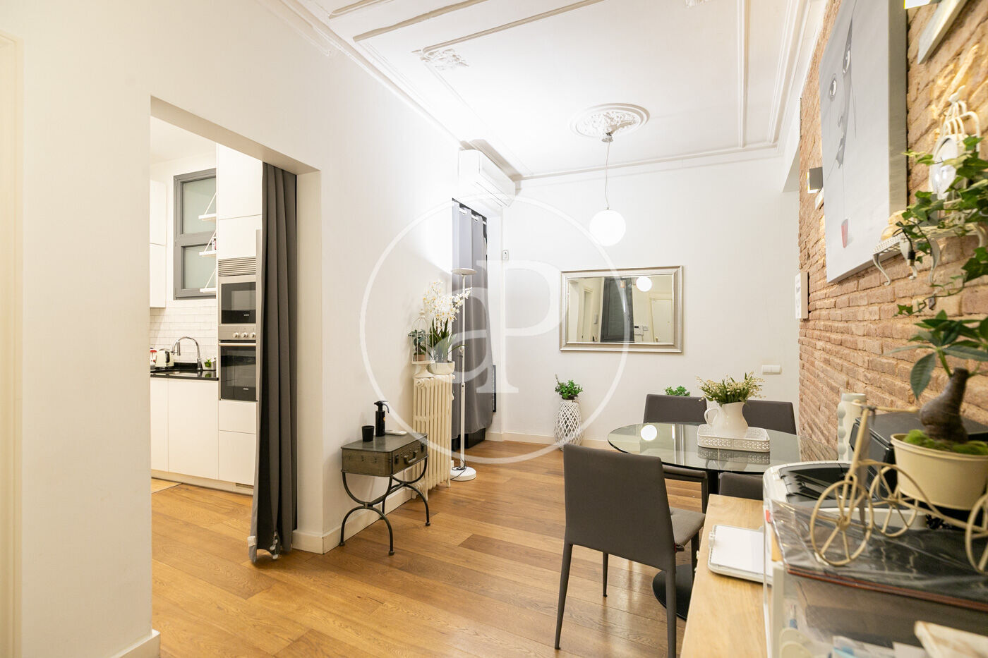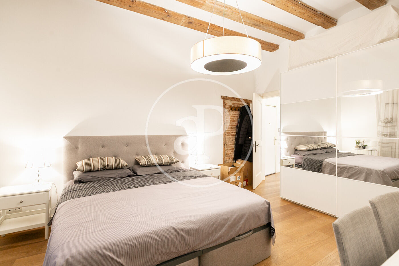 In the heart of the Gothic Quarter, one of Barcelona's most emblematic and sought-after areas, this exclusive apartment is presented, combining history and modernity in an incomparable setting. Surrounded by centuries-old streets, lively squares, and a unique cultural and gastronomic offering, this home is an opportunity to experience the city's authentic essence in one of its most inspiring corners. Located on a high floor of a renovated building, without an elevator, this apartment has been completely refurbished with an architectural project that enhances light and spaciousness. It features a separate bedroom, an open-plan space that integrates the living room, entrance hall, and kitchen, and preserves original elements such as woodwork, exposed beams, and hydraulic mosaics, which blend harmoniously with contemporary, sober, and sophisticated finishes. The home is delivered fully furnished and equipped with high-end appliances, ready to move into from day one, with no need to add anything else. Thanks to its double orientation and the presence of two interior patios, the apartment enjoys an enveloping natural light and a peaceful atmosphere amid the dynamism of the historic center. Its contemporary design, with custom-made furniture and recessed lighting, makes it a comfortable and elegant home, perfect for both living and entertaining. The location is unbeatable: on a quiet street in the Gothic Quarter, just a few steps from iconic places and with excellent connections to the rest of the city, whether on foot, by bike, or via public transport. A unique opportunity to live in Barcelona with character, design, and quality in every detail.
