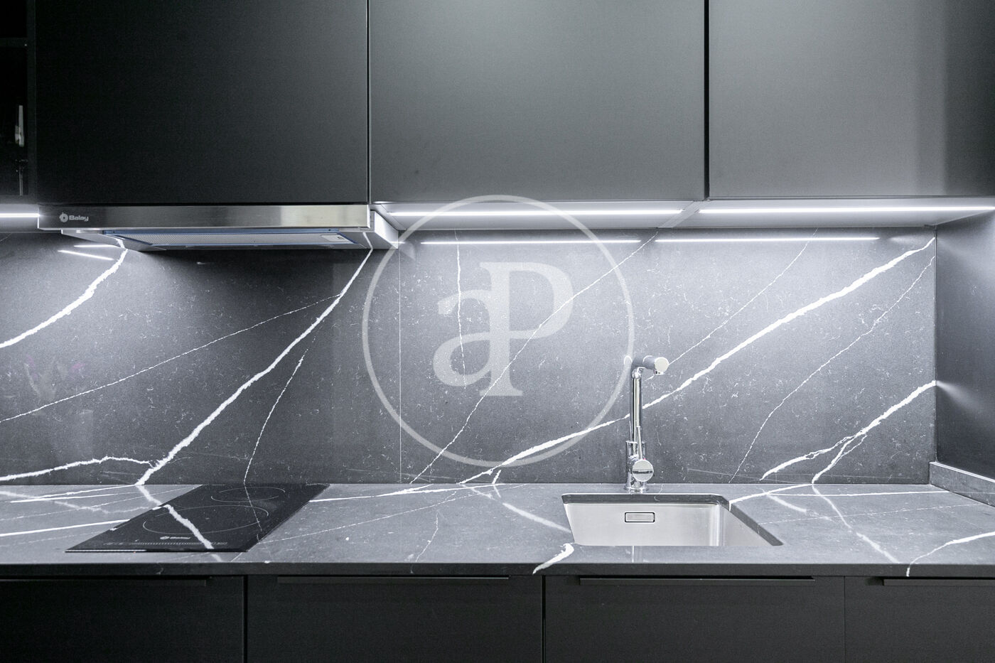 The day area consists of a living-dining room and an open-plan kitchen, fully equipped with high-end appliances and access to the balcony.