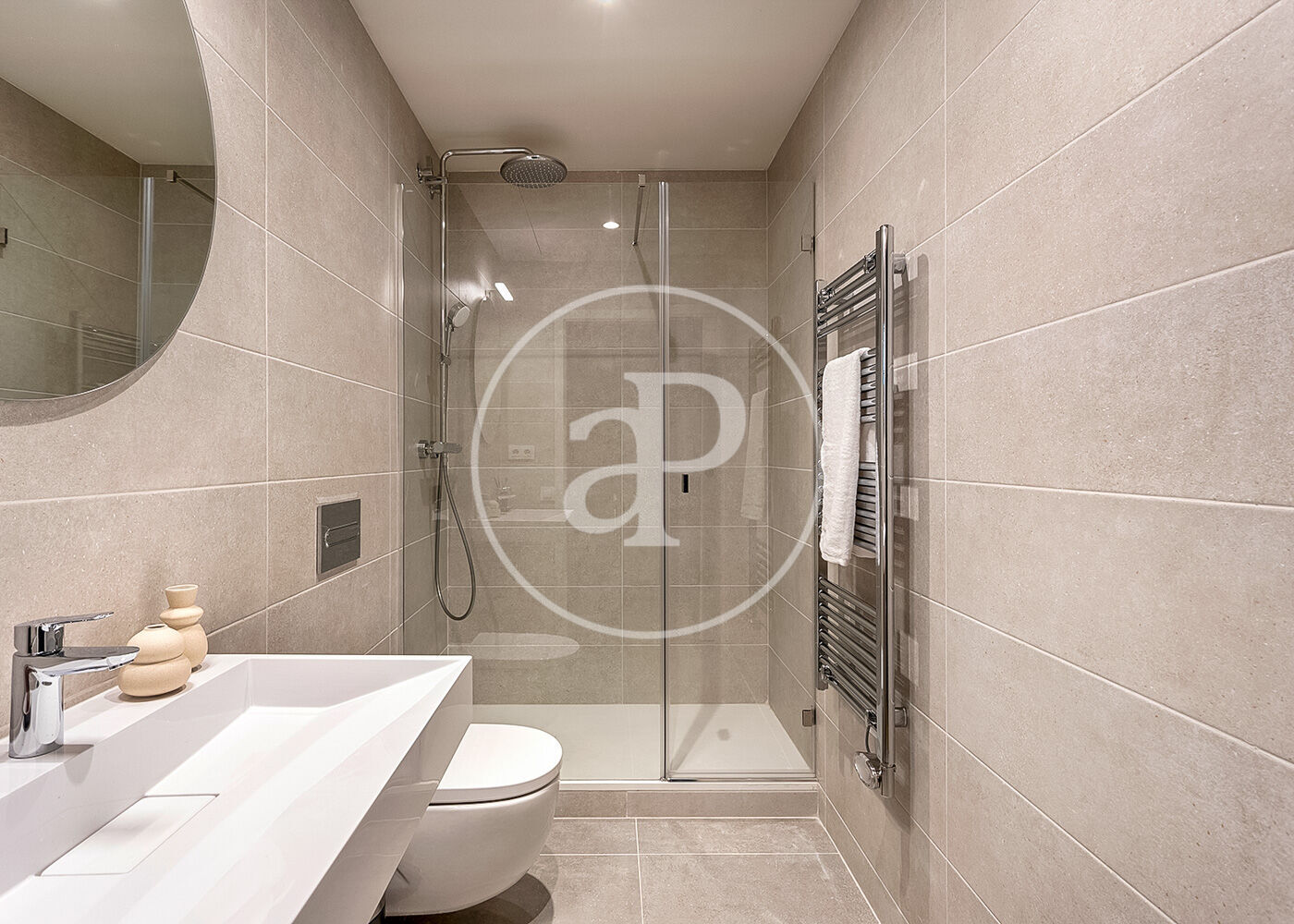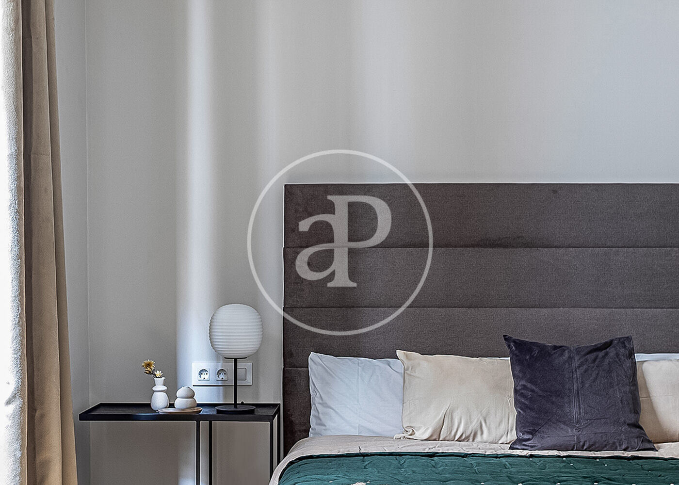This modern and cozy 54 m² apartment in Barcelona’s Gothic Quarter stands out for its elegant color palette and excellent location. Upon entering, you are welcomed by a bright living-dining room with a comfortable sofa and a dining area next to a large window with wooden frames. The open-plan kitchen, fully equipped with high-end appliances, integrates seamlessly into the space.