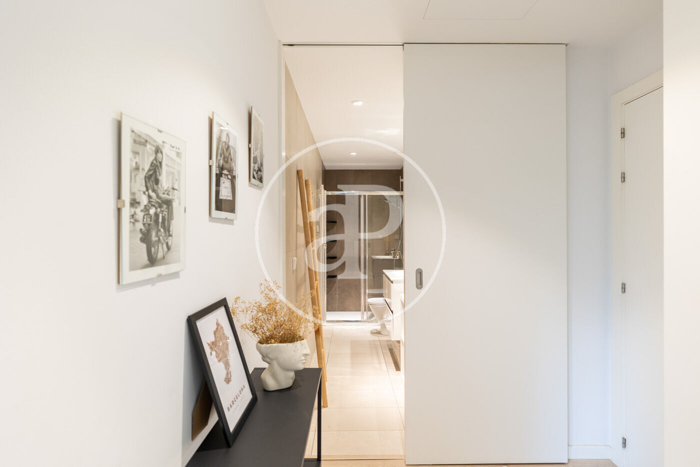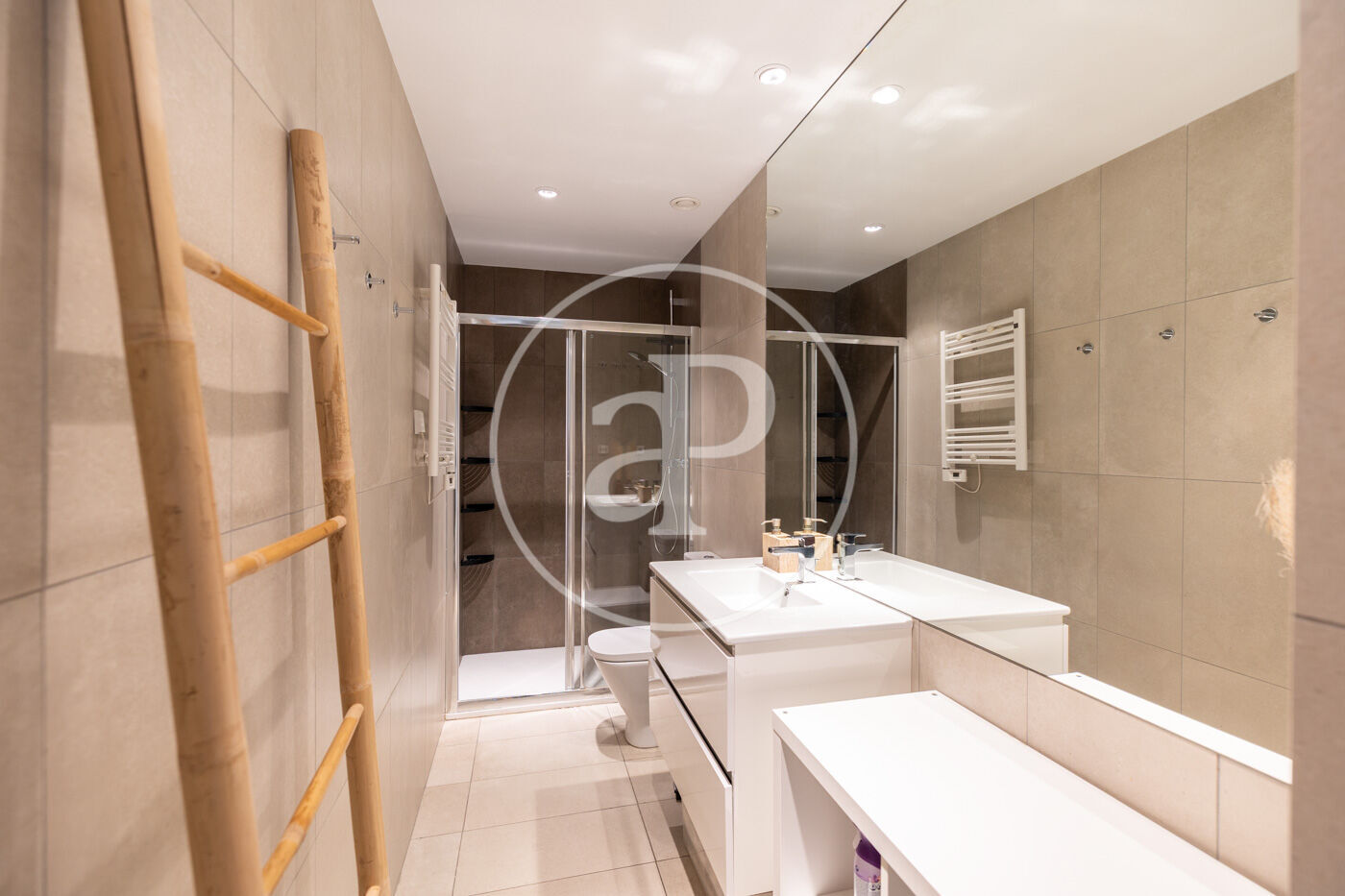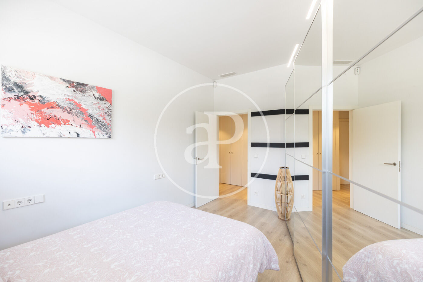 The sleeping area includes a large and very bright bedroom with a walk-in wardrobe and built-in closets, as well as a contemporary bathroom with a spacious shower and high-quality finishes.