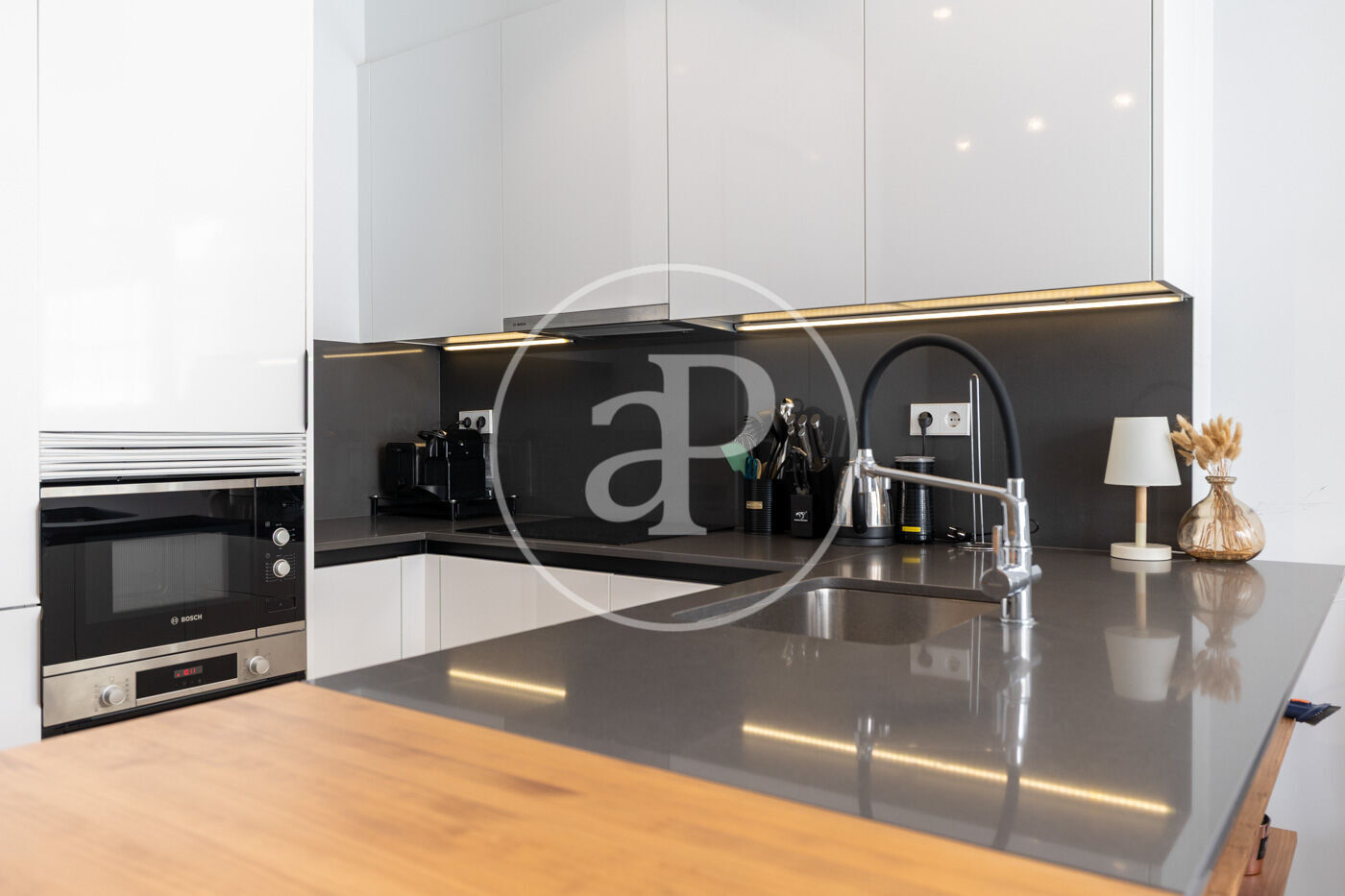 The kitchen, modern and functional, is equipped with high-end Bosch appliances (oven, microwave, dishwasher, fridge-freezer, and induction hob) and offers ample storage capacity thanks to its quartz countertop cabinetry.