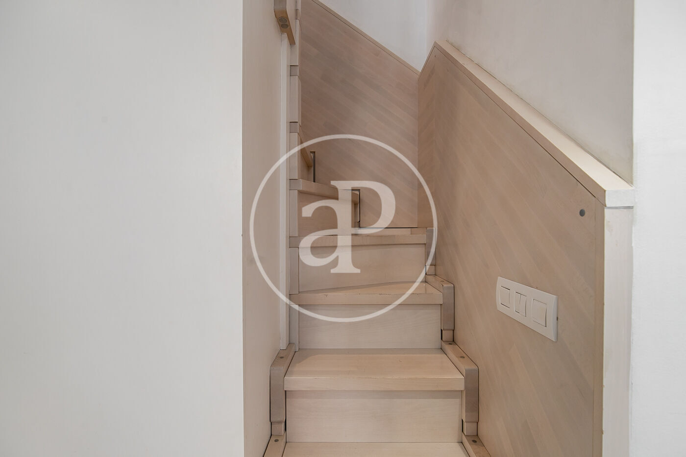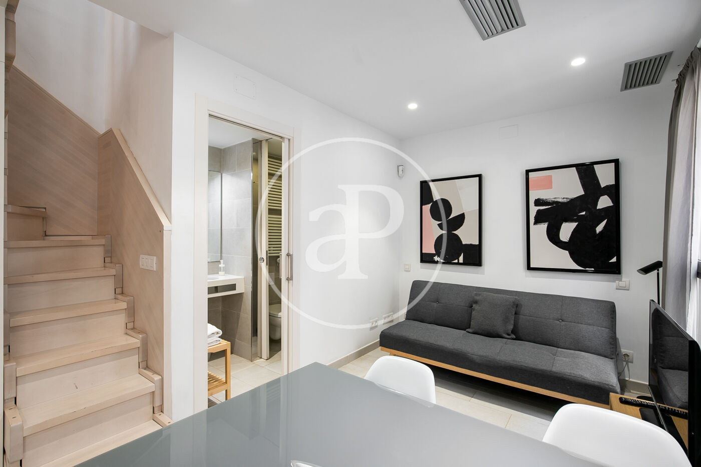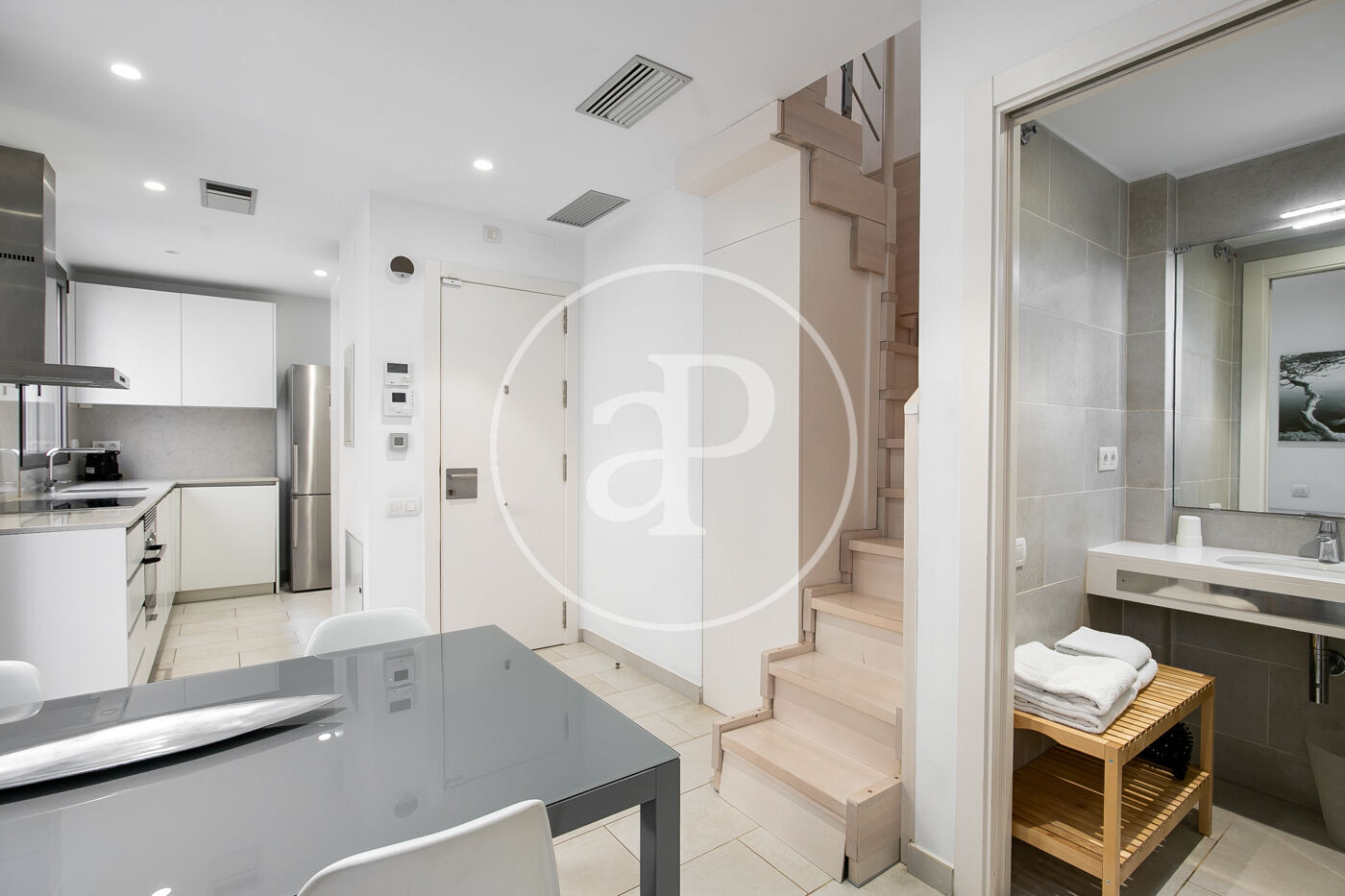 This duplex can be accessed via elevator either on the first or second floor. On the first level is the day area, which includes a living–dining room with an integrated, fully equipped kitchen. There is also a full bathroom.