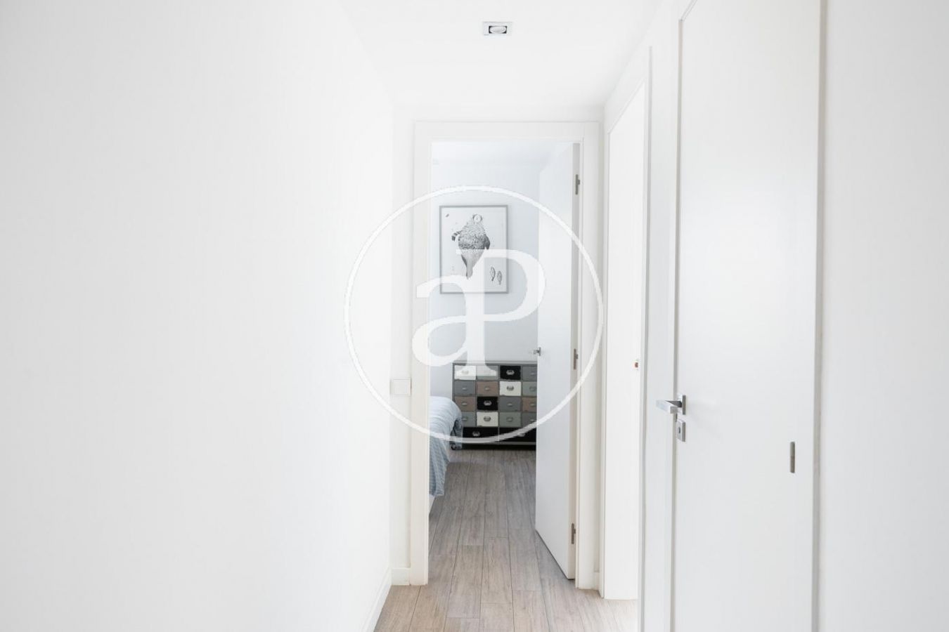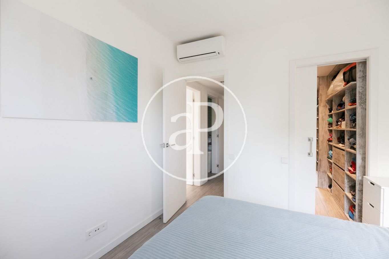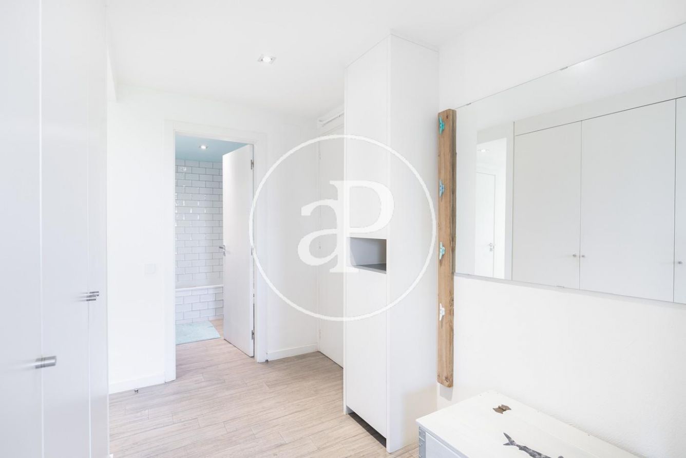 On the right-hand side we find two bright rooms, one double room with a walk in closet, one single room and 2 fully equipped bathrooms. The apartment is delivered equipped with the following kitchen appliances: fridge-freezer, dishwasher, washing machine, induction cooker, microwave combi oven, extractor hood and hot water heater. The windows of the apartment are made of aluminium with double glazing. Air conditioning and heating through splits. Porcelain parquet floor.