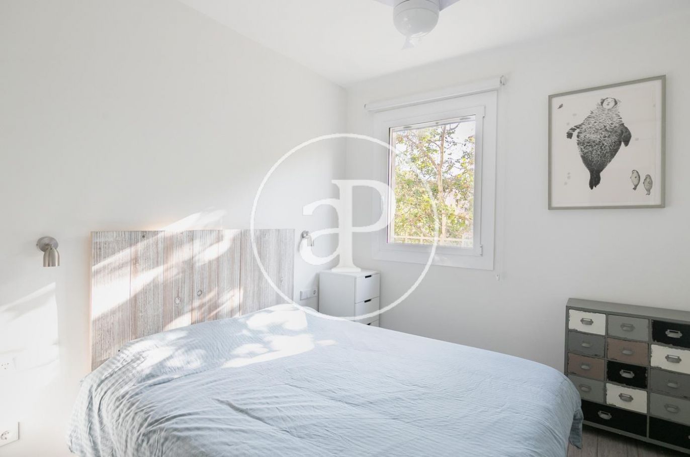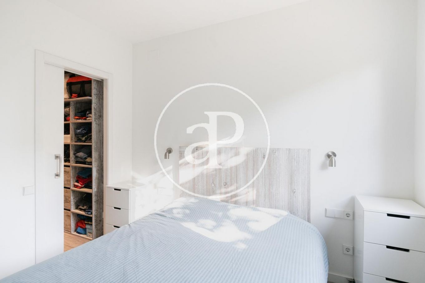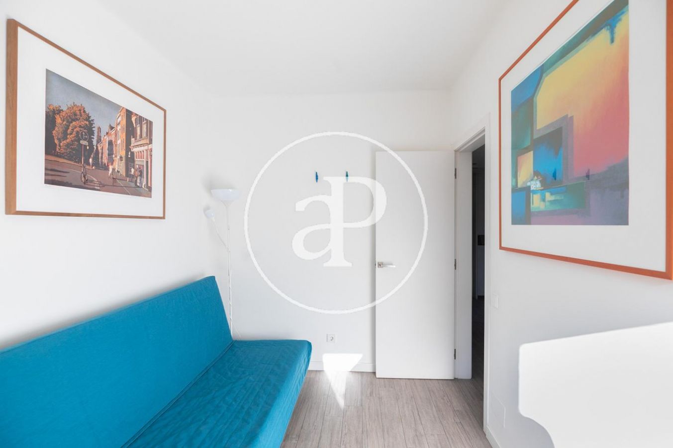 On the right-hand side we find two bright rooms, one double room with a walk in closet, one single room and 2 fully equipped bathrooms. The apartment is delivered equipped with the following kitchen appliances: fridge-freezer, dishwasher, washing machine, induction cooker, microwave combi oven, extractor hood and hot water heater. The windows of the apartment are made of aluminium with double glazing. Air conditioning and heating through splits. Porcelain parquet floor.