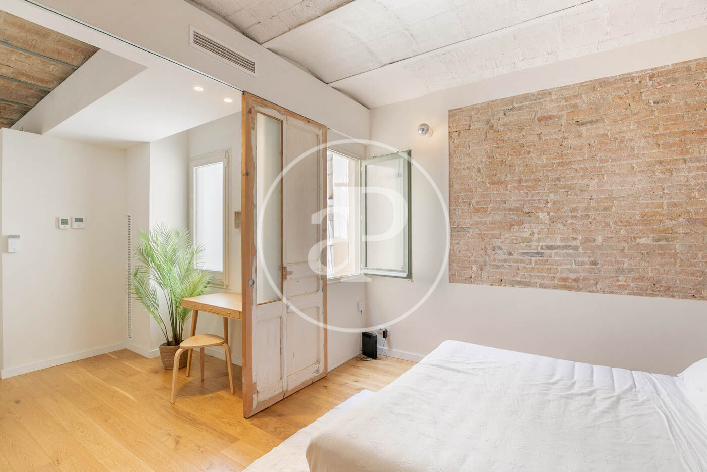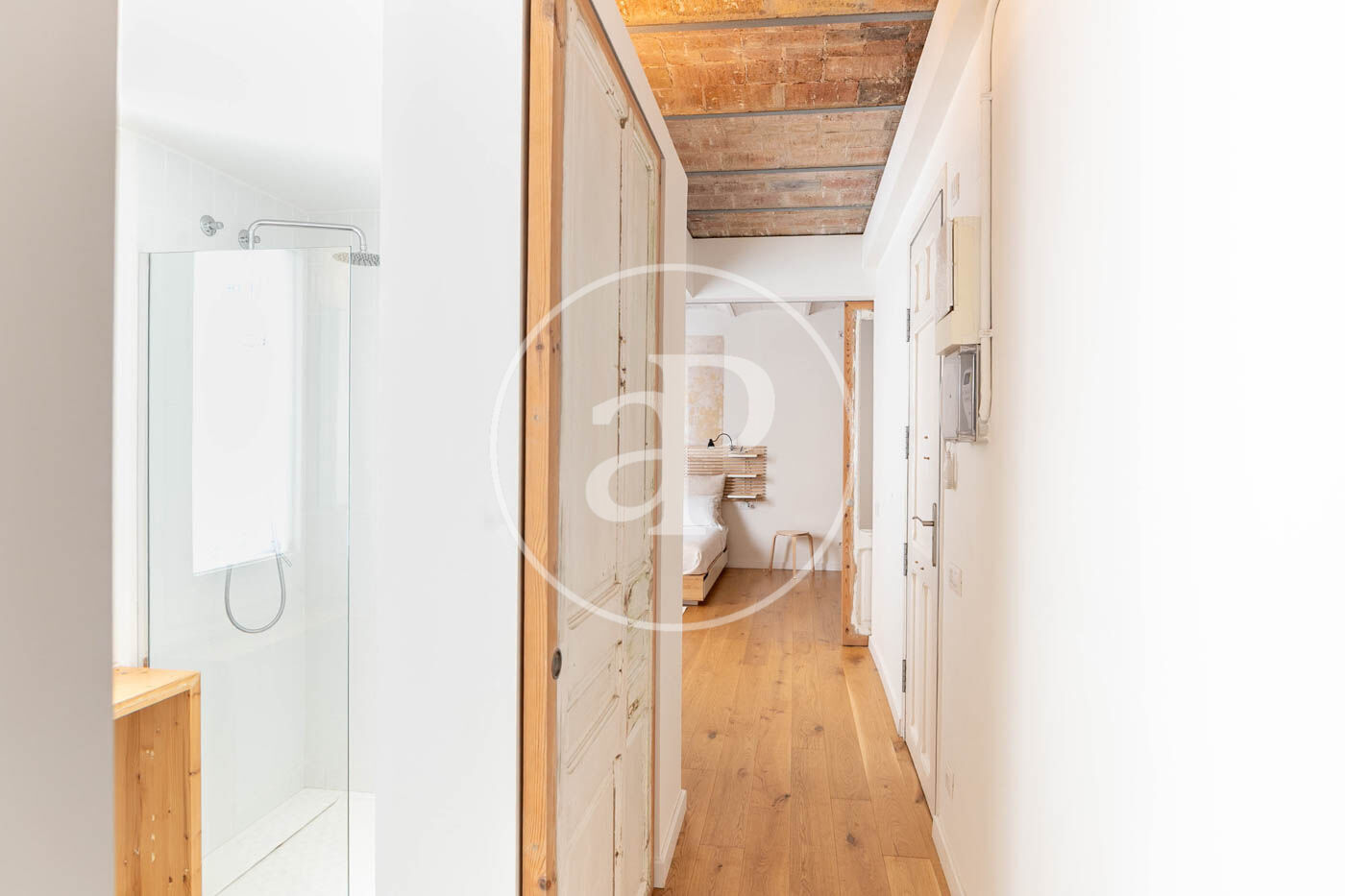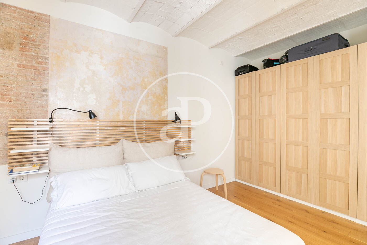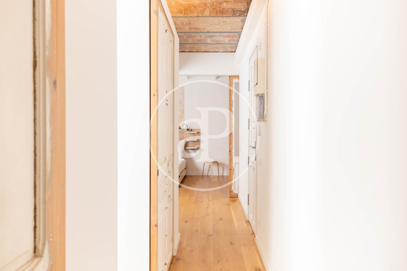 The day area includes a cozy living-dining room with direct access to a balcony, ideal for enjoying the outdoors. The kitchen is open-plan, modern, and fully equipped—perfect for food lovers and fans of functional design. The original Catalan vaulted ceilings add character and authenticity to the space.