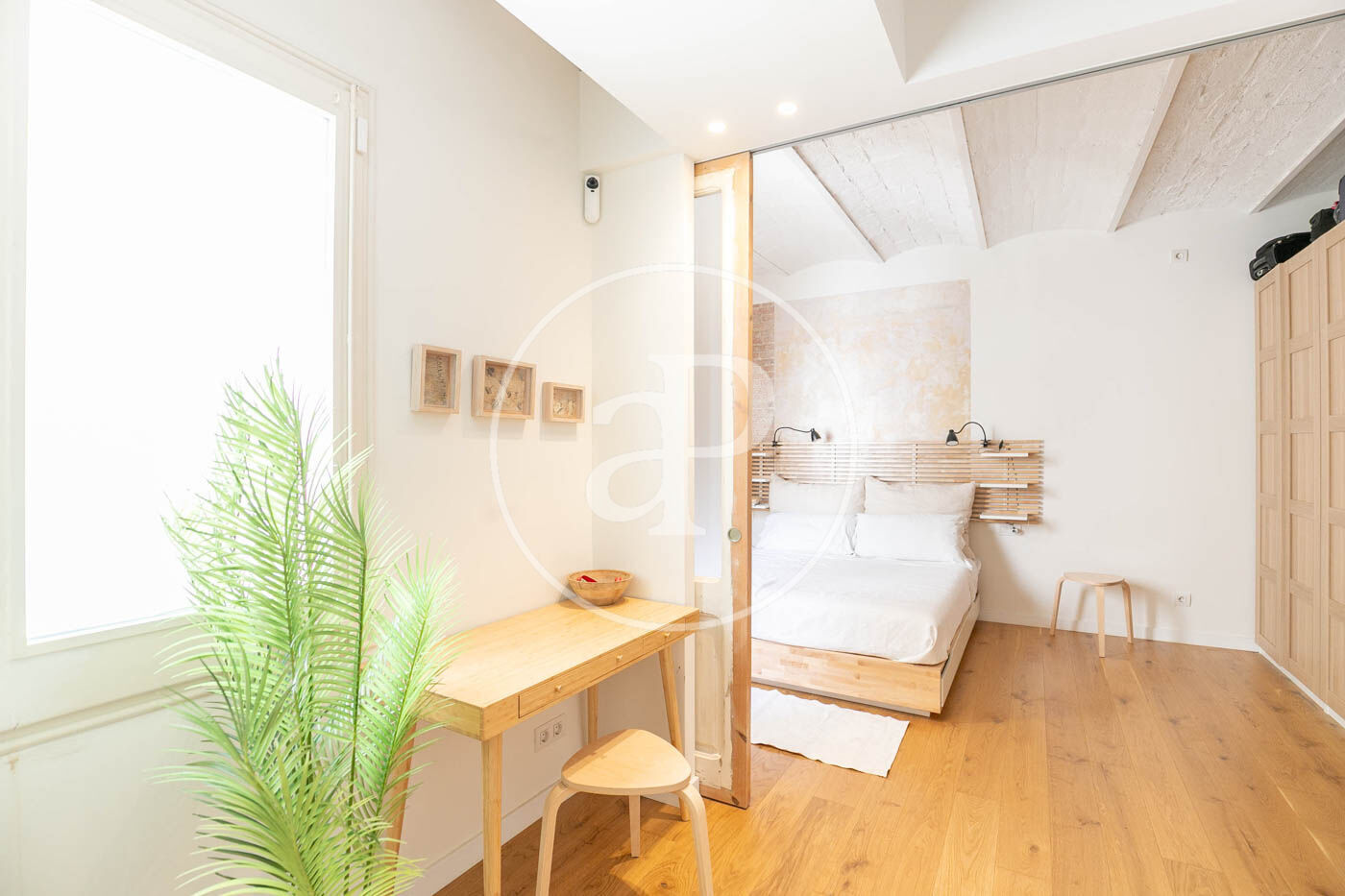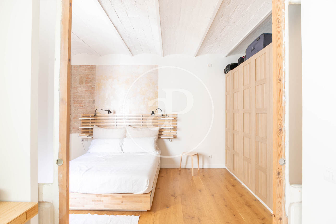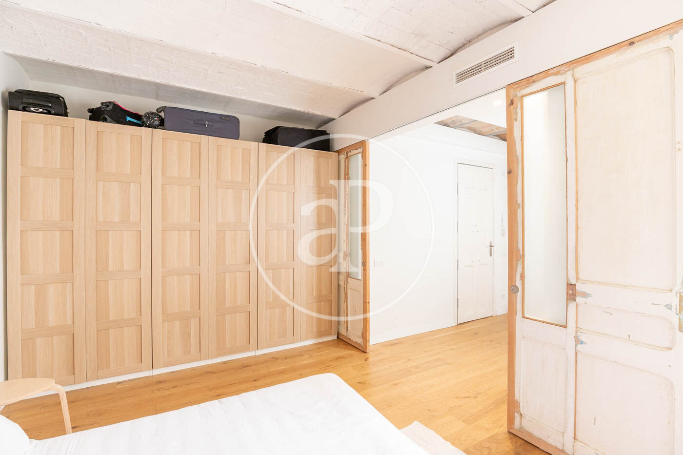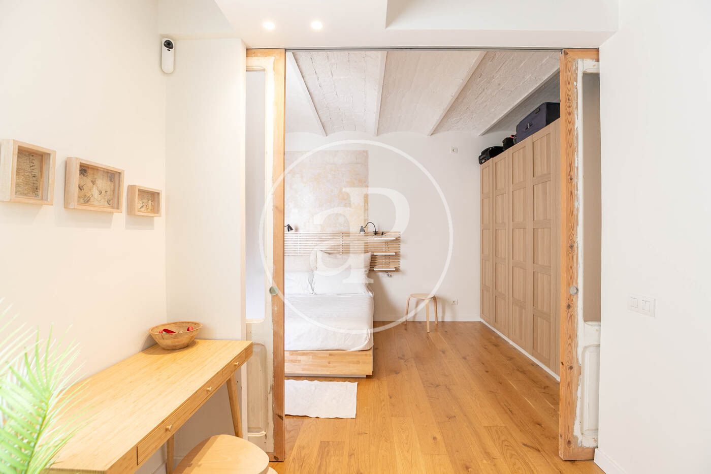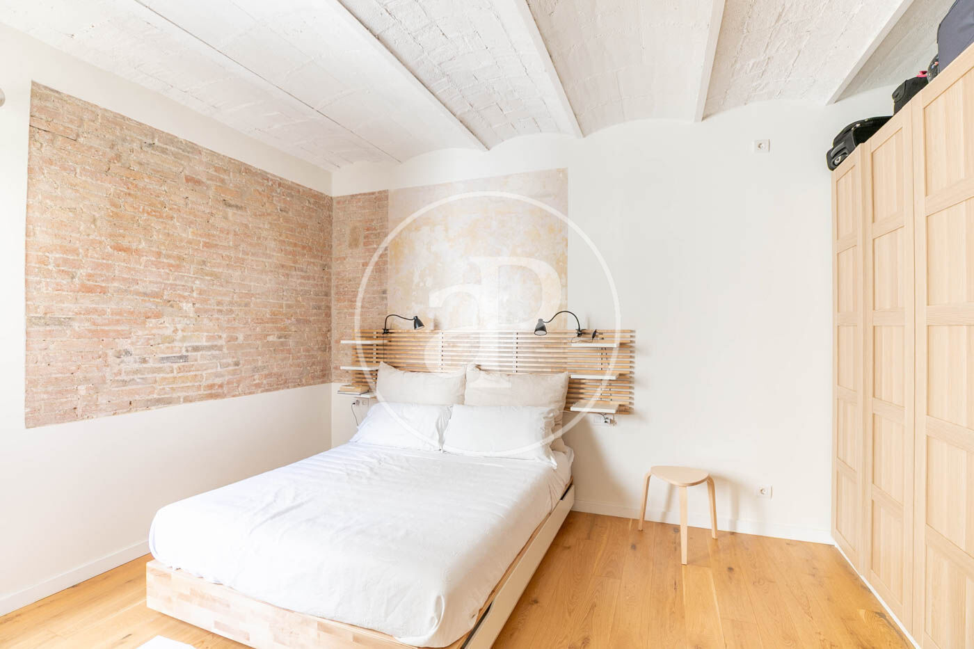 The day area includes a cozy living-dining room with direct access to a balcony, ideal for enjoying the outdoors. The kitchen is open-plan, modern, and fully equipped—perfect for food lovers and fans of functional design. The original Catalan vaulted ceilings add character and authenticity to the space.
