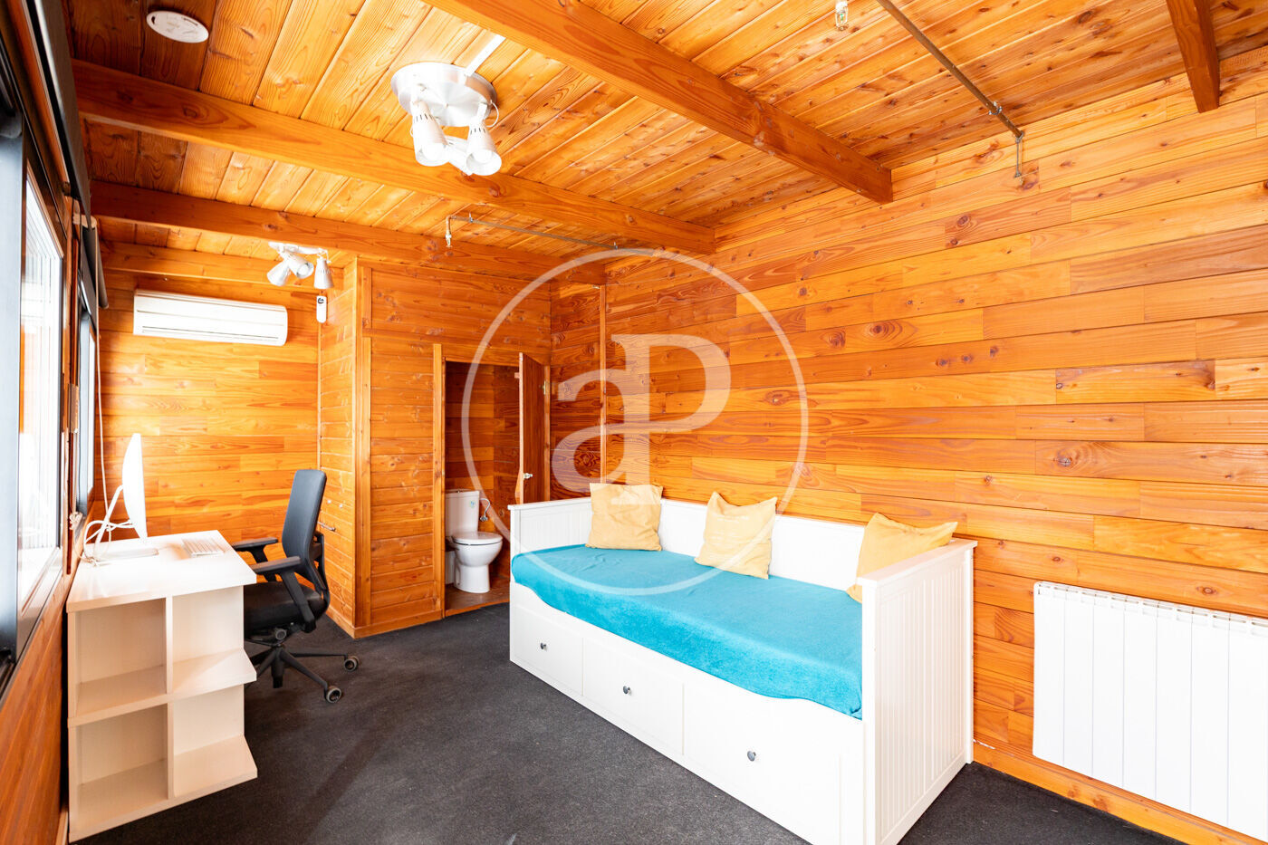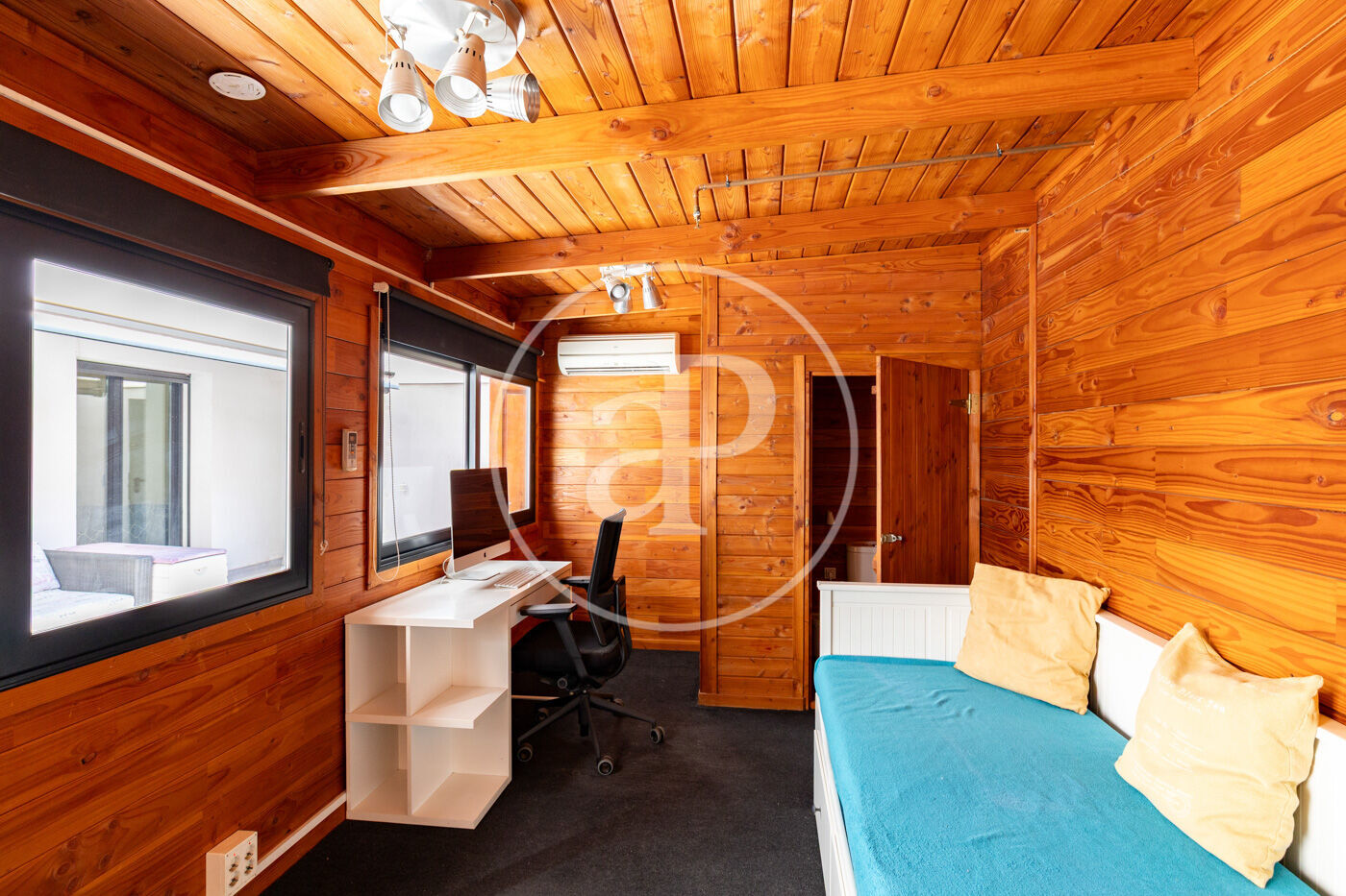 The living room has direct access to the magnificent terrace, an ideal space to relax, dine, or entertain outdoors. Additionally, the property includes a practical independent 25 sqm structure, equipped with a WC, air conditioning, and a laundry/storage area—perfect as a home office, playroom, or guest room.