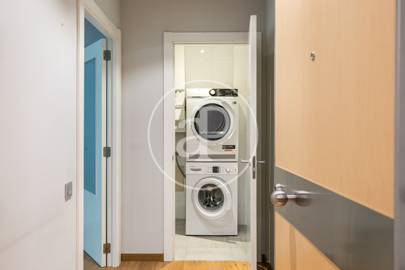 Fully equipped independent kitchen, ideal for cooking lovers, with storage space and a separate laundry area with washing machine and dryer.