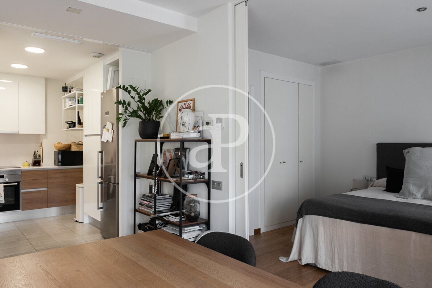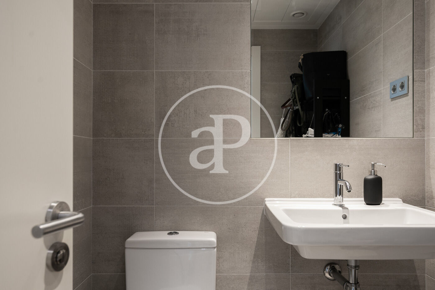 Bright living room with direct access to the terrace, guest bathroom between the entrance and the living area, fully equipped open-plan kitchen, and a spacious en-suite bedroom with a full bathroom.